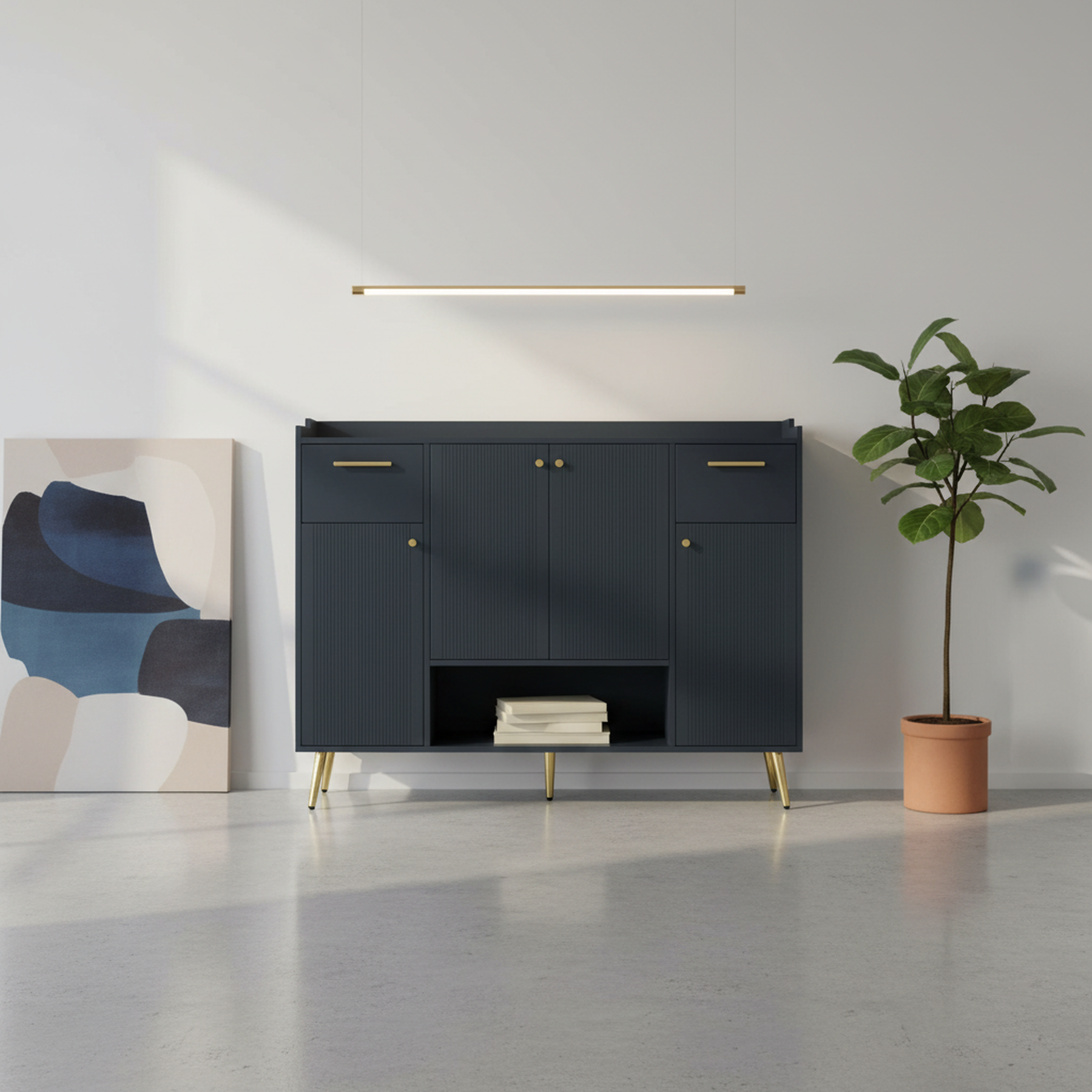 Optimisez l'organisation de votre entrée ou de votre chambre avec ce meuble de rangement moderne et élégant. Sa structure intelligente offre une solution complète pour la gestion des chaussures et accessoires : deux tiroirs pour les petits objets, quatre portes d'armoire pour un rangement dissimulé des chaussures, et une niche ouverte idéale pour les sacs ou la décoration. Monté sur cinq pieds hauts et raffinés (couleur dorée sur la photo), il confère un look aérien et contemporain à votre espace tout en rendant le nettoyage sous le meuble étonnamment simple. C'est l'équilibre parfait entre forme, fonction et durabilité.