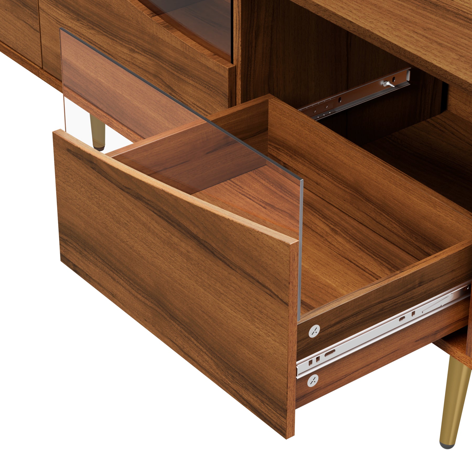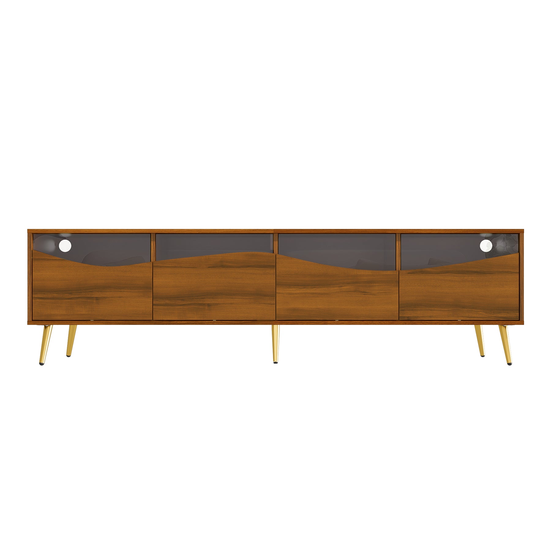 Meuble TV rétro effet bois noyer avec éclairage LED pieds métalliques dorés PROKARYOT