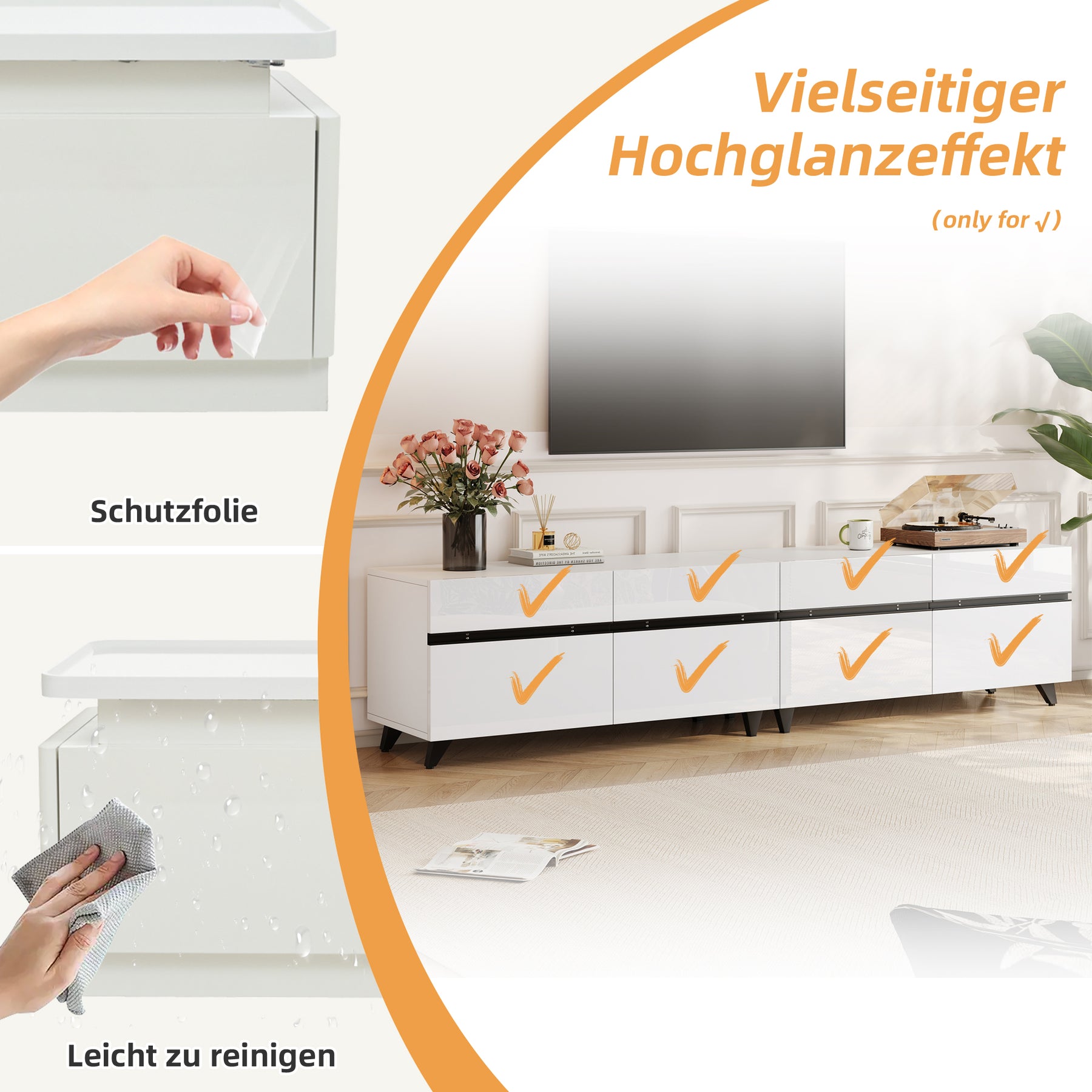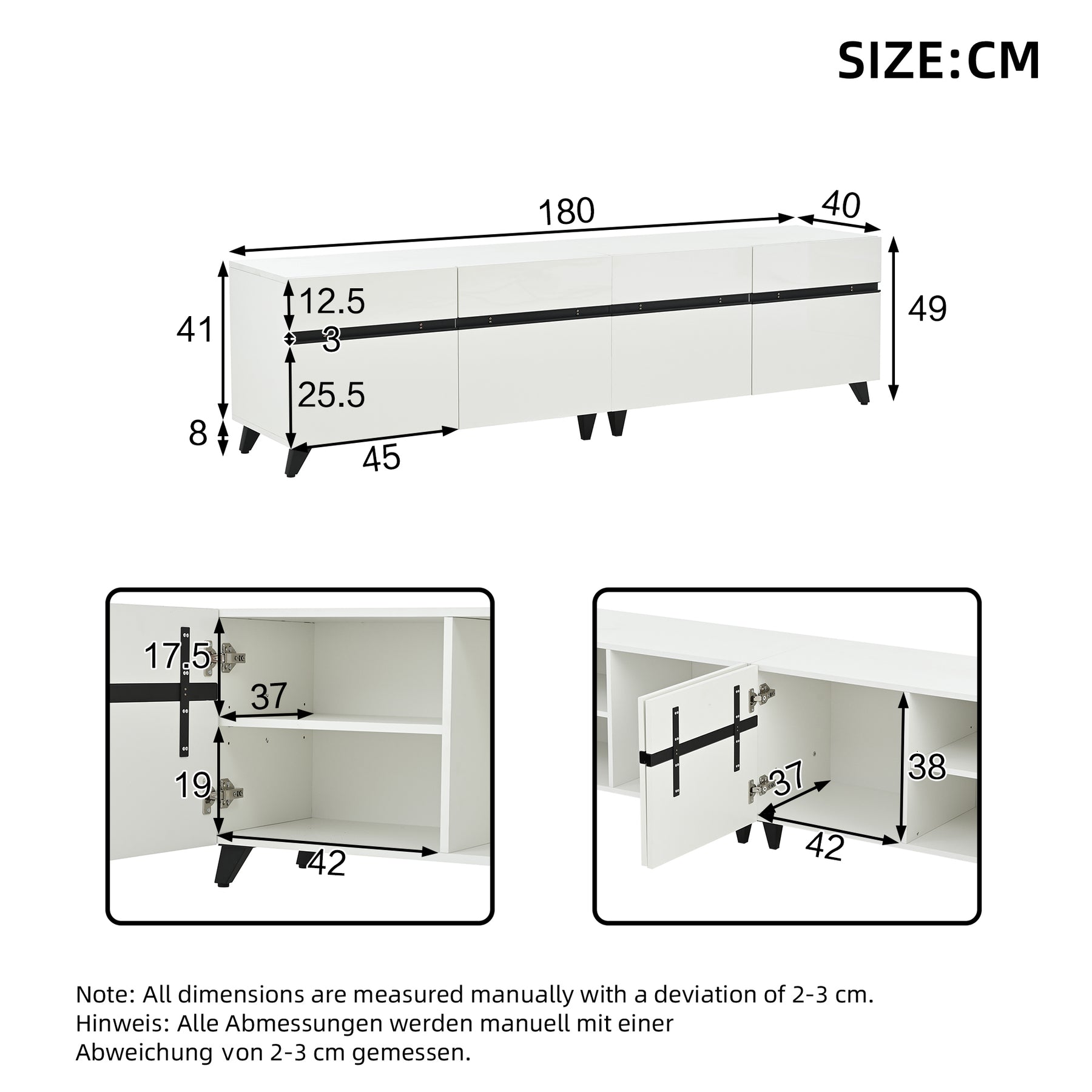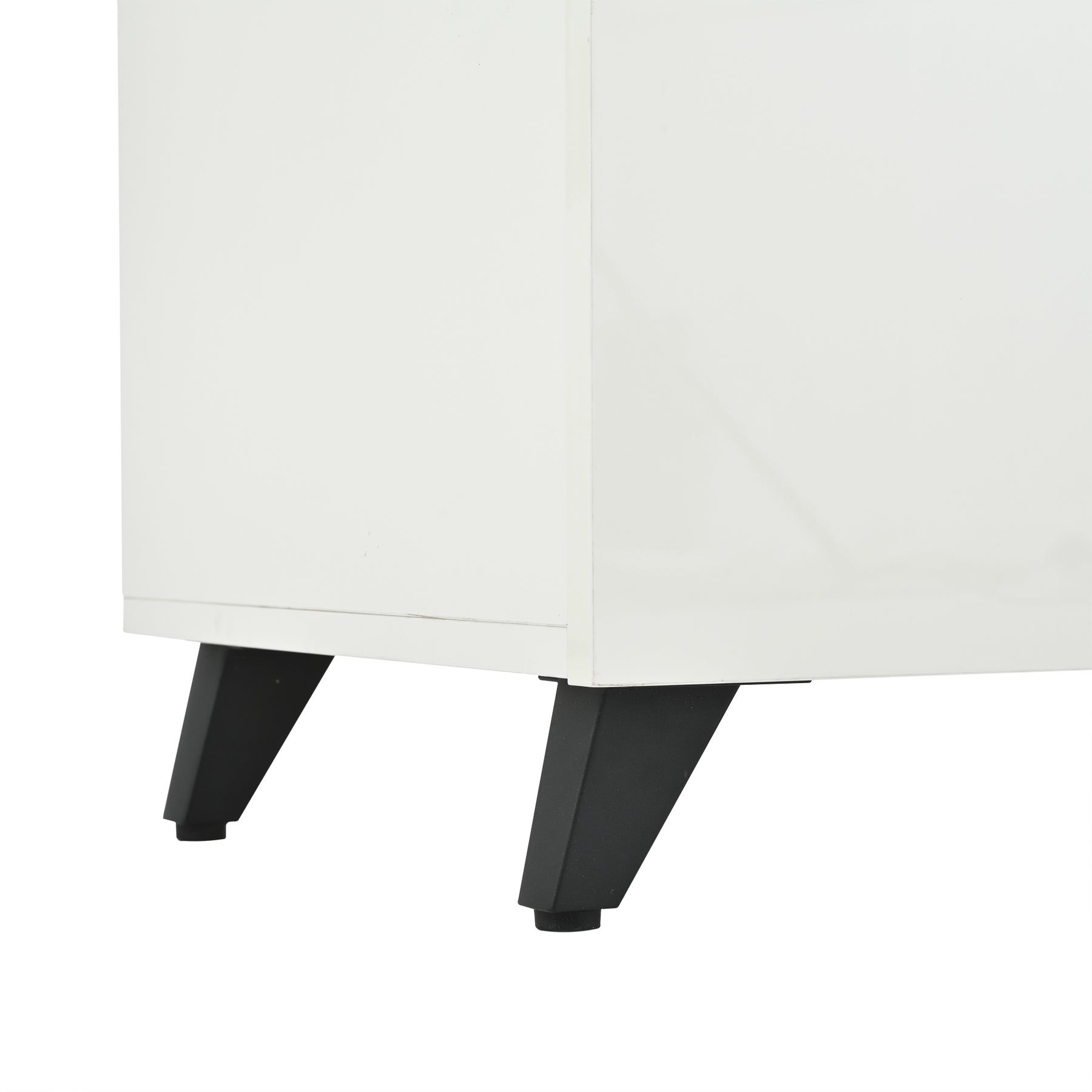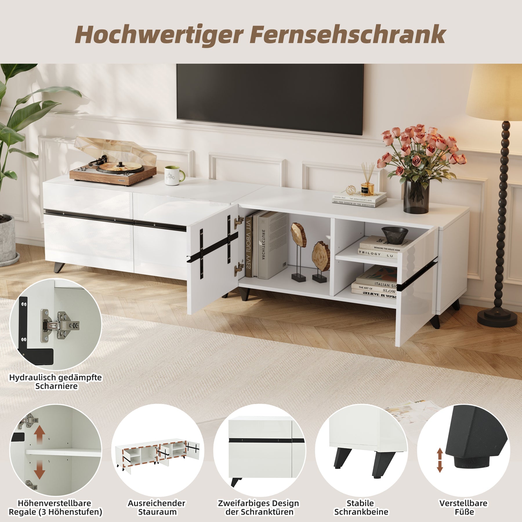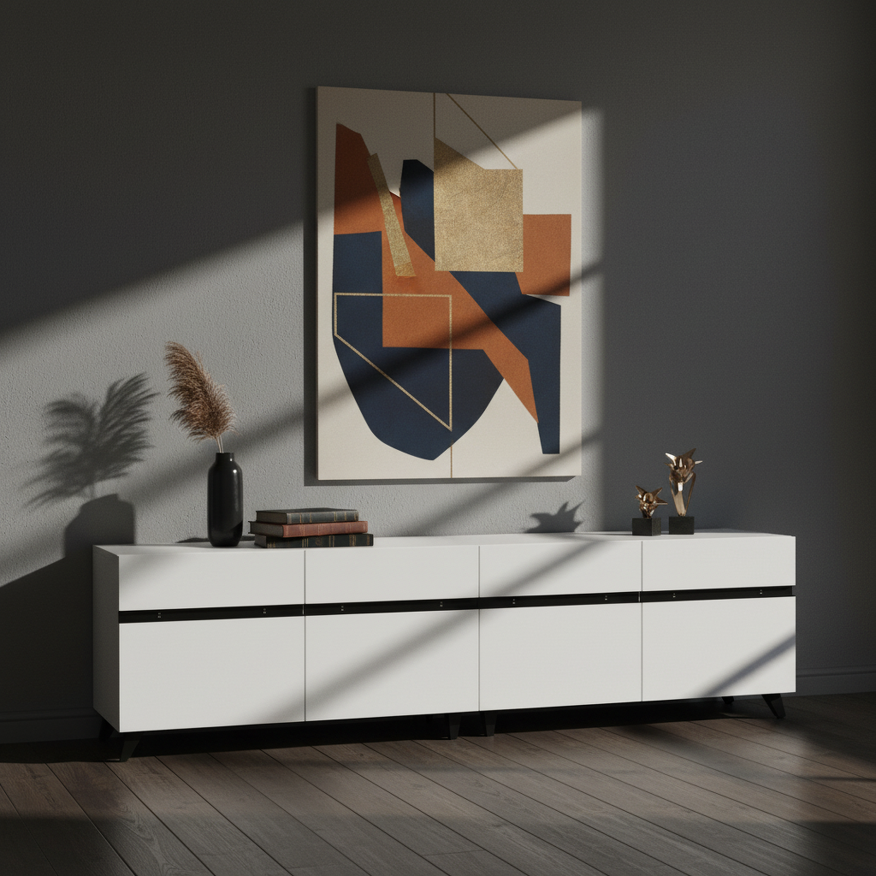 Meuble TV blanc laqué brillant avec bande noire et 4 portes EXUDATION