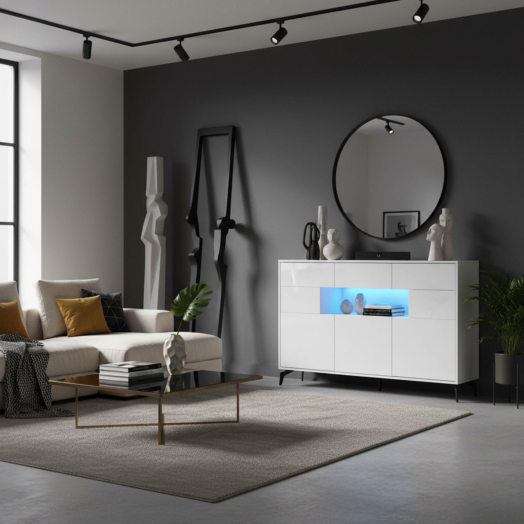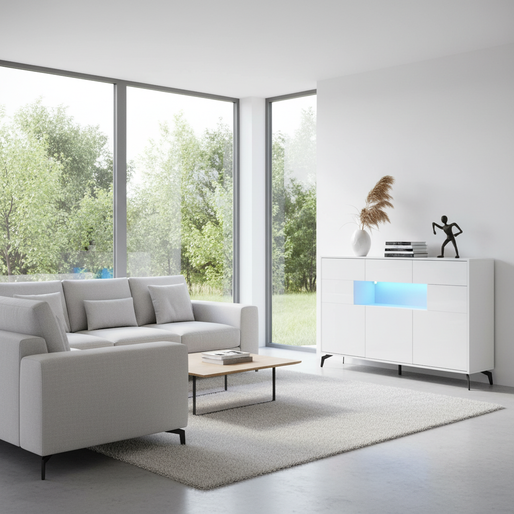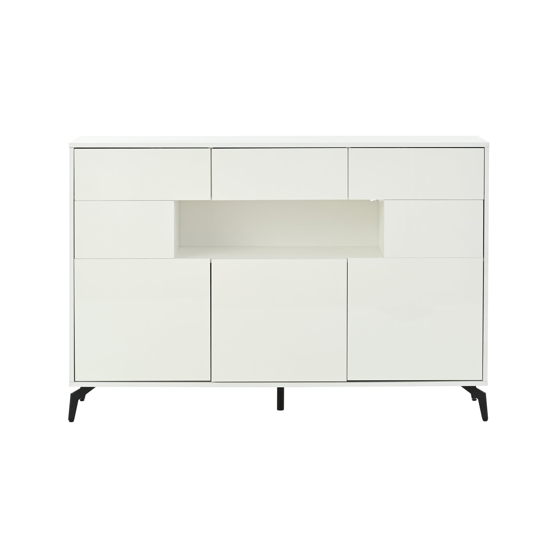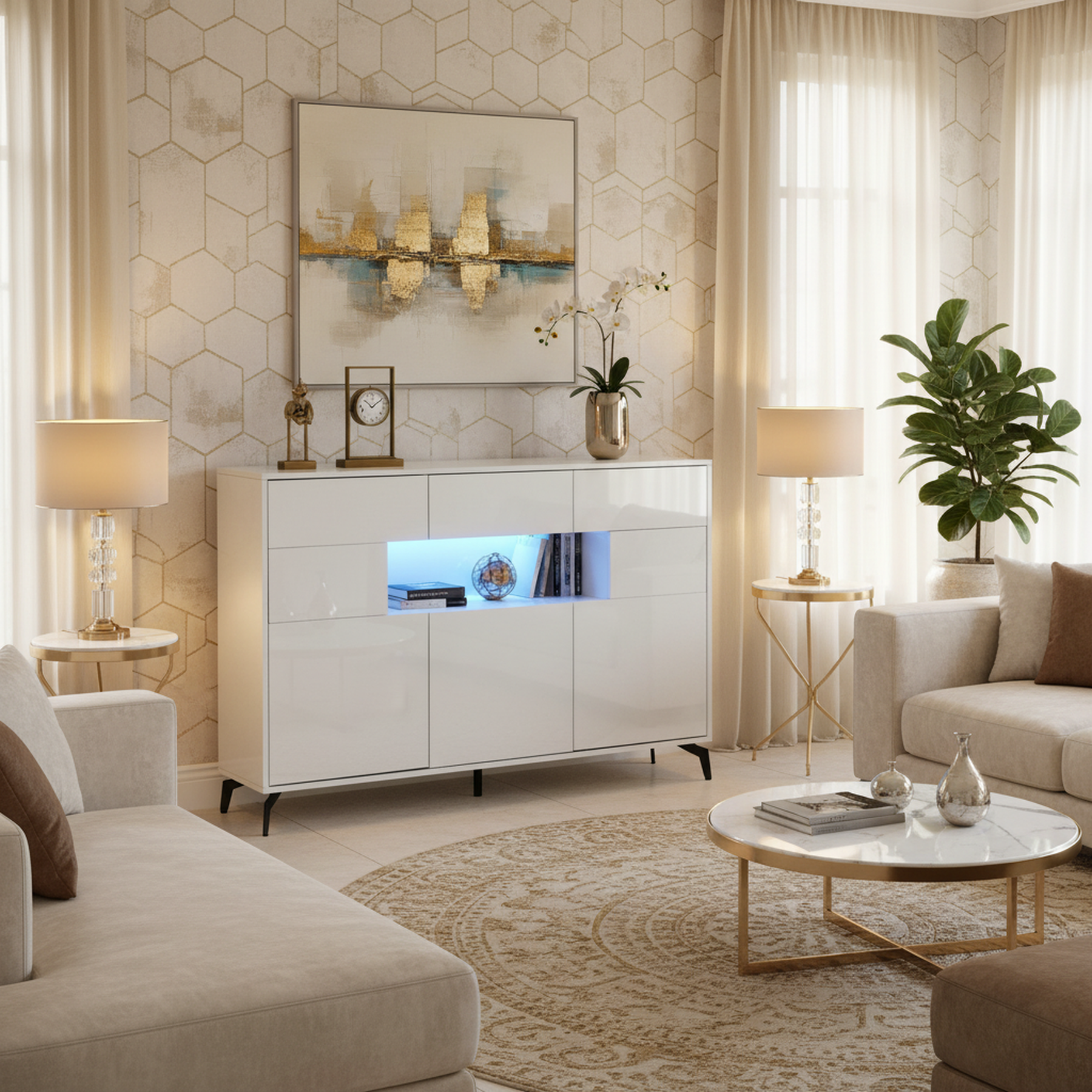 Buffet blanc brillant niche au centre avec éclairage LED intelligent 3 tiroirs 5 portes SEPTAL