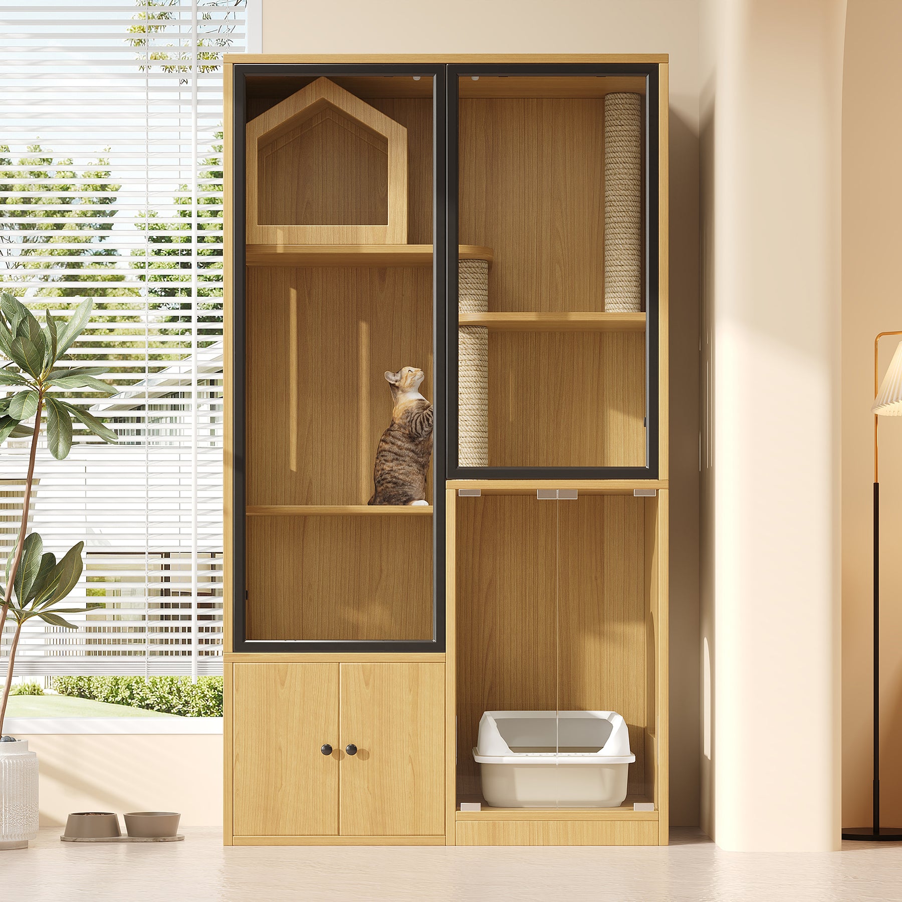 Meuble maison chat en verre et MDF bois naturel, 4 niveaux, avec griffoir 90x50x160cm AERIALROOT