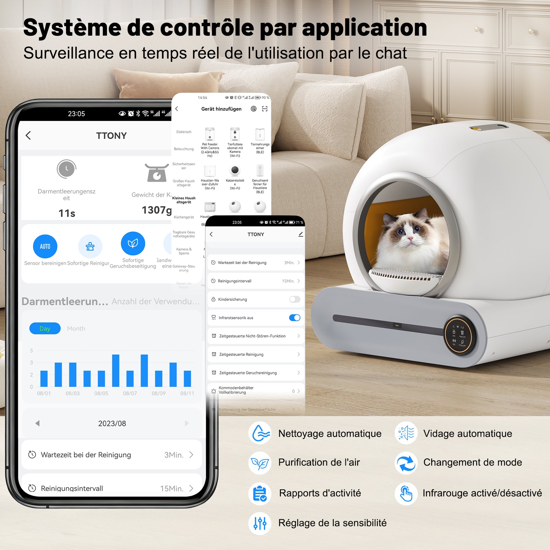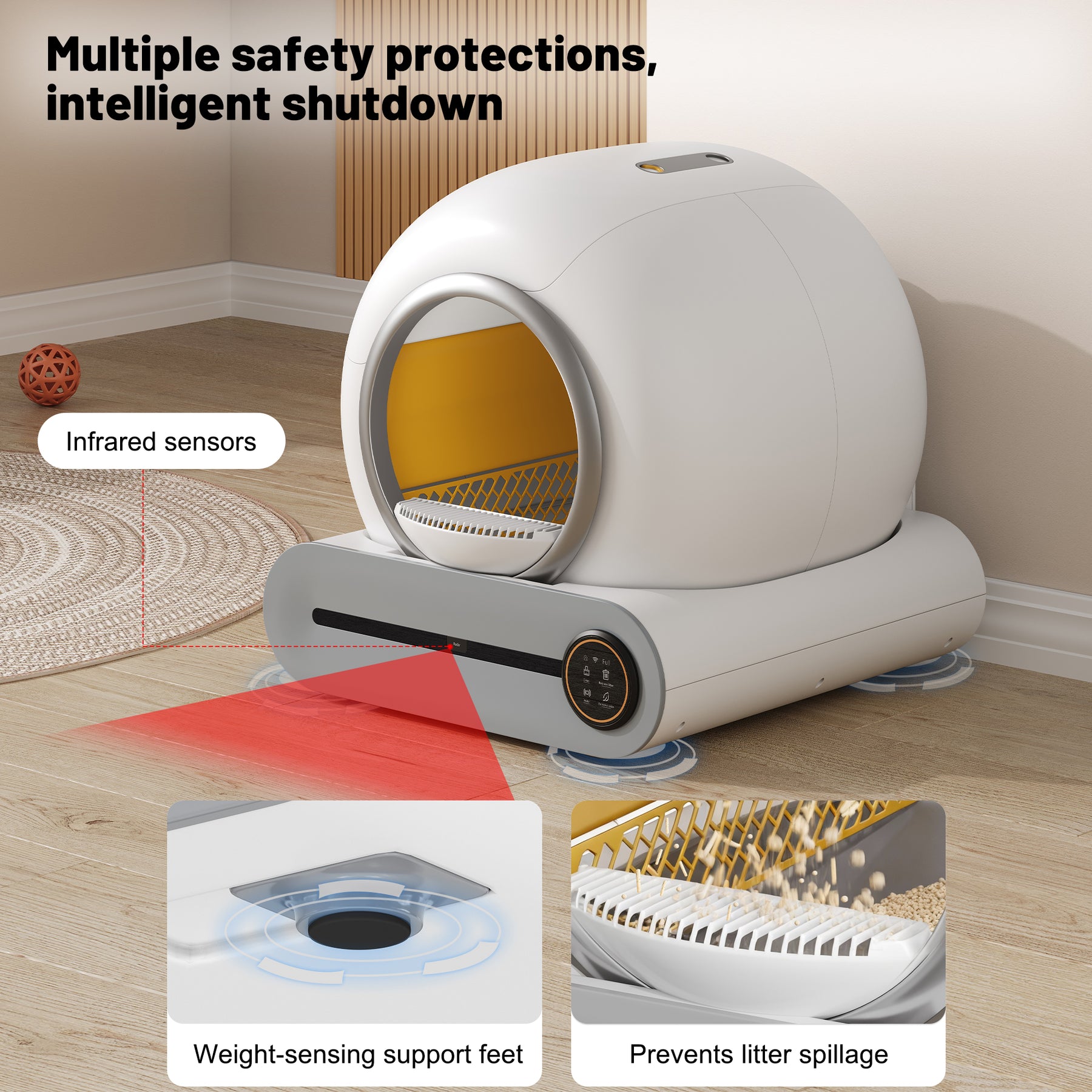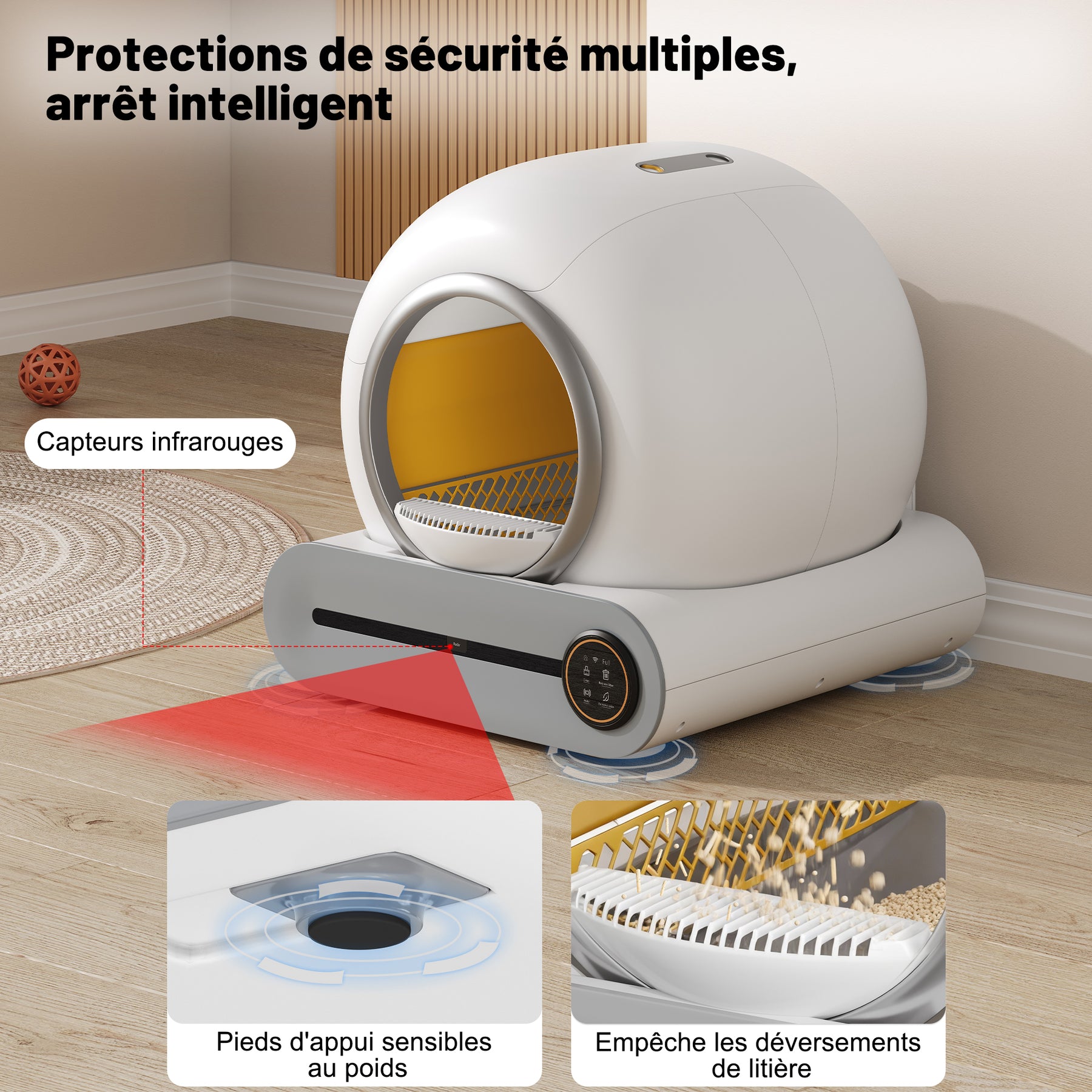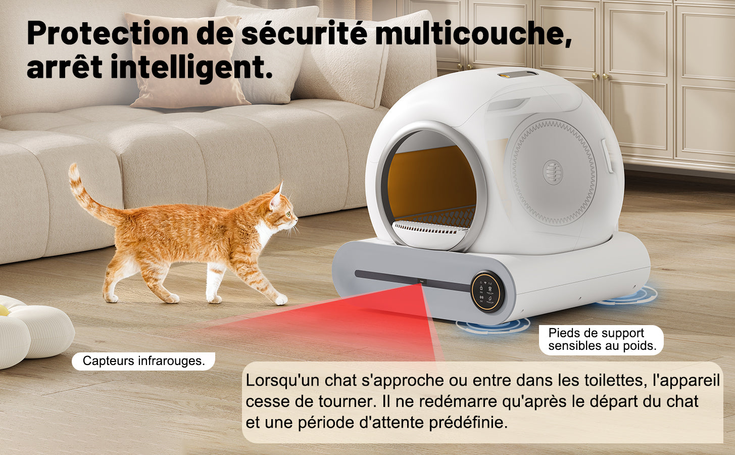 - Sécurité et contrôle parental : Ce bac à litière est équipé d'une sécurité enfant, de capteurs intelligents et d'une détection automatique des animaux, garantissant la sécurité de toute la famille (humains et chats).
