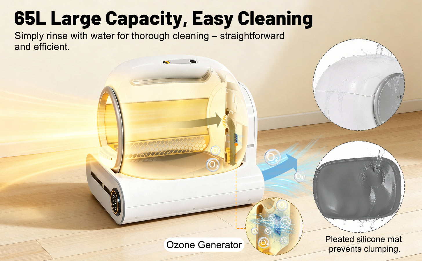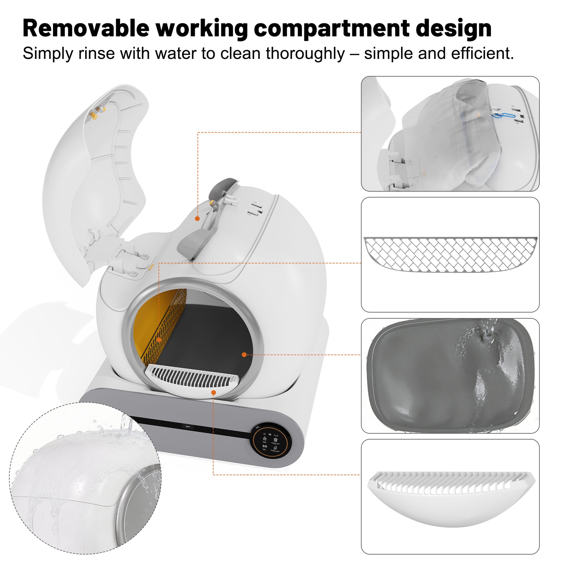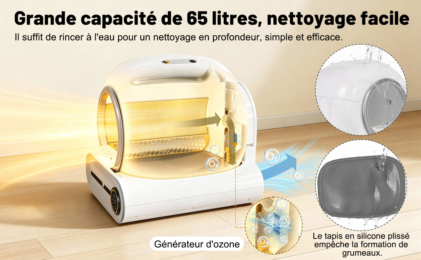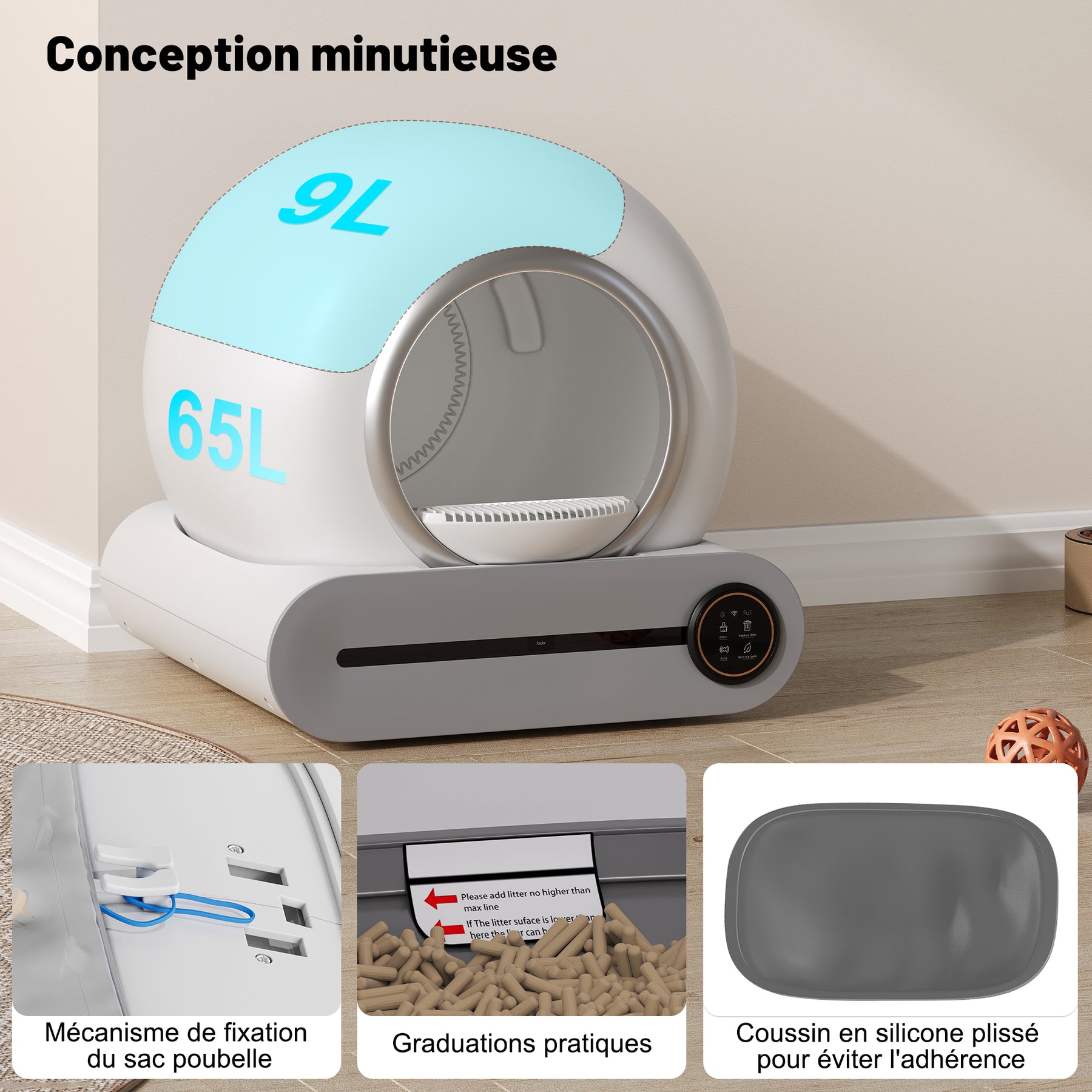 - Grande capacité, entretien facile : Avec une capacité allant jusqu'à 65 litres et un bac à litière de 9 litres, ce bac est idéal pour les foyers avec plusieurs chats (de 1 à 8 kg chacun). Le bac se nettoie seulement toutes les deux semaines. Entièrement lavable, il se démonte sans outils.