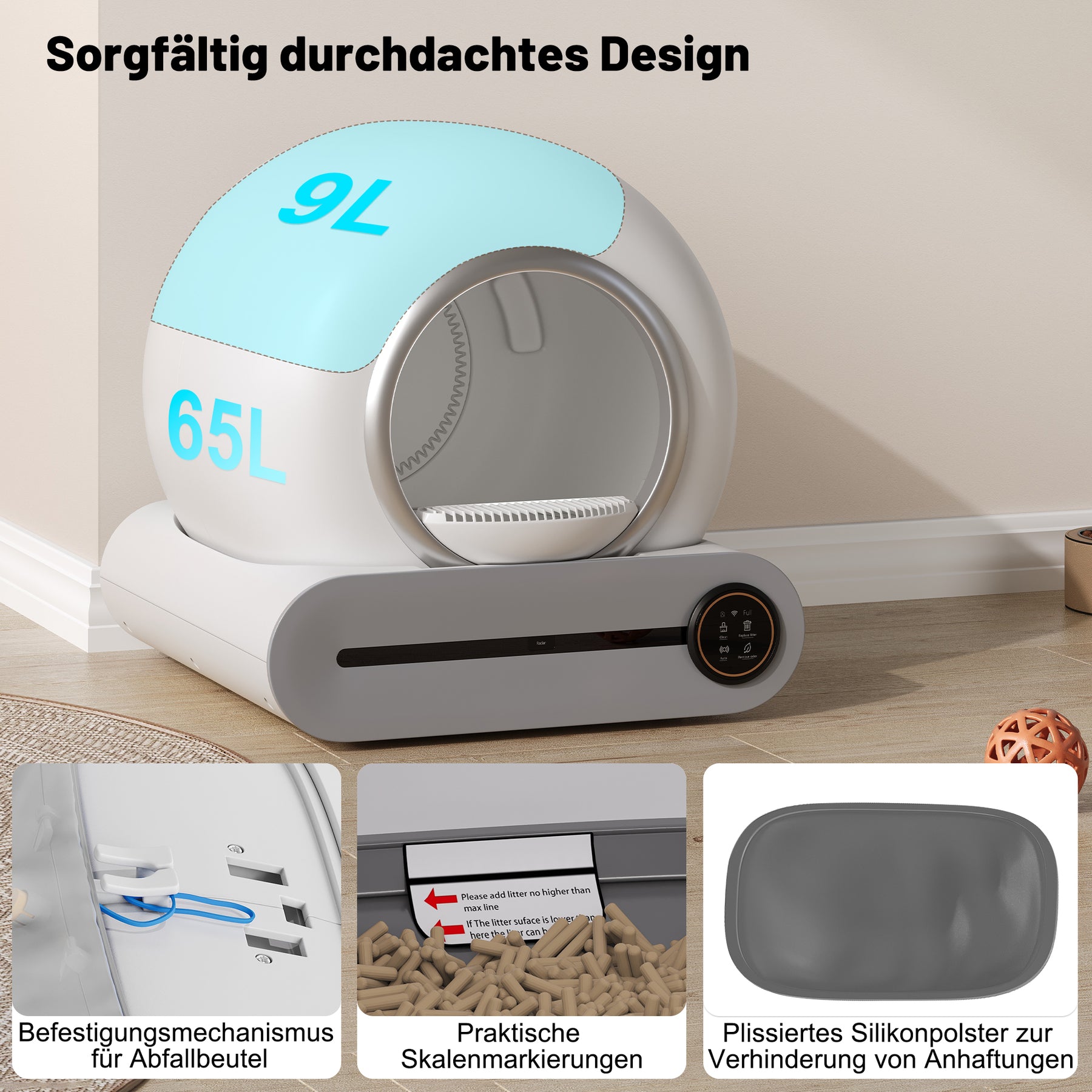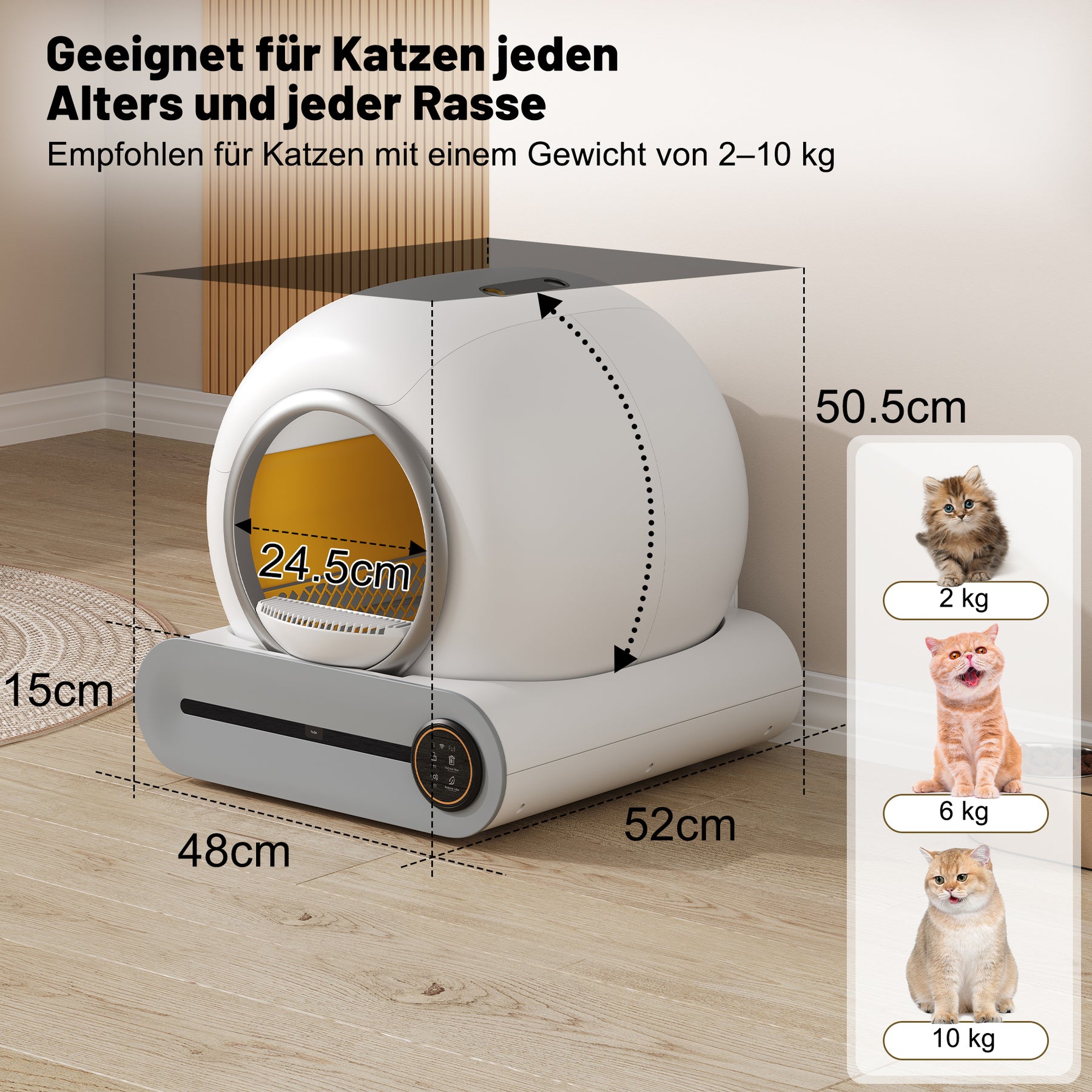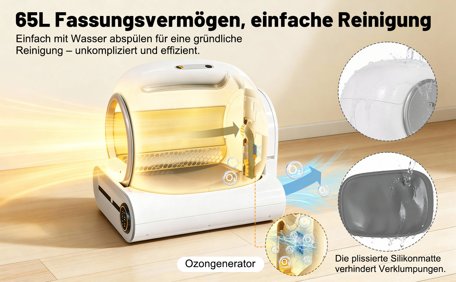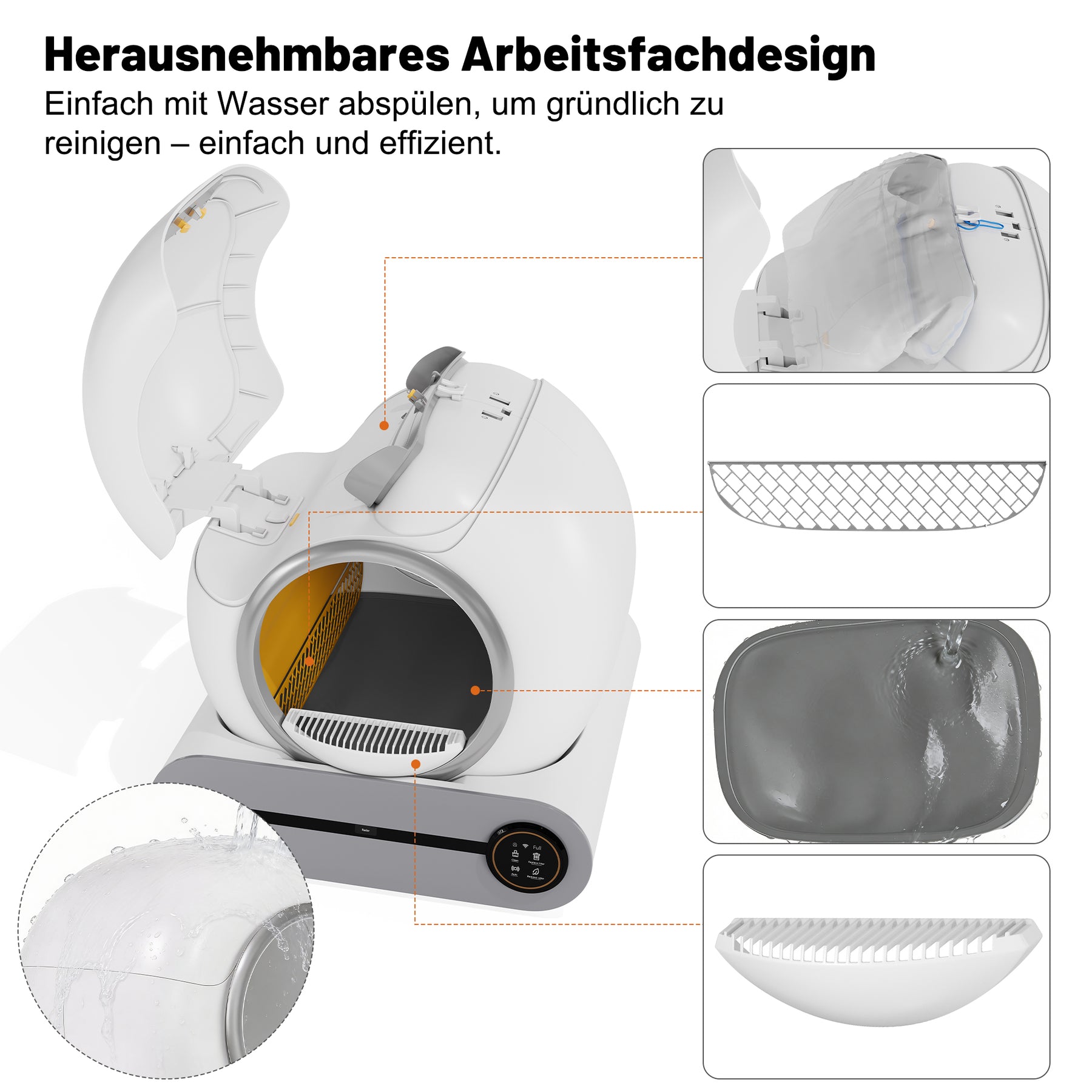 - Grande capacité, entretien facile : Avec une capacité allant jusqu'à 65 litres et un bac à litière de 9 litres, ce bac est idéal pour les foyers avec plusieurs chats (de 1 à 8 kg chacun). Le bac se nettoie seulement toutes les deux semaines. Entièrement lavable, il se démonte sans outils.