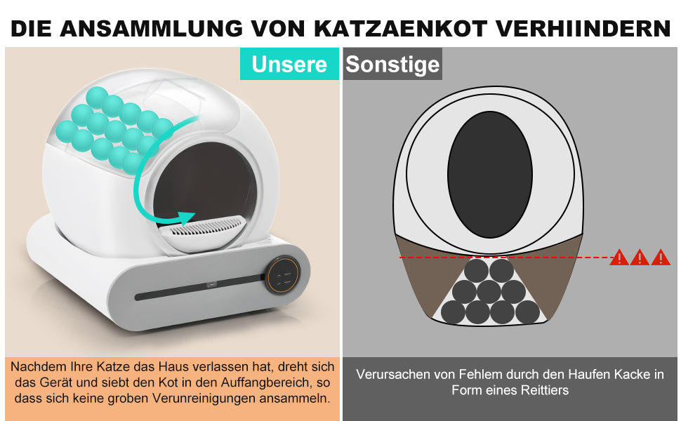 - Litière autonettoyante intelligente : Grâce à sa technologie avancée, cette litière sépare automatiquement la litière et les excréments après chaque utilisation, vous dispensant ainsi du nettoyage manuel quotidien ! Ses capteurs de gravité et infrarouges garantissent son activation uniquement en l'absence de votre chat, pour une sécurité optimale.