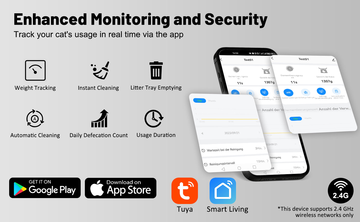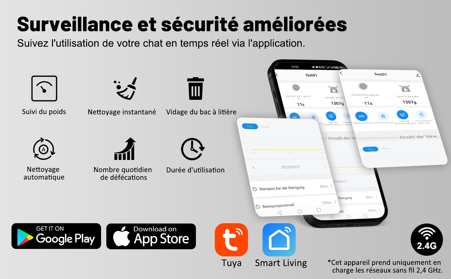- Surveillez la santé de votre chat : Suivez en temps réel le poids de chaque chat, ses visites chez le vétérinaire et le temps passé à la litière via une application mobile (iOS/Android). Vous pouvez ainsi réagir rapidement à tout comportement inhabituel, essentiel pour la santé de votre chat.