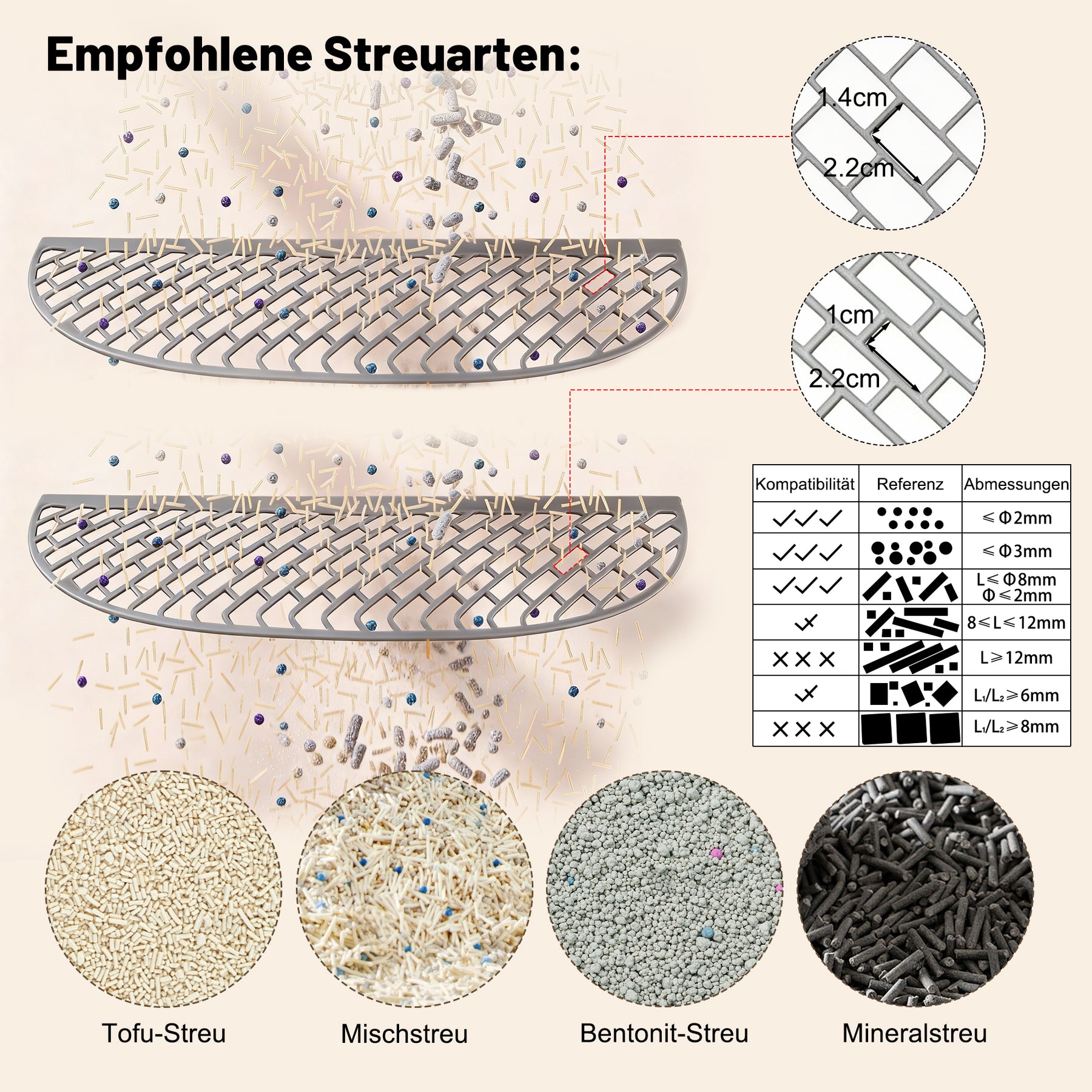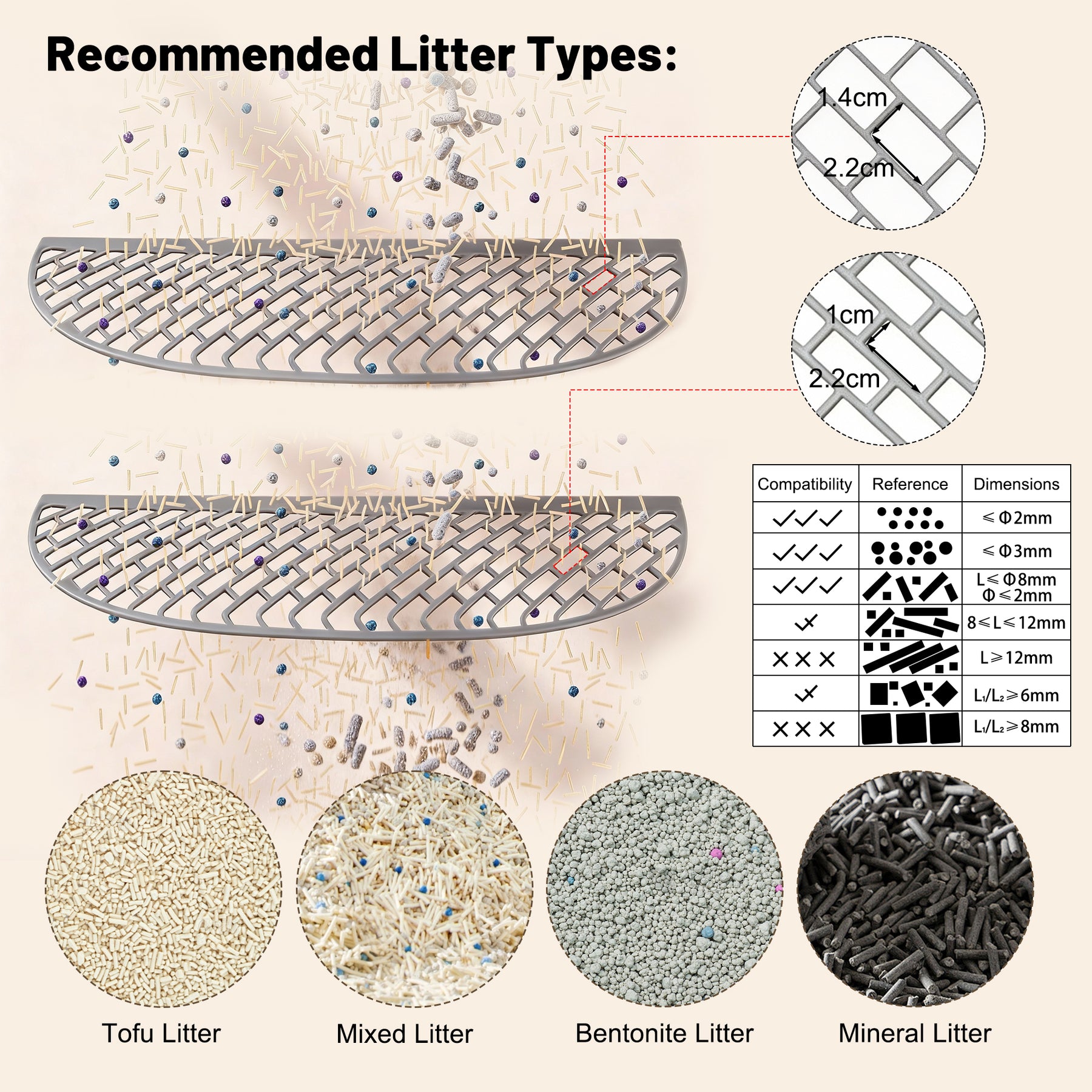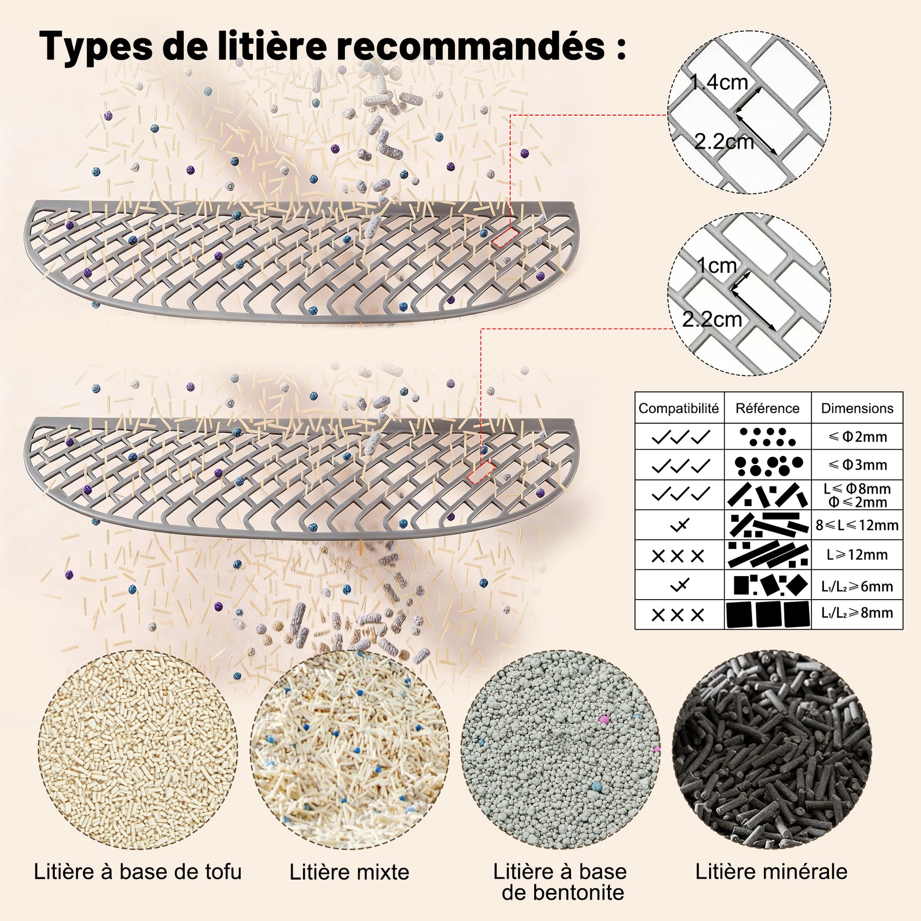 - Compatibilité universelle : Pratique et polyvalent, il s'adapte à la plupart des litières (tofu, bentonite, minérale, etc.), à l'exception de la litière en silicone. Vous avez ainsi plus de liberté pour choisir la litière la mieux adaptée à votre animal !