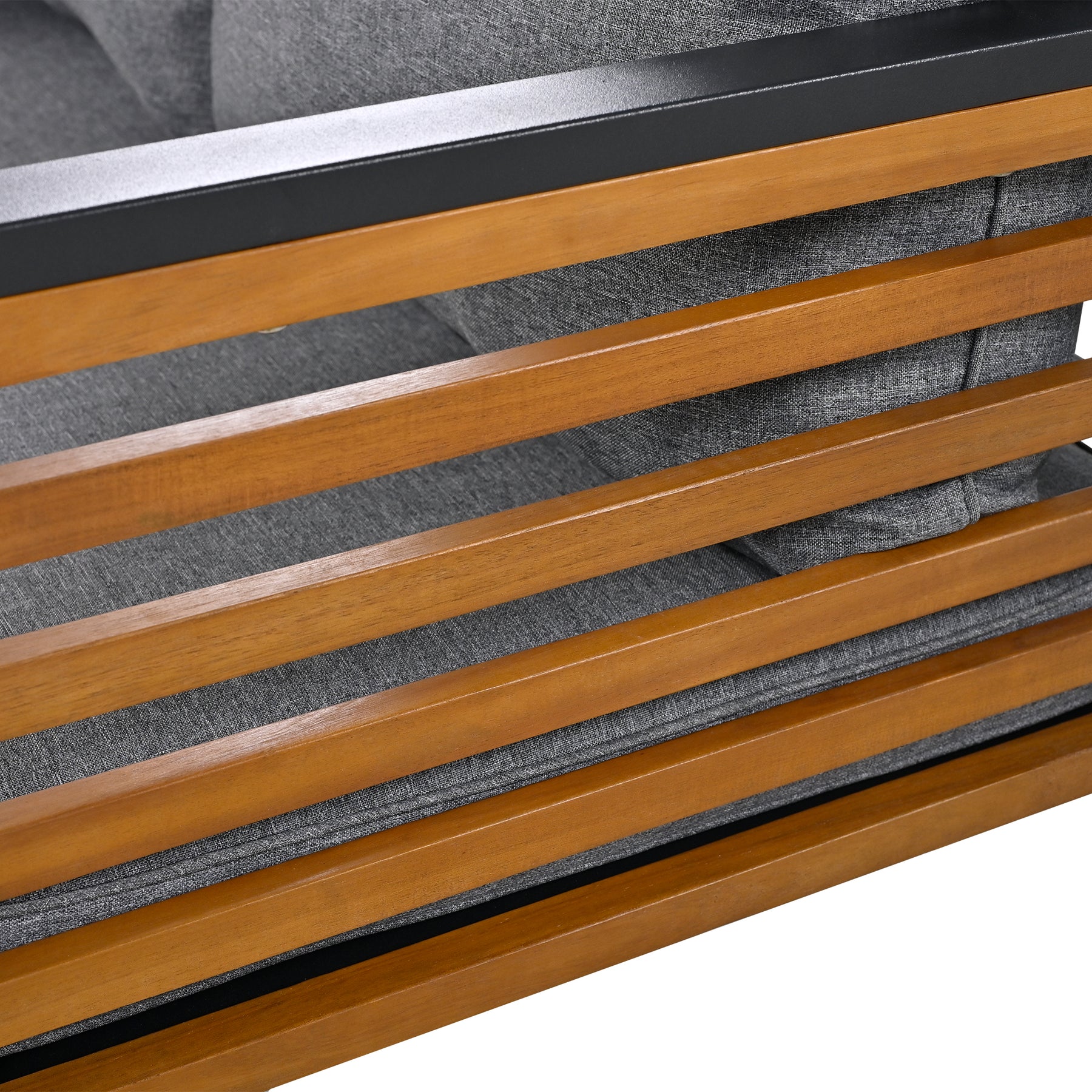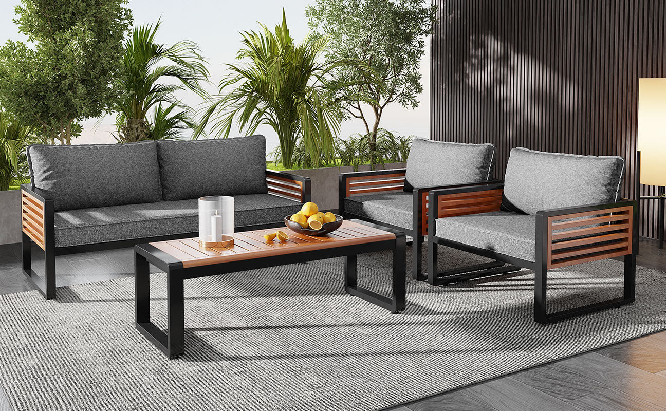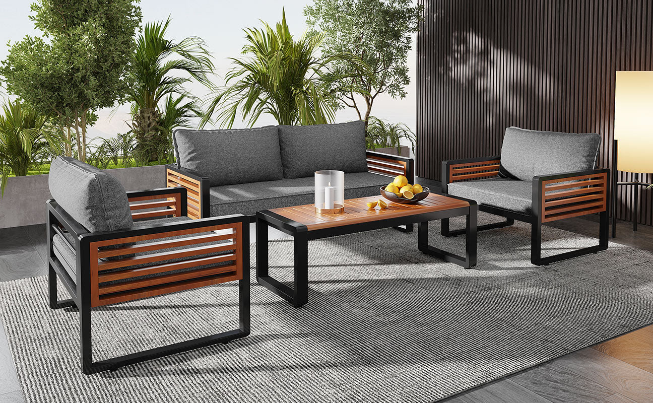 - Finitions en bois d’acacia naturel : Les accoudoirs et le plateau de table en bois d’acacia apportent une touche chaleureuse et authentique, tout en offrant une excellente résistance à l’eau et à l’humidité.