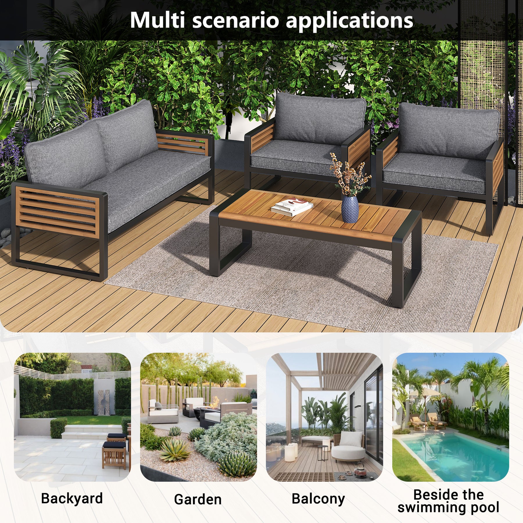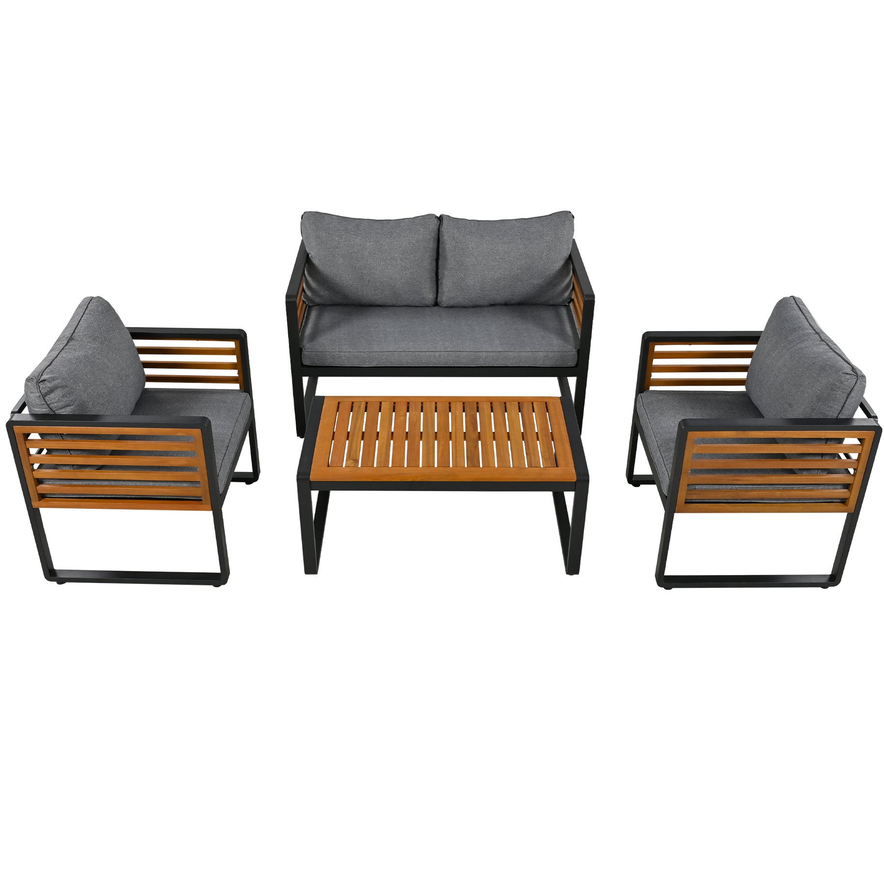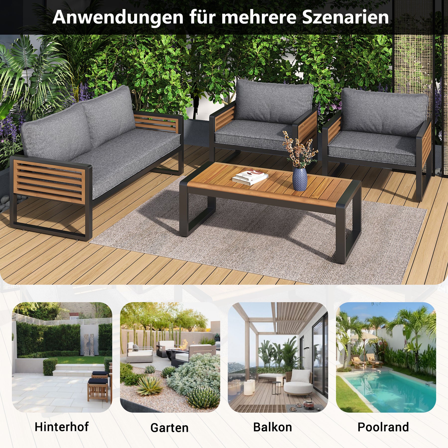 - Finitions en bois d’acacia naturel : Les accoudoirs et le plateau de table en bois d’acacia apportent une touche chaleureuse et authentique, tout en offrant une excellente résistance à l’eau et à l’humidité.