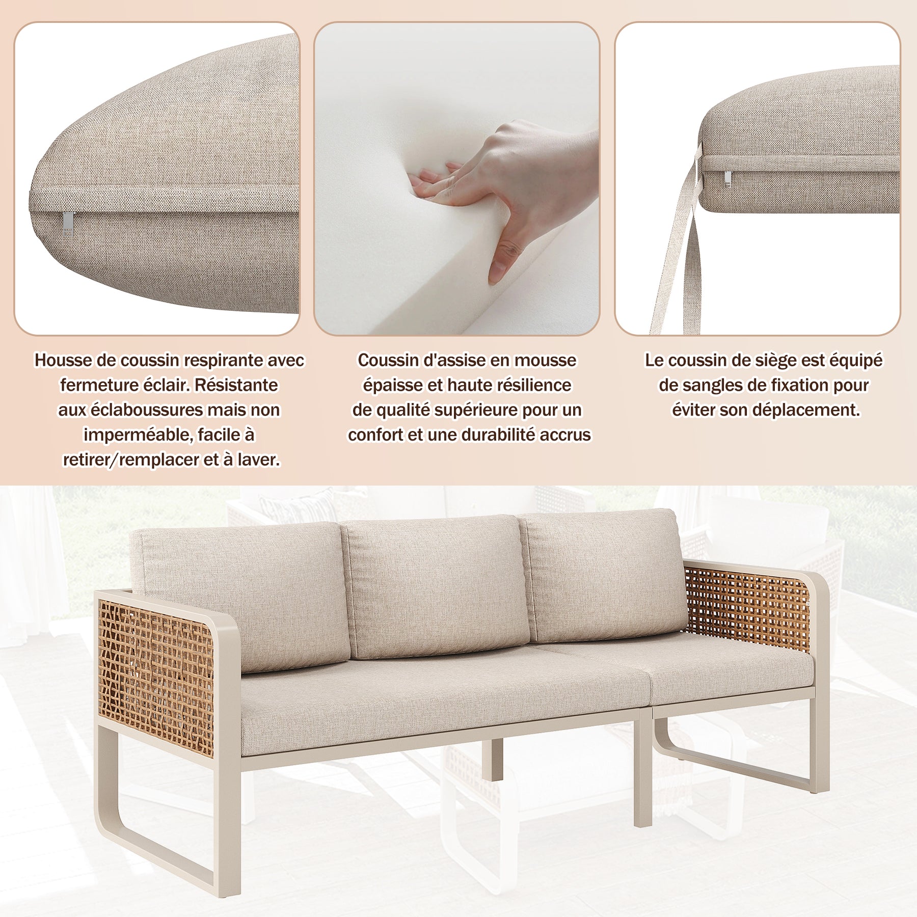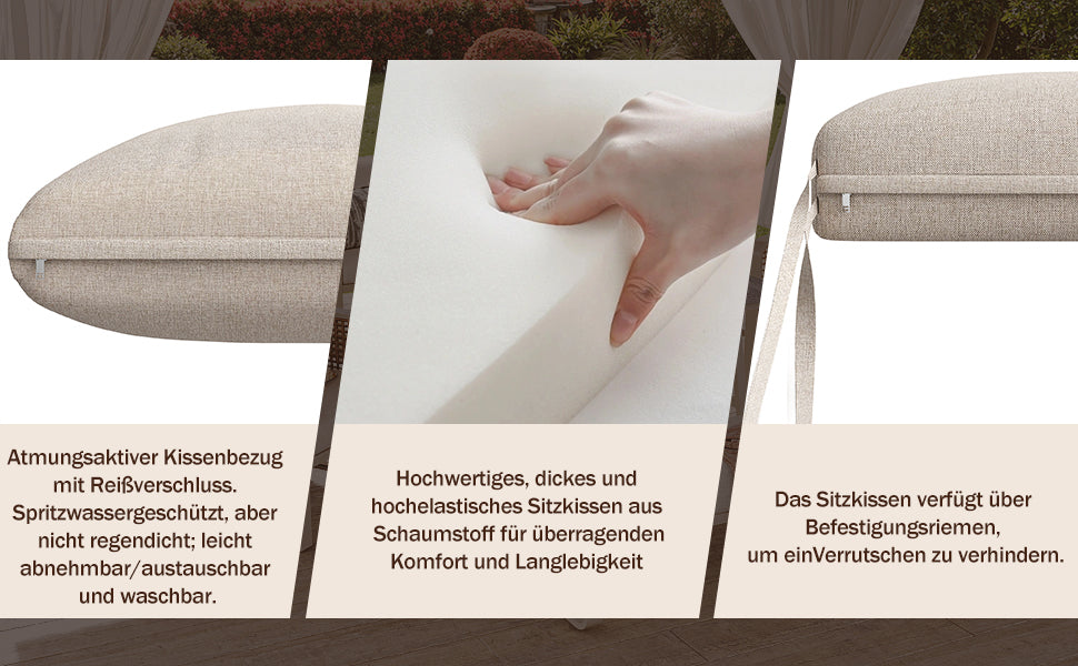 - Confort supérieur : Coussins épais, déhoussables et lavables en machine, avec mousse haute densité pour un maintien optimal et une assise moelleuse, idéals pour de longues heures de détente.