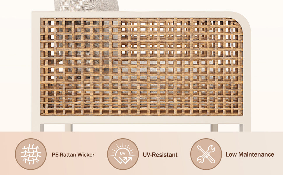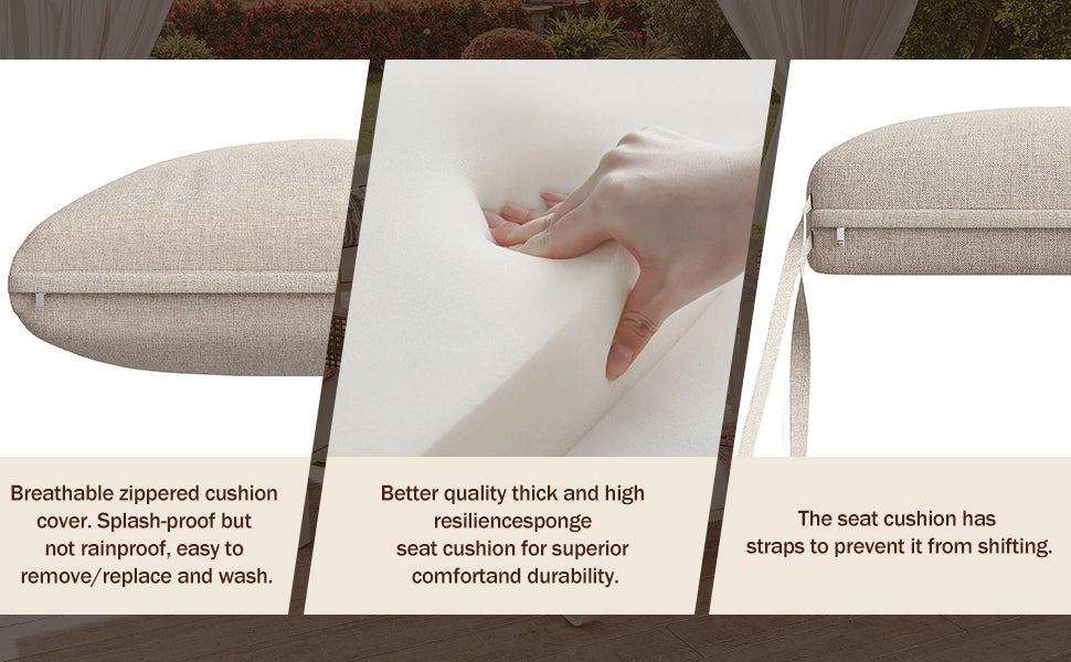 - Entretien facile : Les housses de coussins sont résistantes aux éclaboussures et se retirent facilement pour un lavage rapide, tandis que la structure en rotin PE se nettoie simplement à l’eau, vous laissant plus de temps pour profiter de votre extérieur.