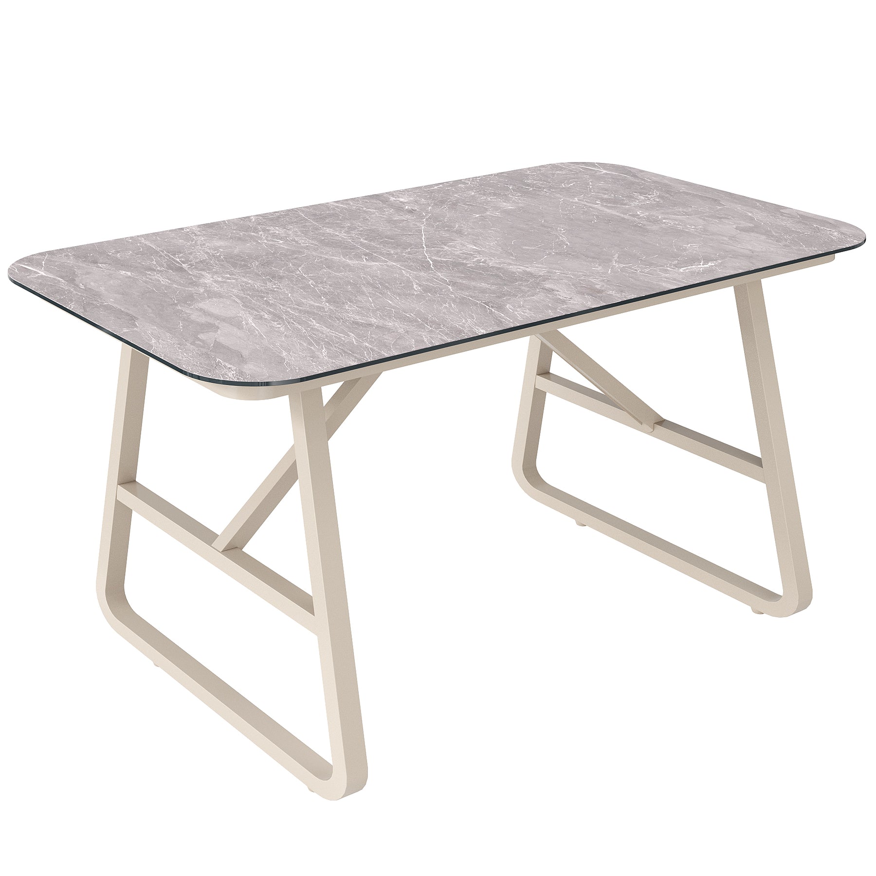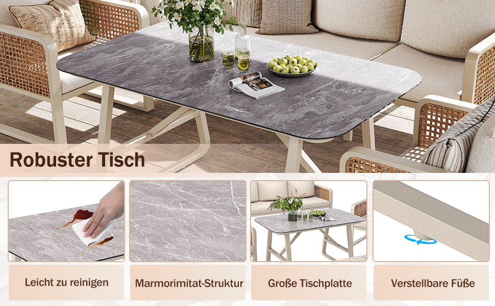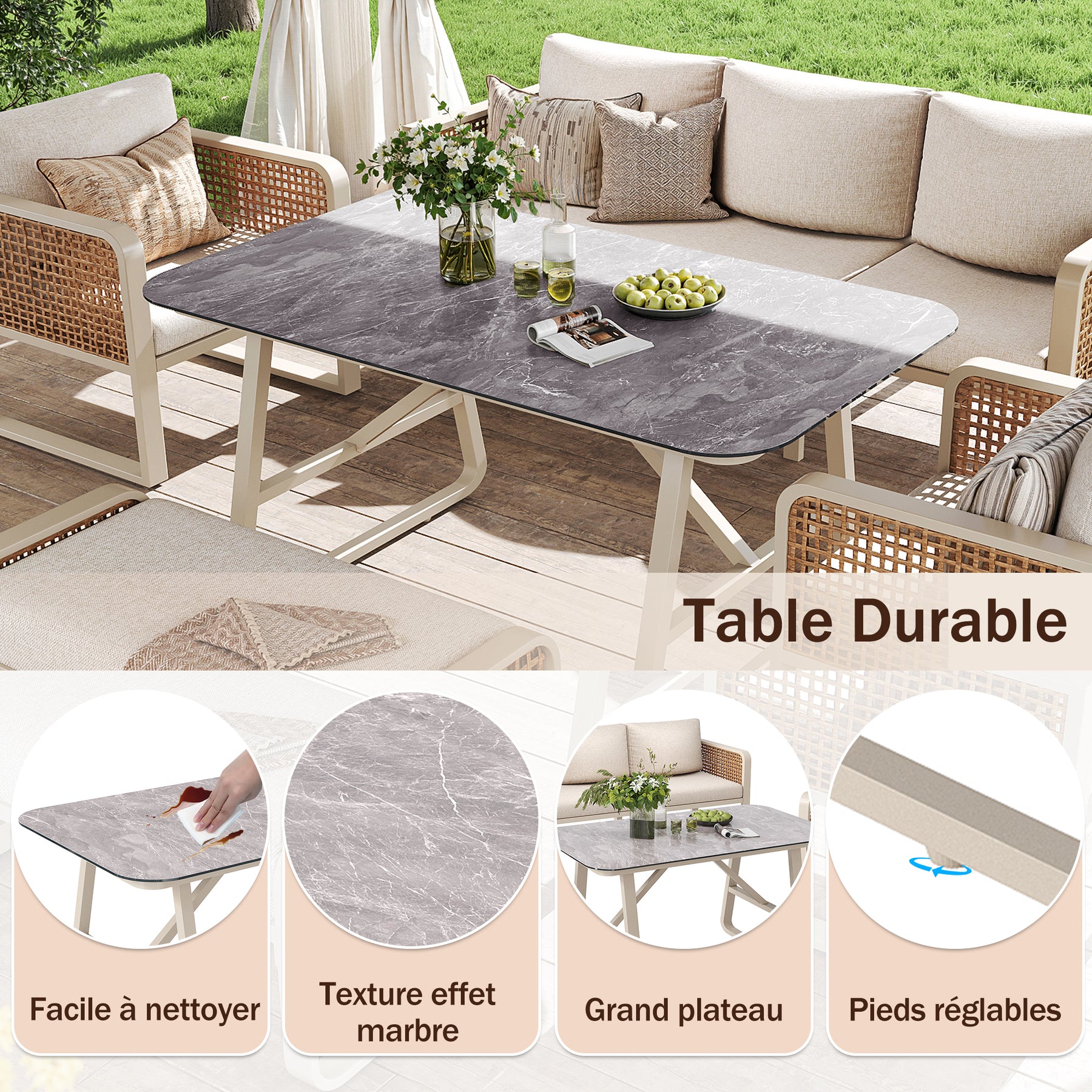 Salon de jardin 6-7 personnes en rotin PE beige modulable et table basse effet marbre gris avec coussins lavables