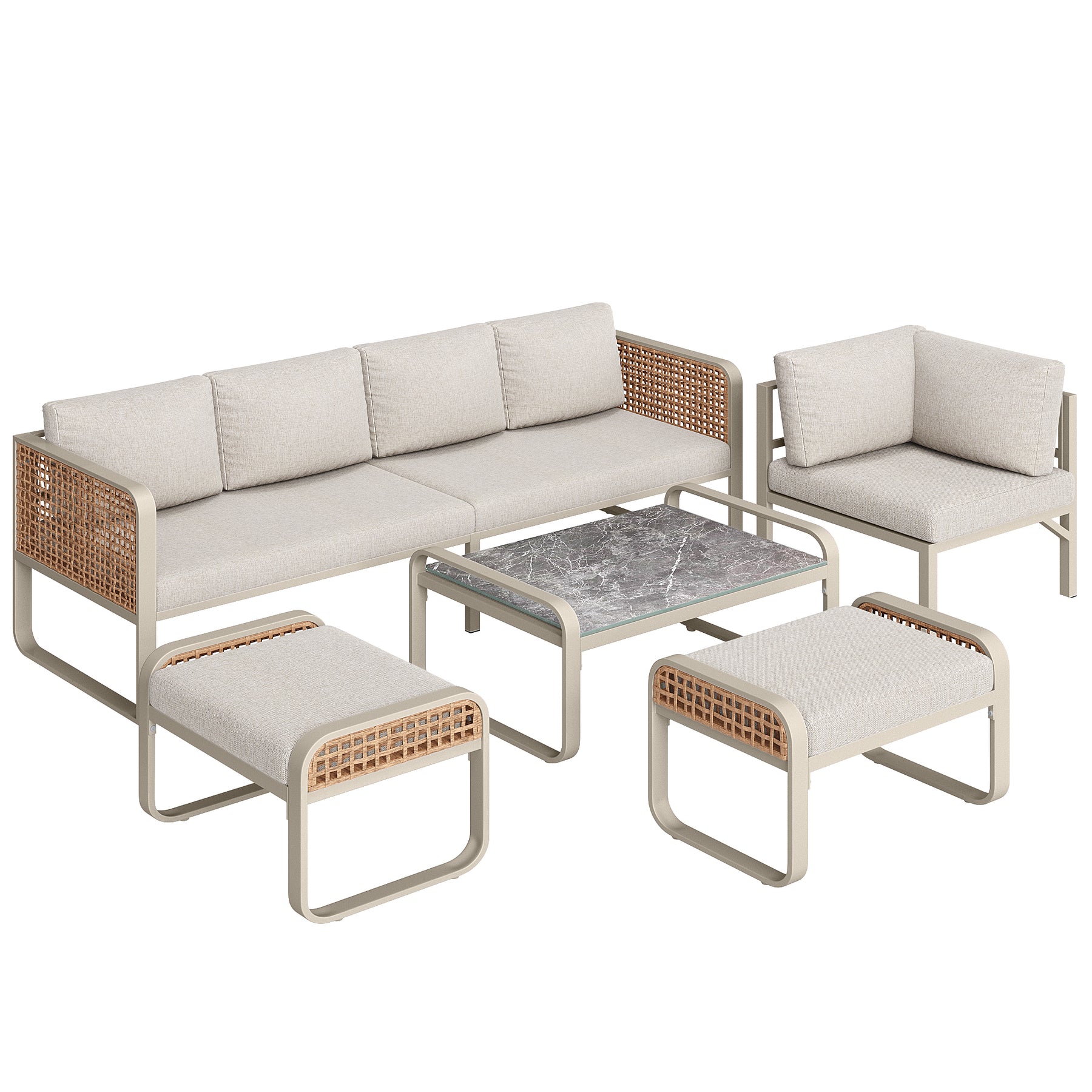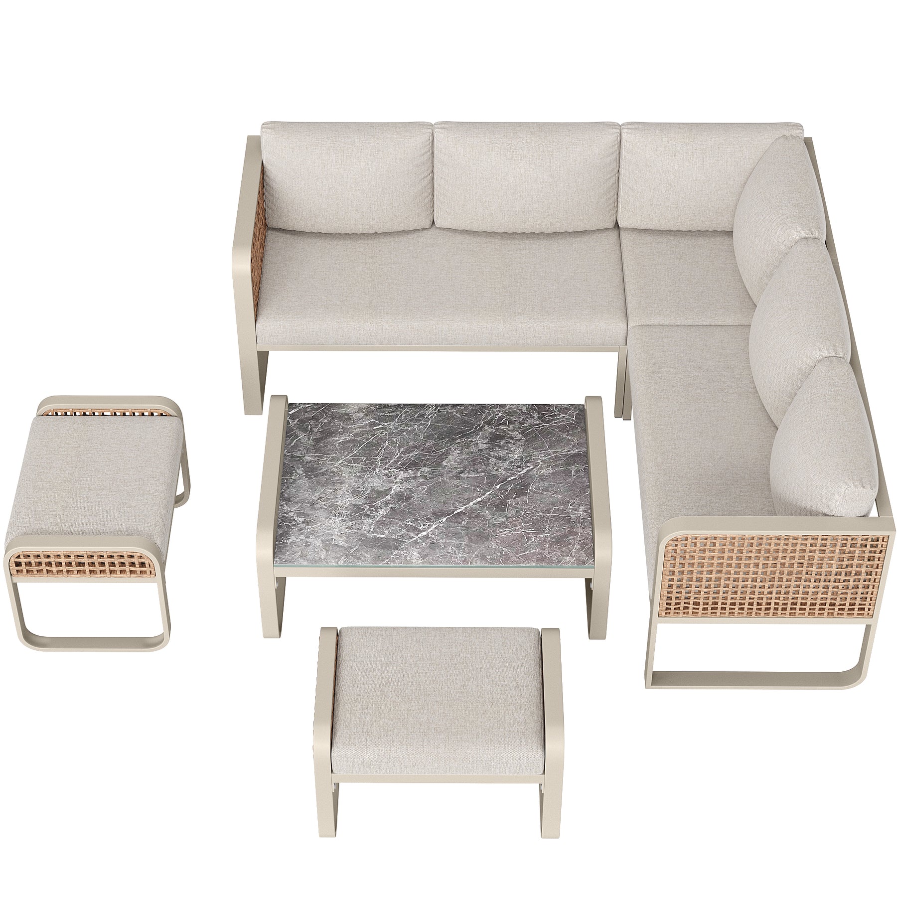 Salon de jardin en rotin tressé 6-7 personnes beige, canapé d'angle, table basse effet marbre gris, coussins inclus