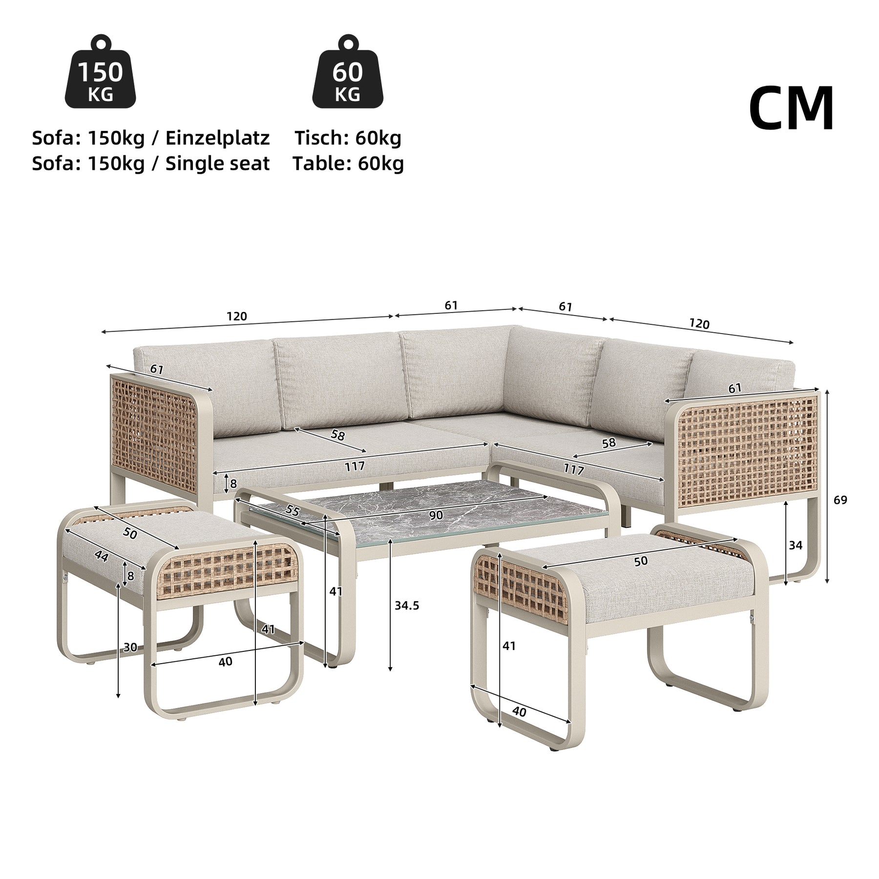 • Dimensions du produit : Grand canapé x2 : 120x61x69cm ; Petit canapé : 61x61x69cm ; Banc : 50x40x41cm ; Table : 90x55x41cm