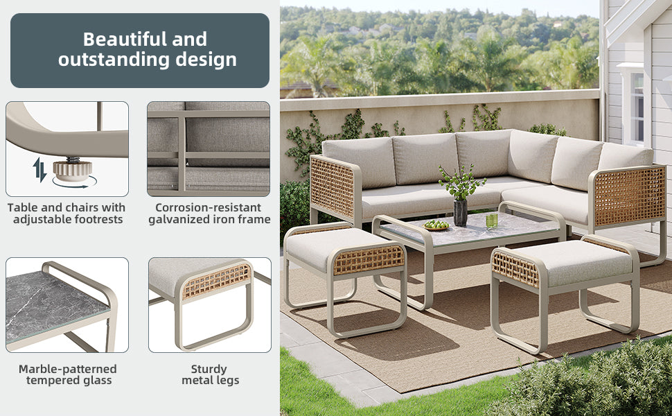 - Adaptabilité maximale : Les pieds réglables du canapé et de la table garantissent une stabilité parfaite même sur des surfaces irrégulières, protégeant votre sol des rayures.