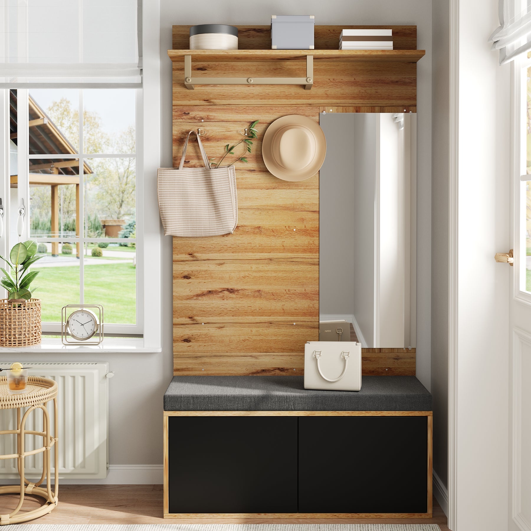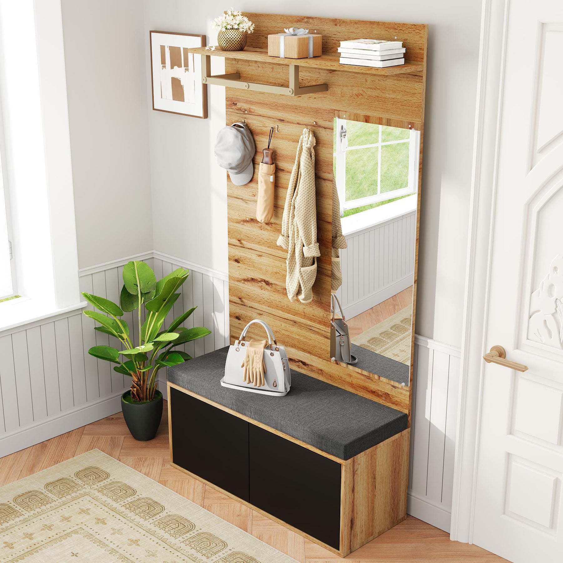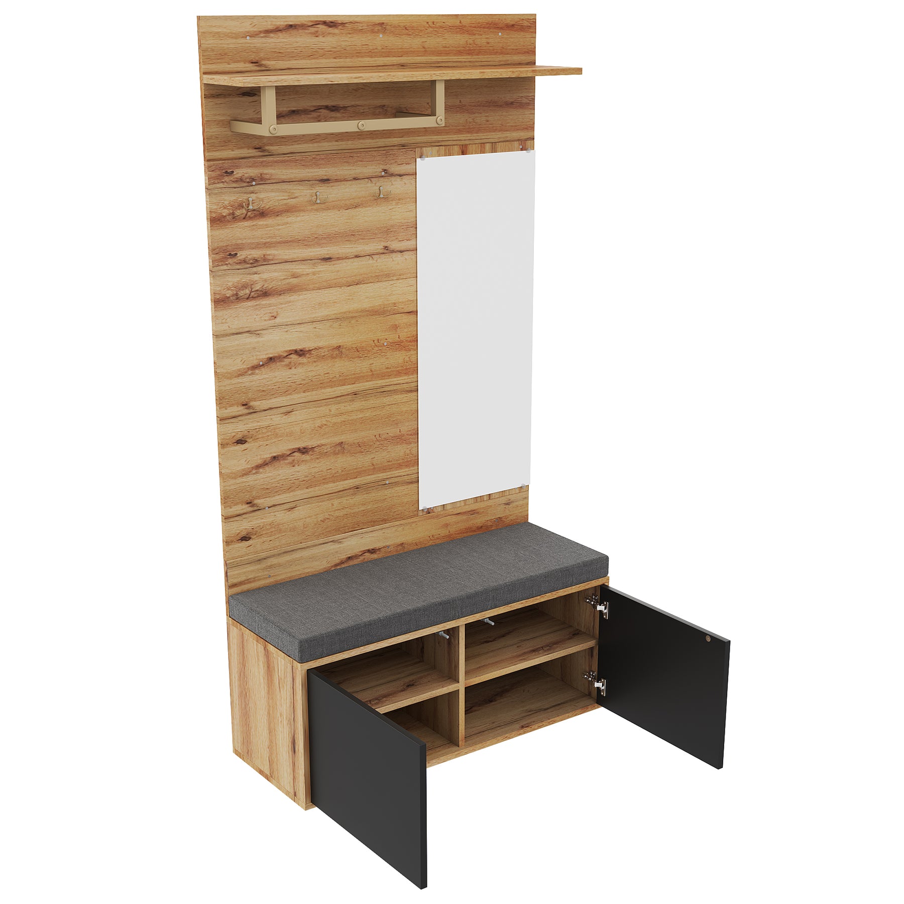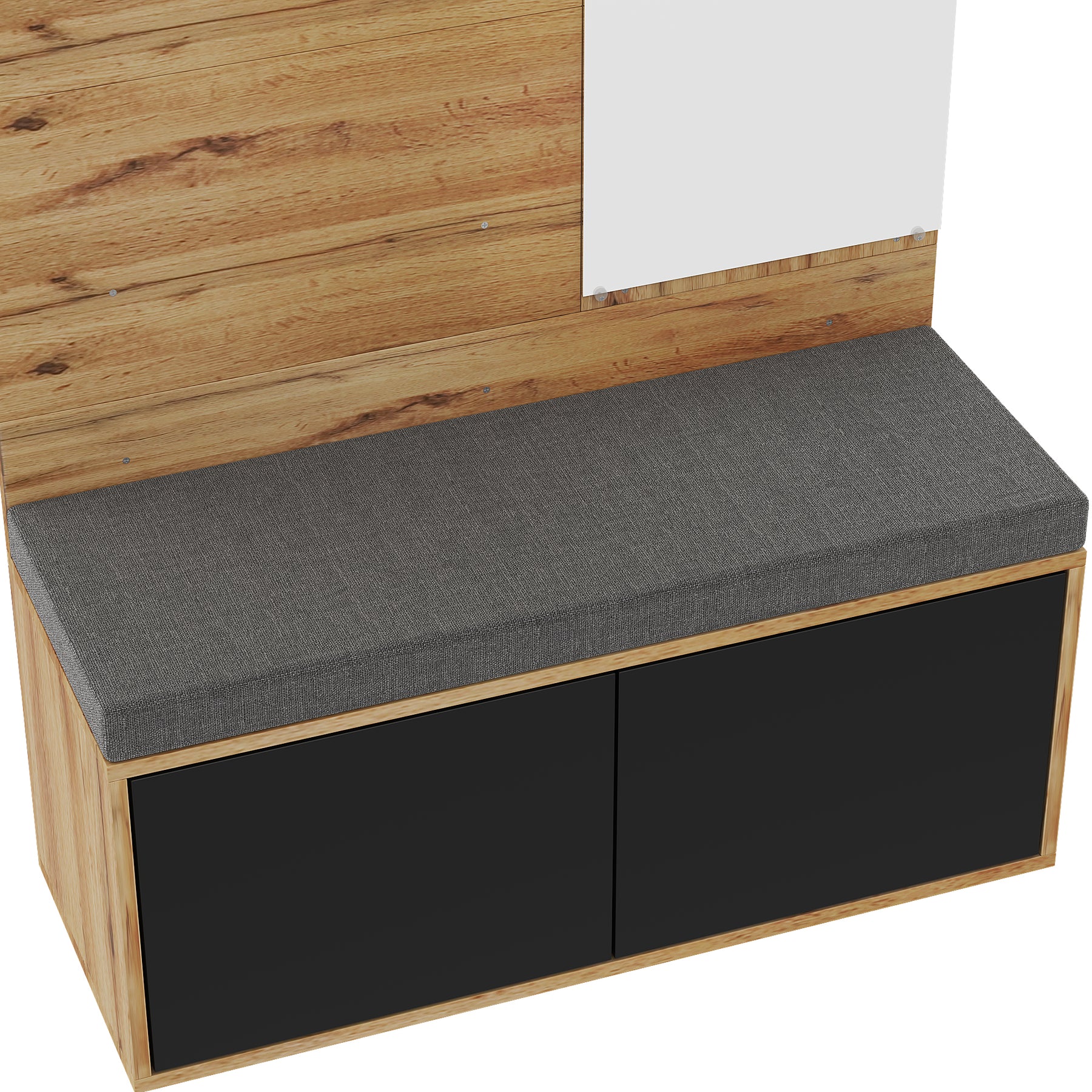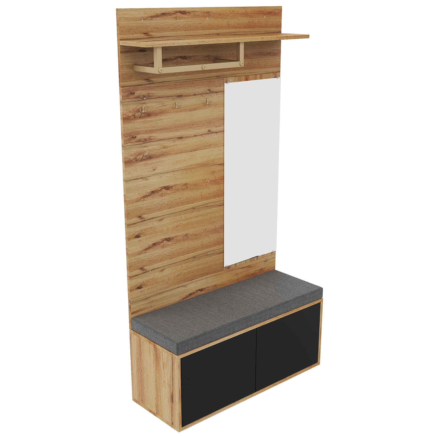 Vestiaire à l'entrée effet bois banc rembourré, miroir, porte-manteaux, miroir et rangement chaussures GALLWASP