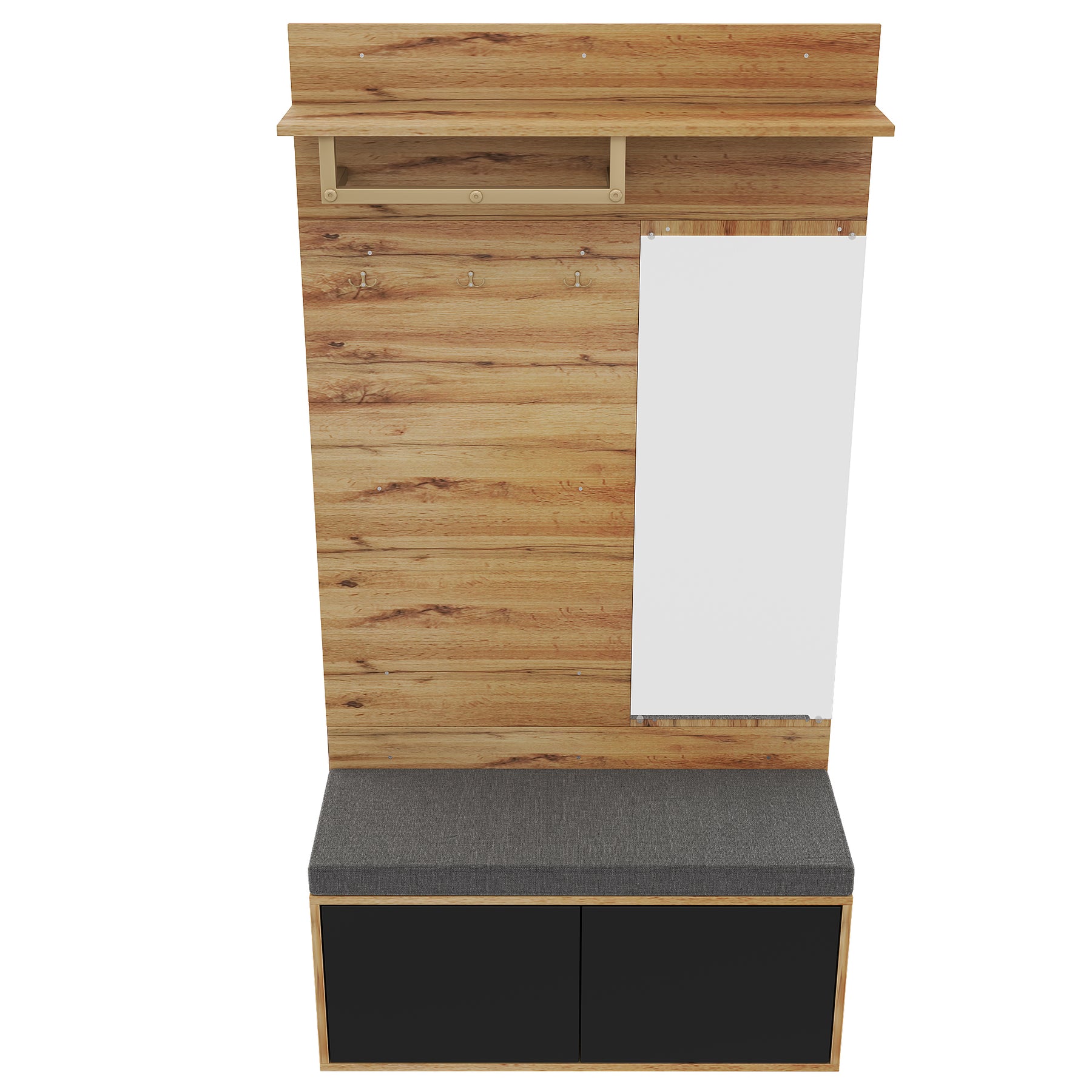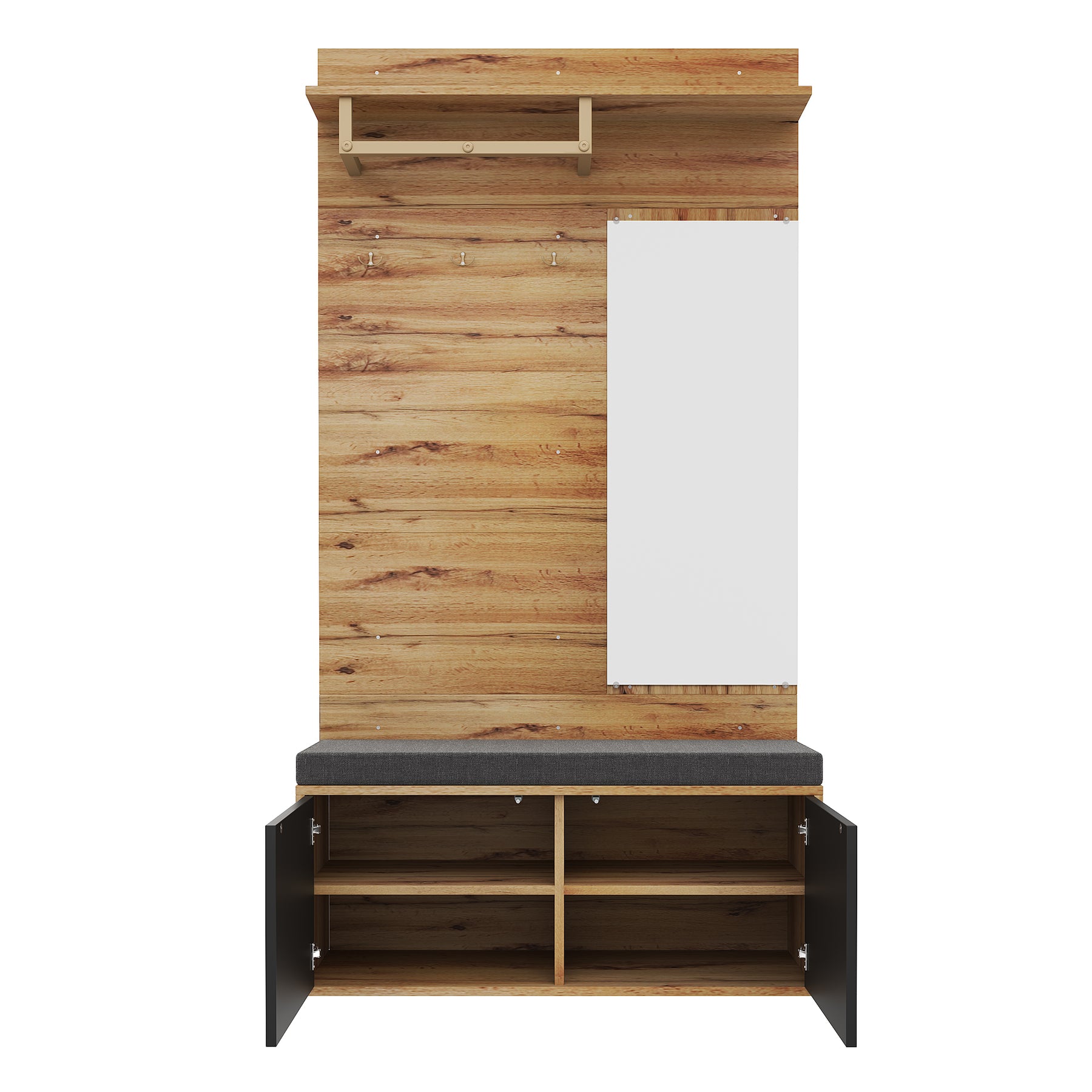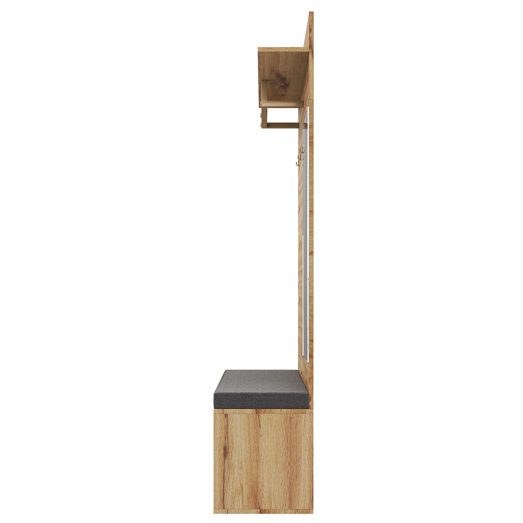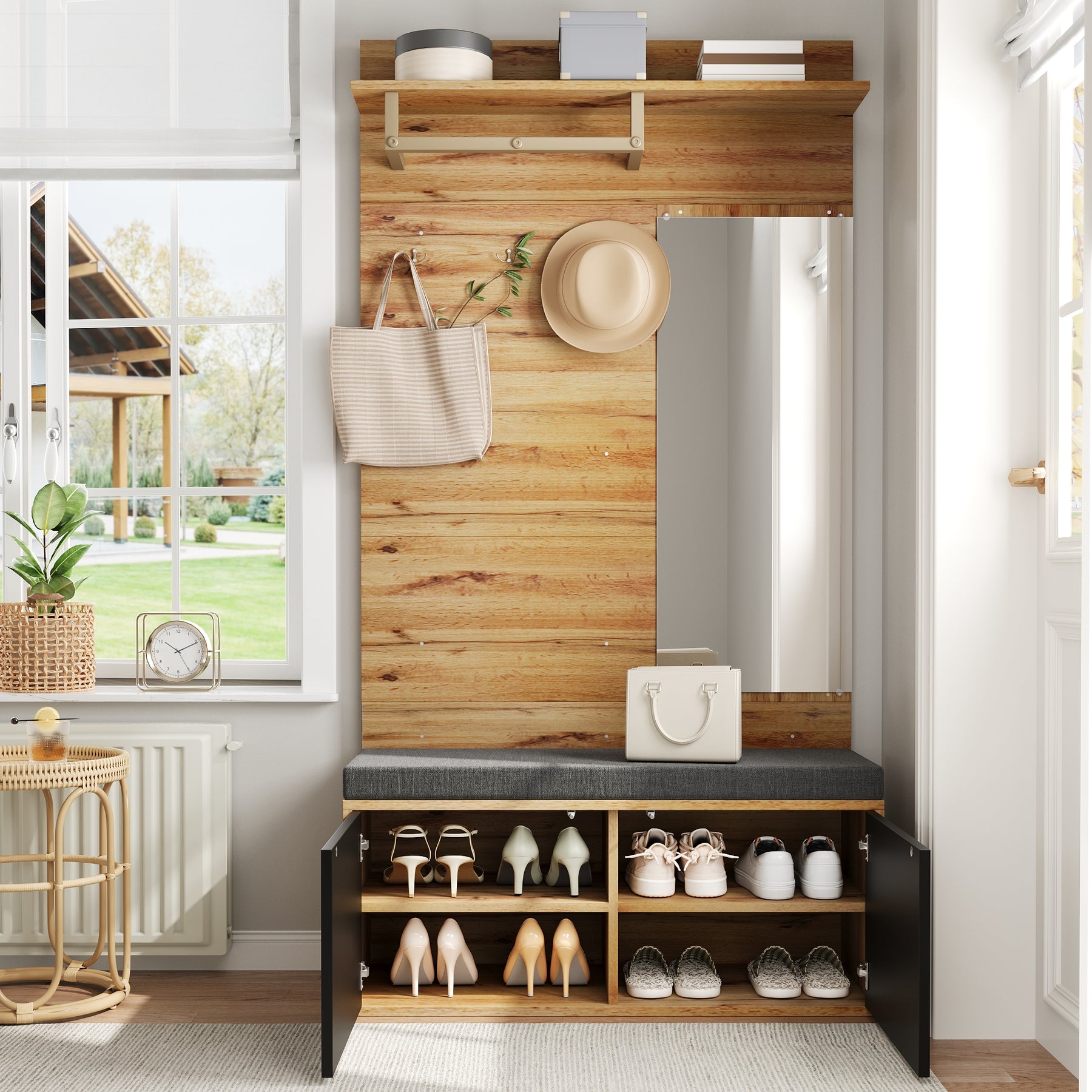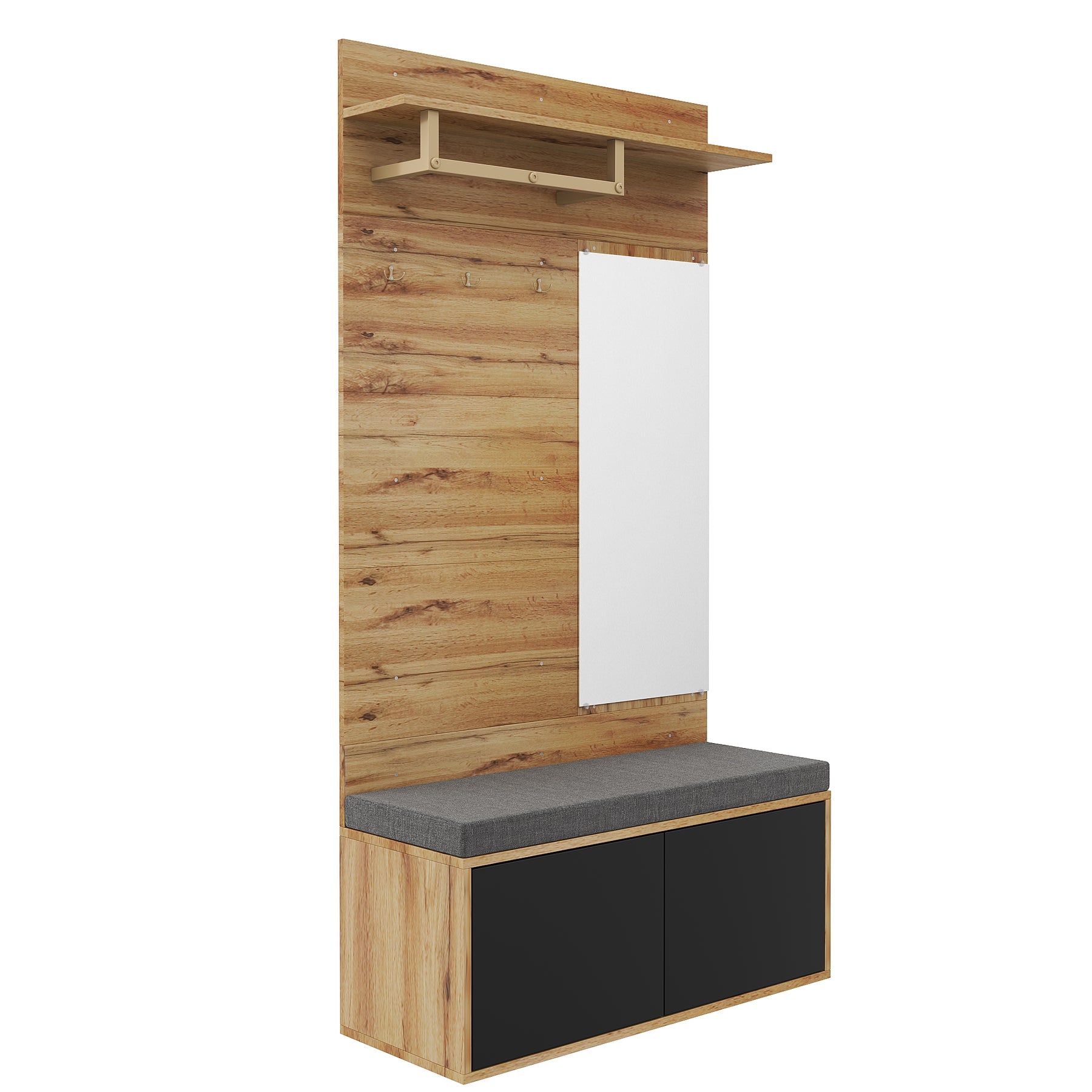 Vestiaire à l'entrée effet bois banc rembourré, miroir, porte-manteaux, miroir et rangement chaussures GALLWASP