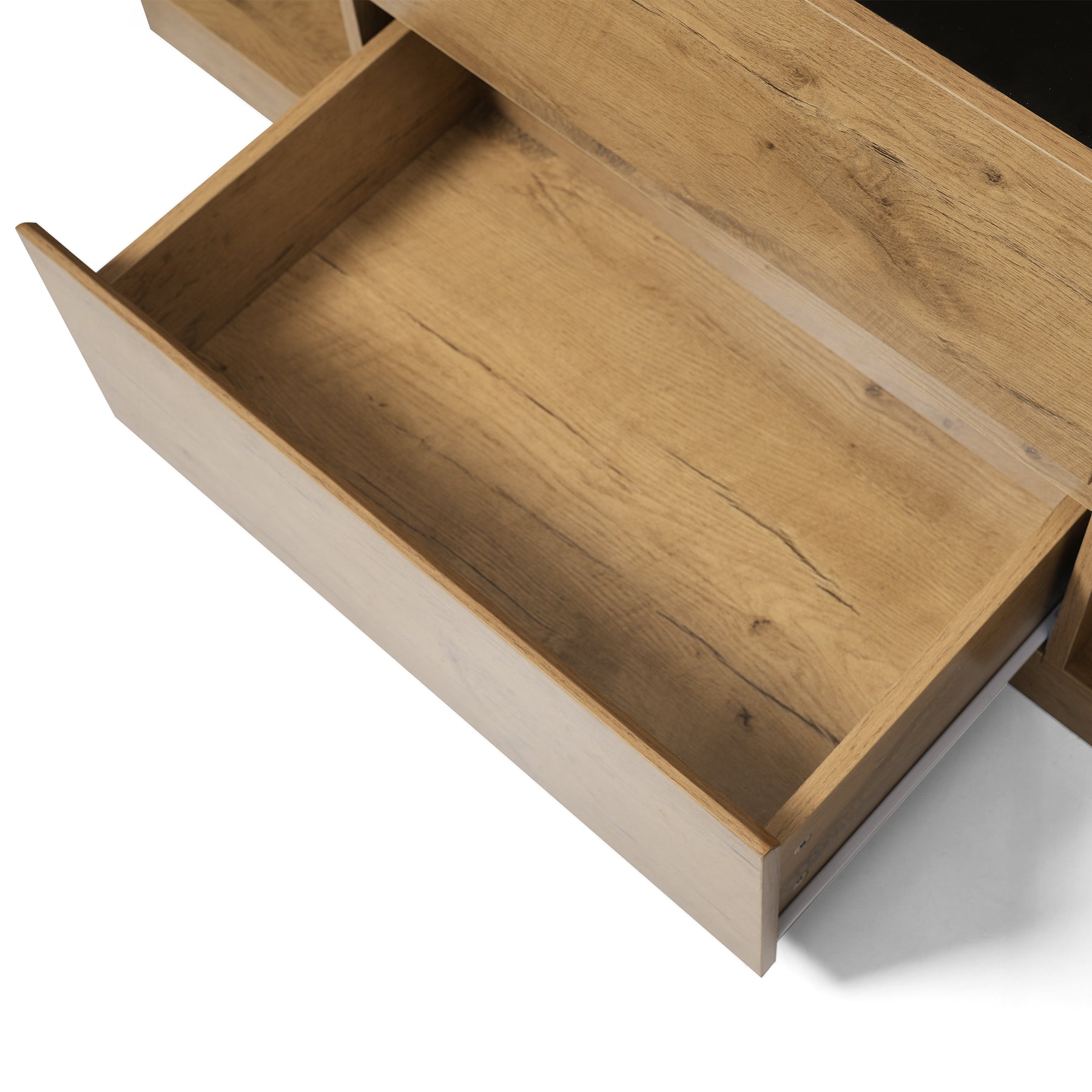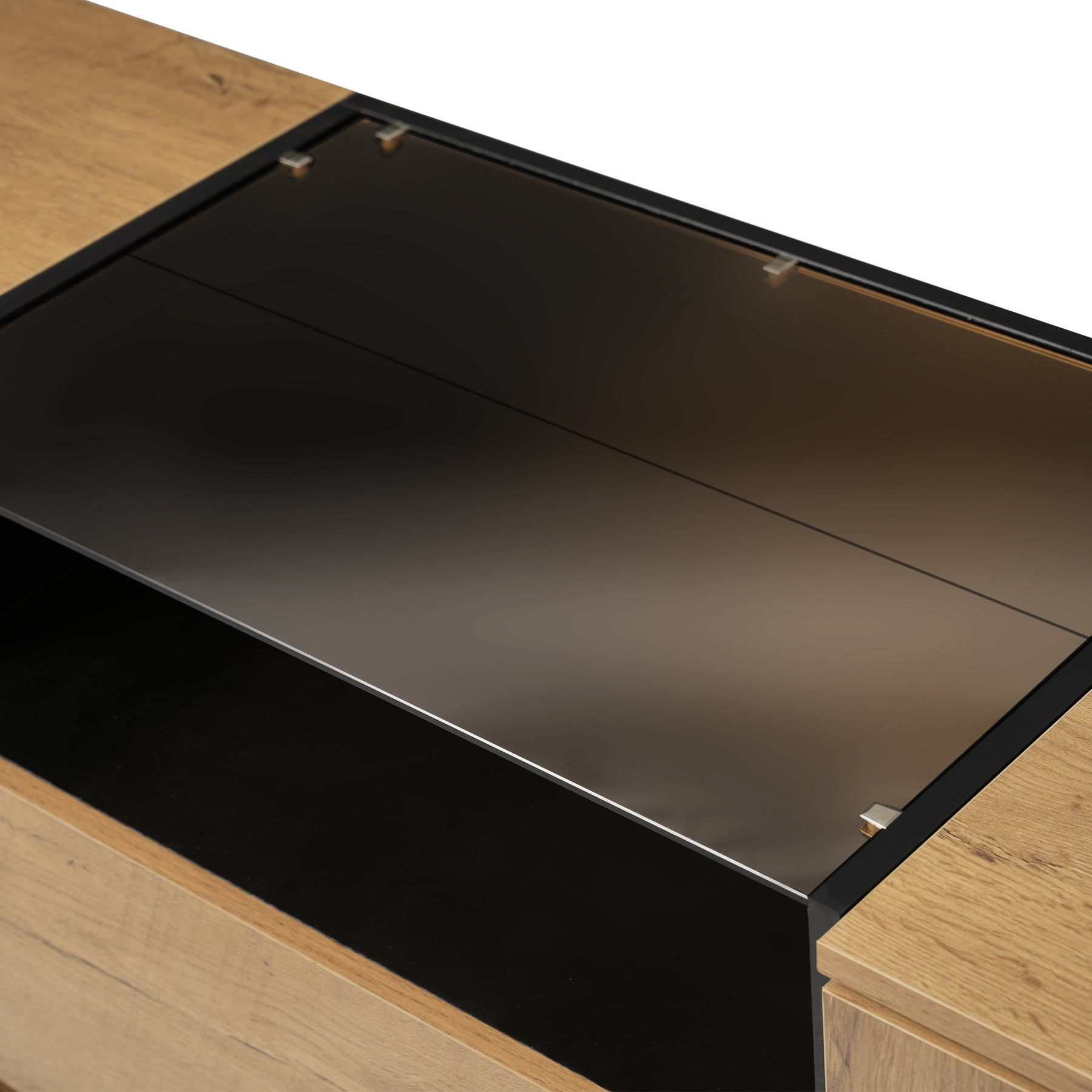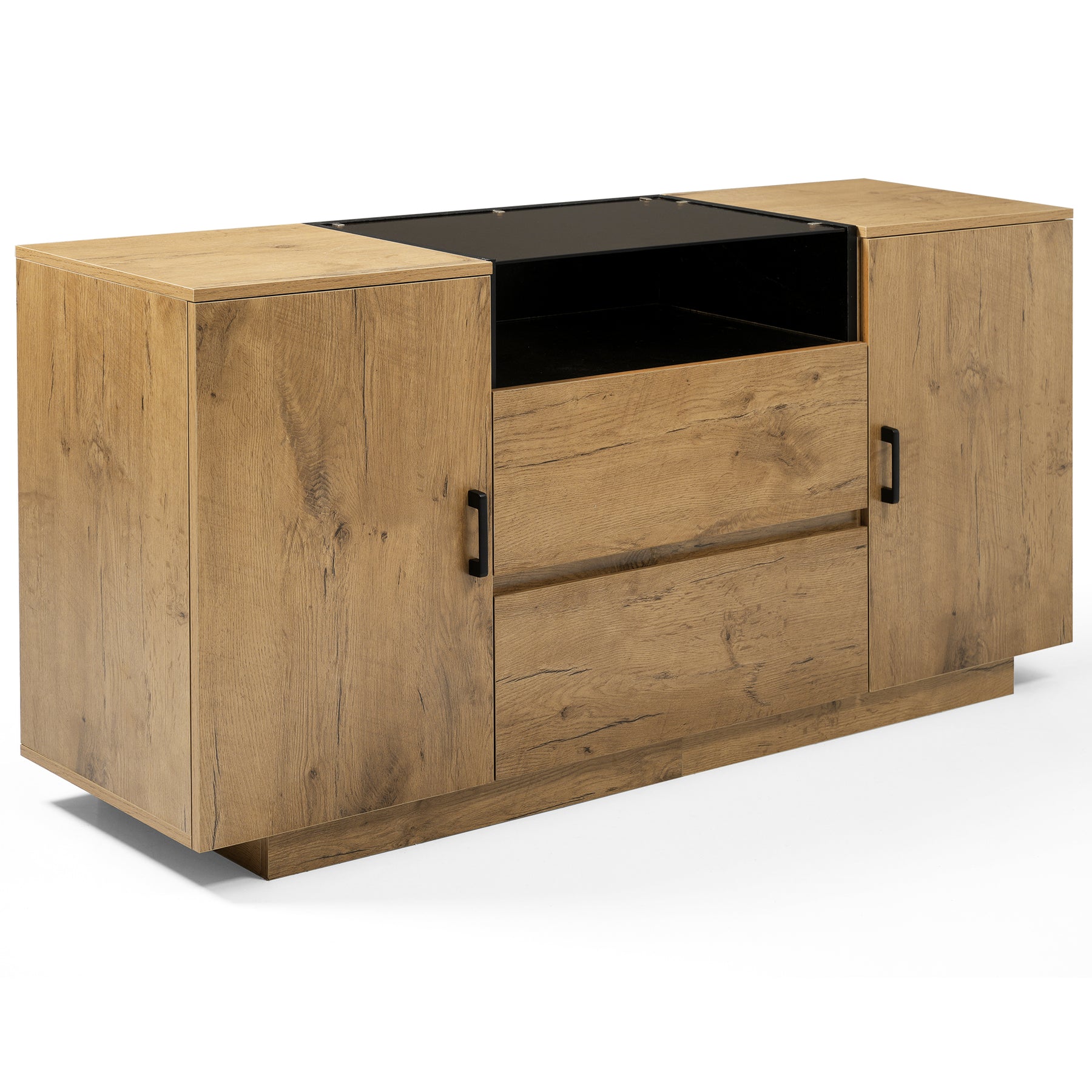 Buffet industriel effet chêne, niche noir et top en verre, 2 portes 2 tiroirs PROTONFEN