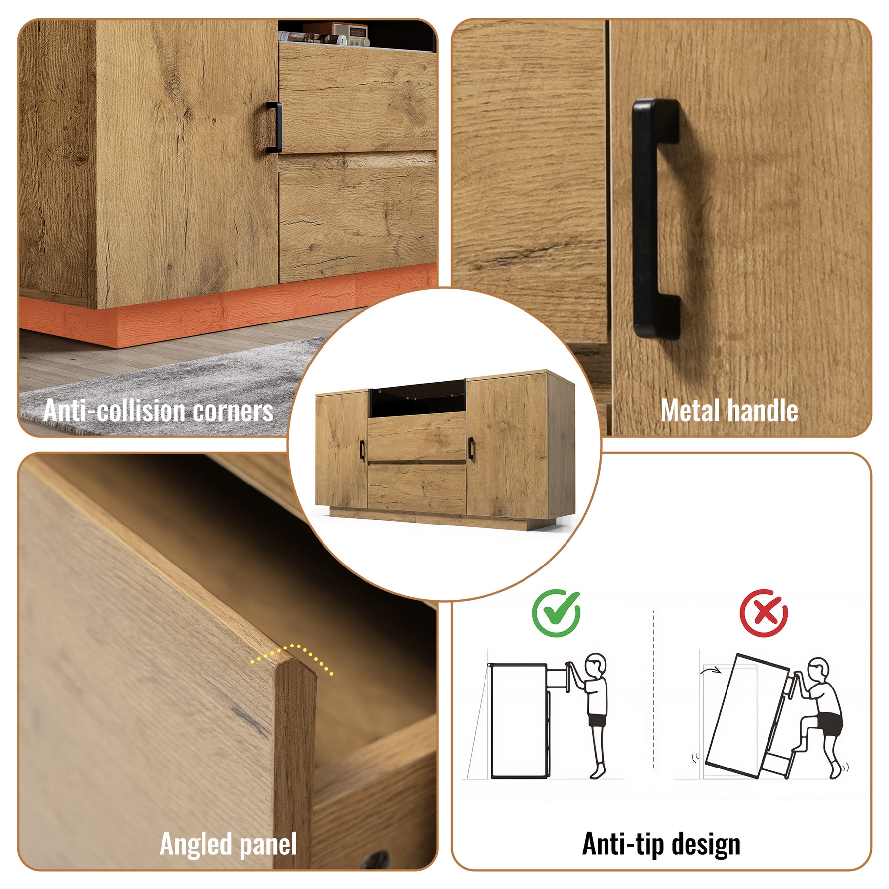• Détails de conception pratiques: Tiroirs avec coupes inclinées pour une ouverture facile et charnières métalliques ajustables pour les portes d'armoires.