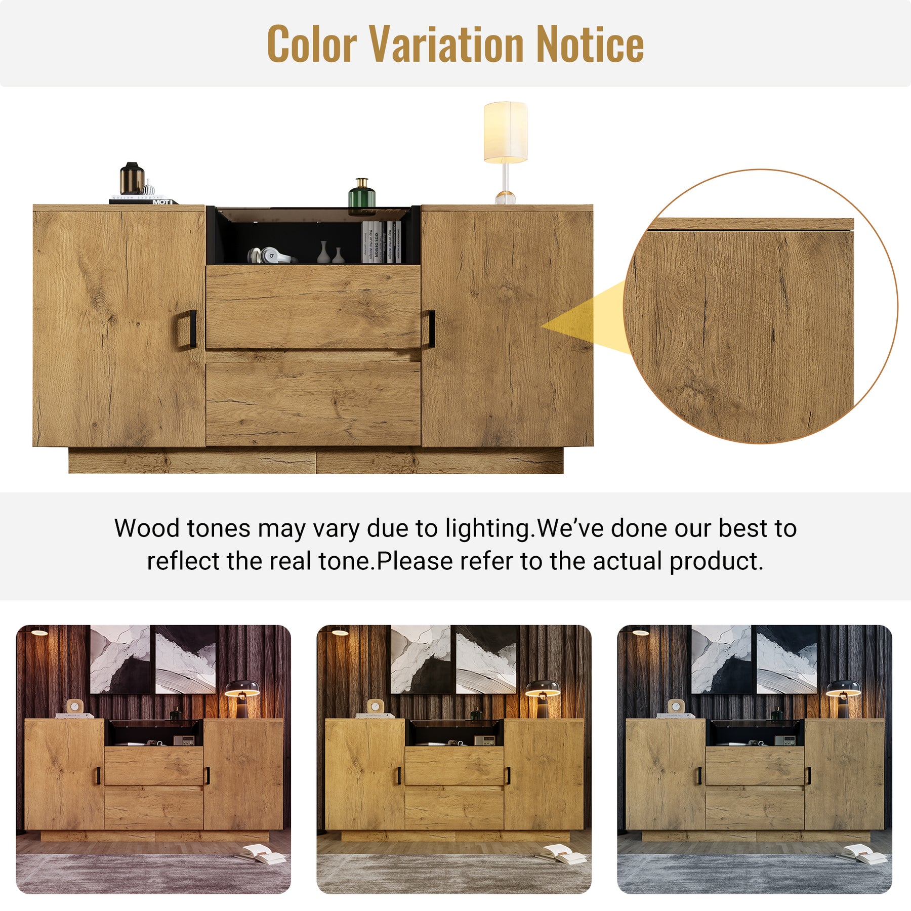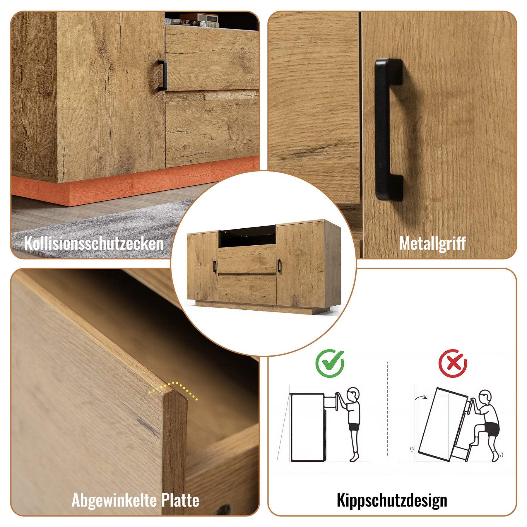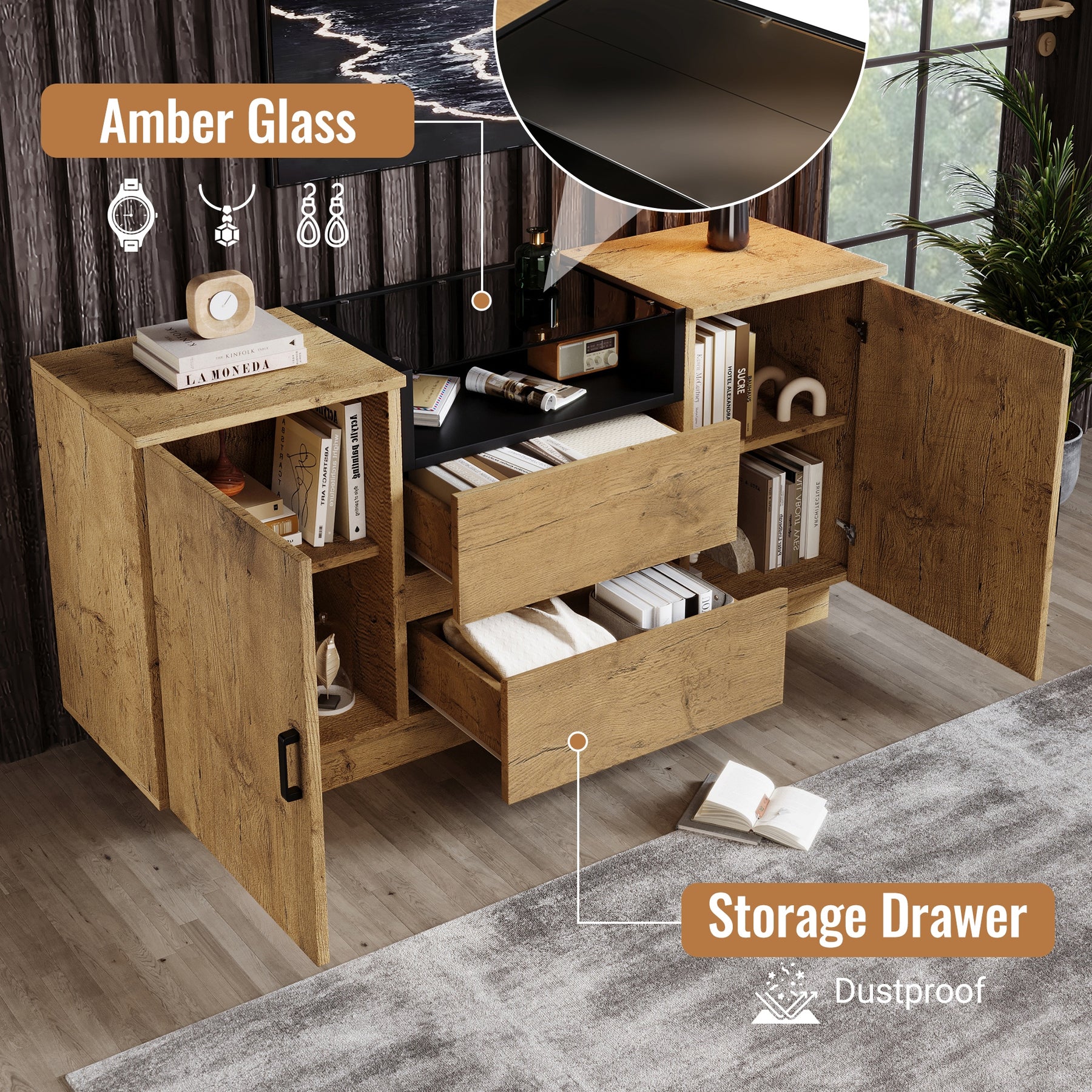 Ce buffet/commode au look industriel rustique se distingue par ses panneaux de haute qualité à finition couleur chêne et ses poignées noires contrastantes. Il combine un design élégant et une grande fonctionnalité de rangement. Il comporte un compartiment central ouvert rehaussé d'une finition intérieure noire pour la décoration, deux tiroirs spacieux en dessous, et deux armoires latérales avec étagères réglables. Sa structure robuste, son dispositif anti-basculement sécurisé et sa base basse réduisant les coins morts en font une solution de rangement polyvalente et hygiénique, idéale pour le salon, la cuisine ou l'entrée.