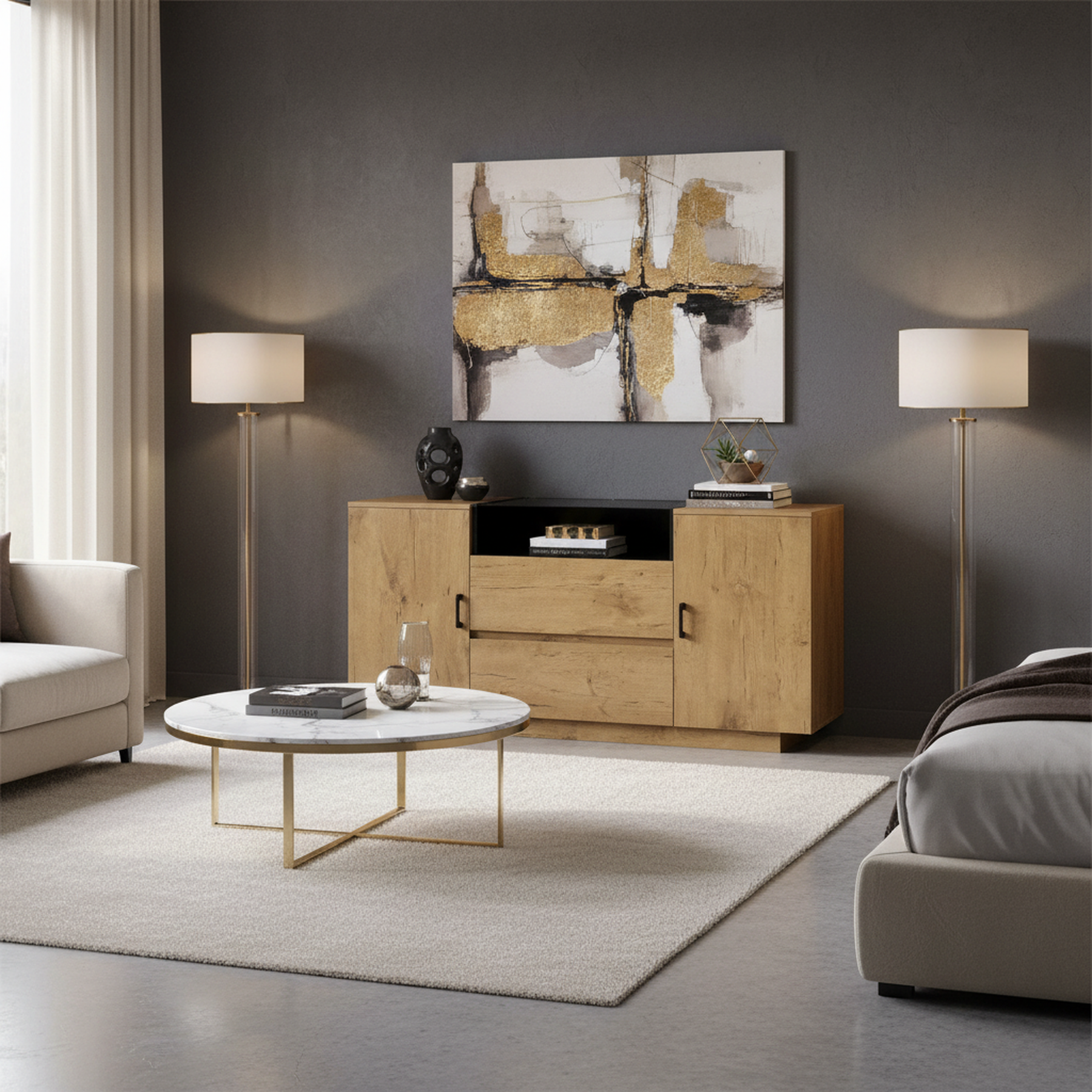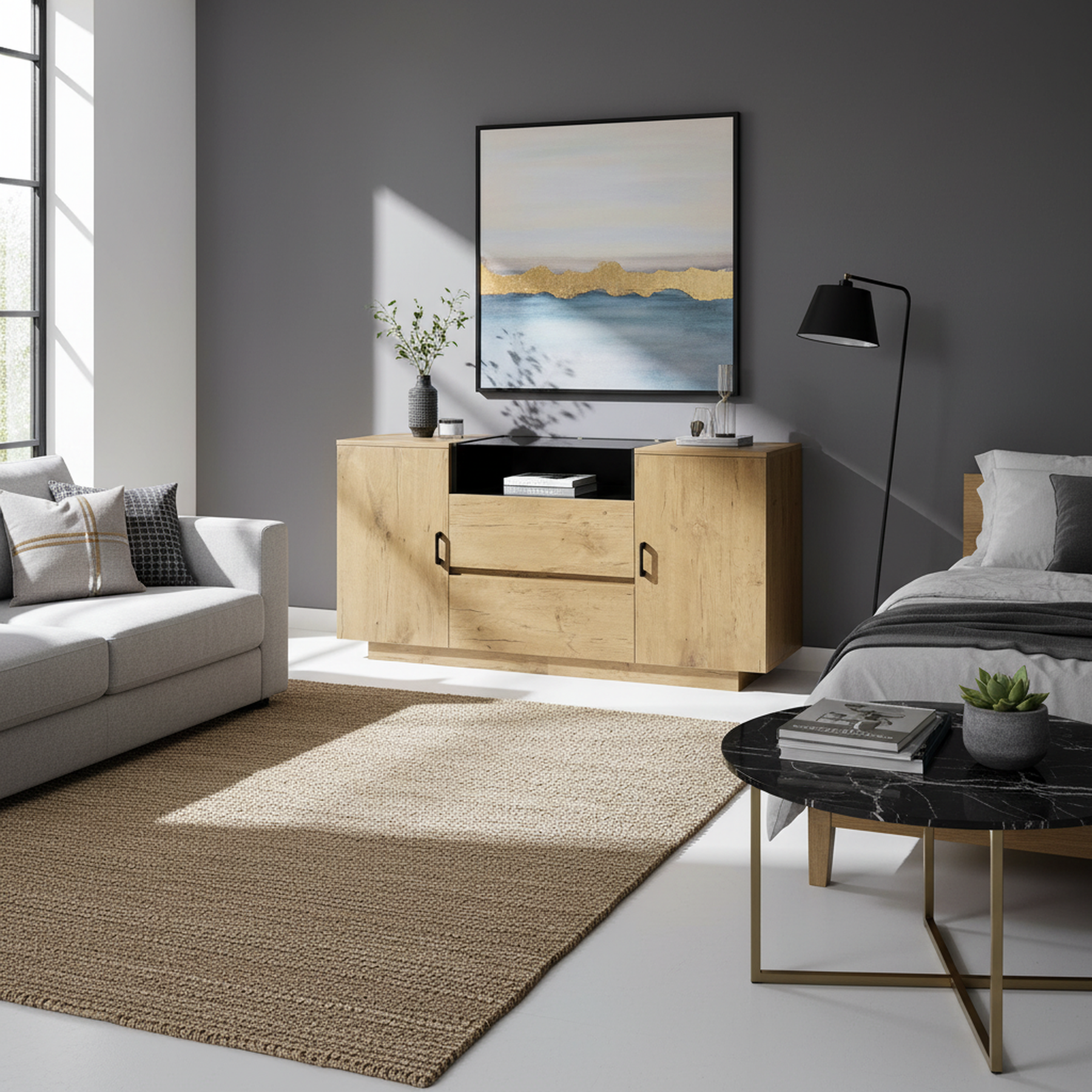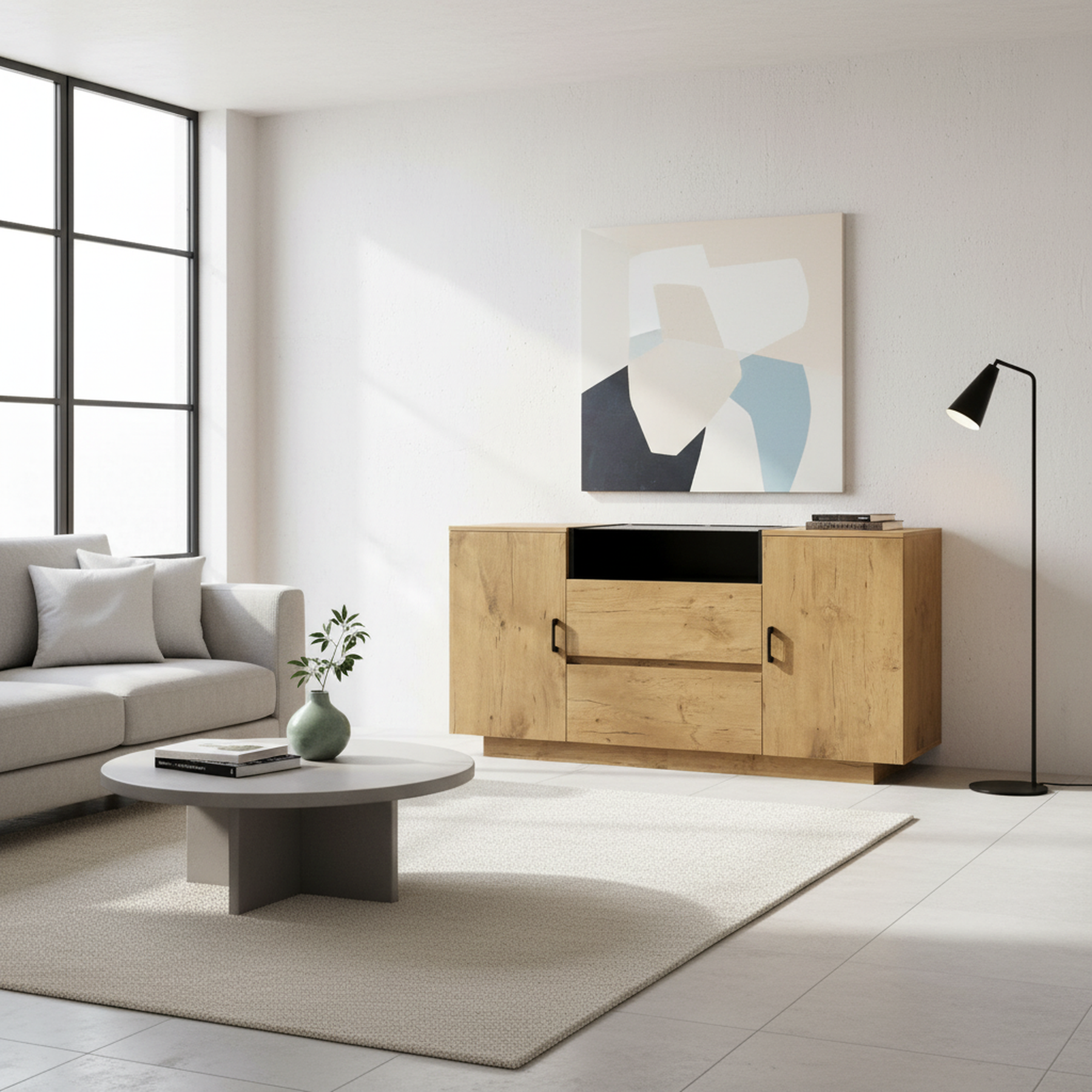 Ce buffet/commode au look industriel rustique se distingue par ses panneaux de haute qualité à finition couleur chêne et ses poignées noires contrastantes. Il combine un design élégant et une grande fonctionnalité de rangement. Il comporte un compartiment central ouvert rehaussé d'une finition intérieure noire pour la décoration, deux tiroirs spacieux en dessous, et deux armoires latérales avec étagères réglables. Sa structure robuste, son dispositif anti-basculement sécurisé et sa base basse réduisant les coins morts en font une solution de rangement polyvalente et hygiénique, idéale pour le salon, la cuisine ou l'entrée.