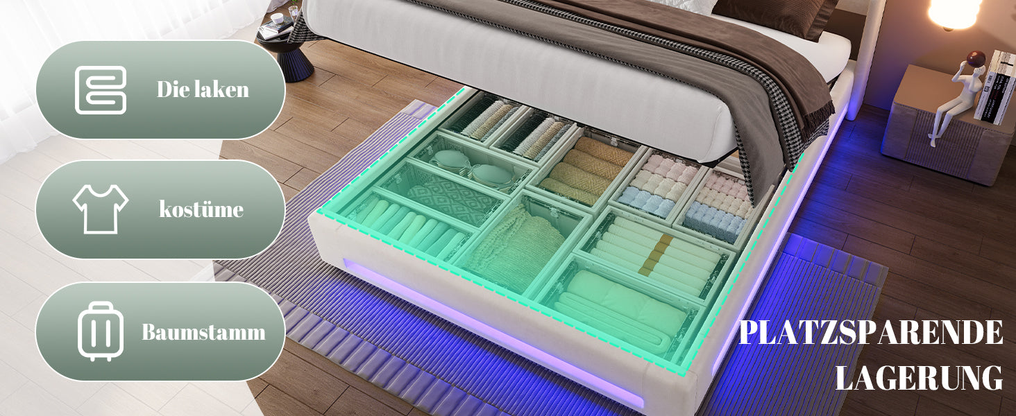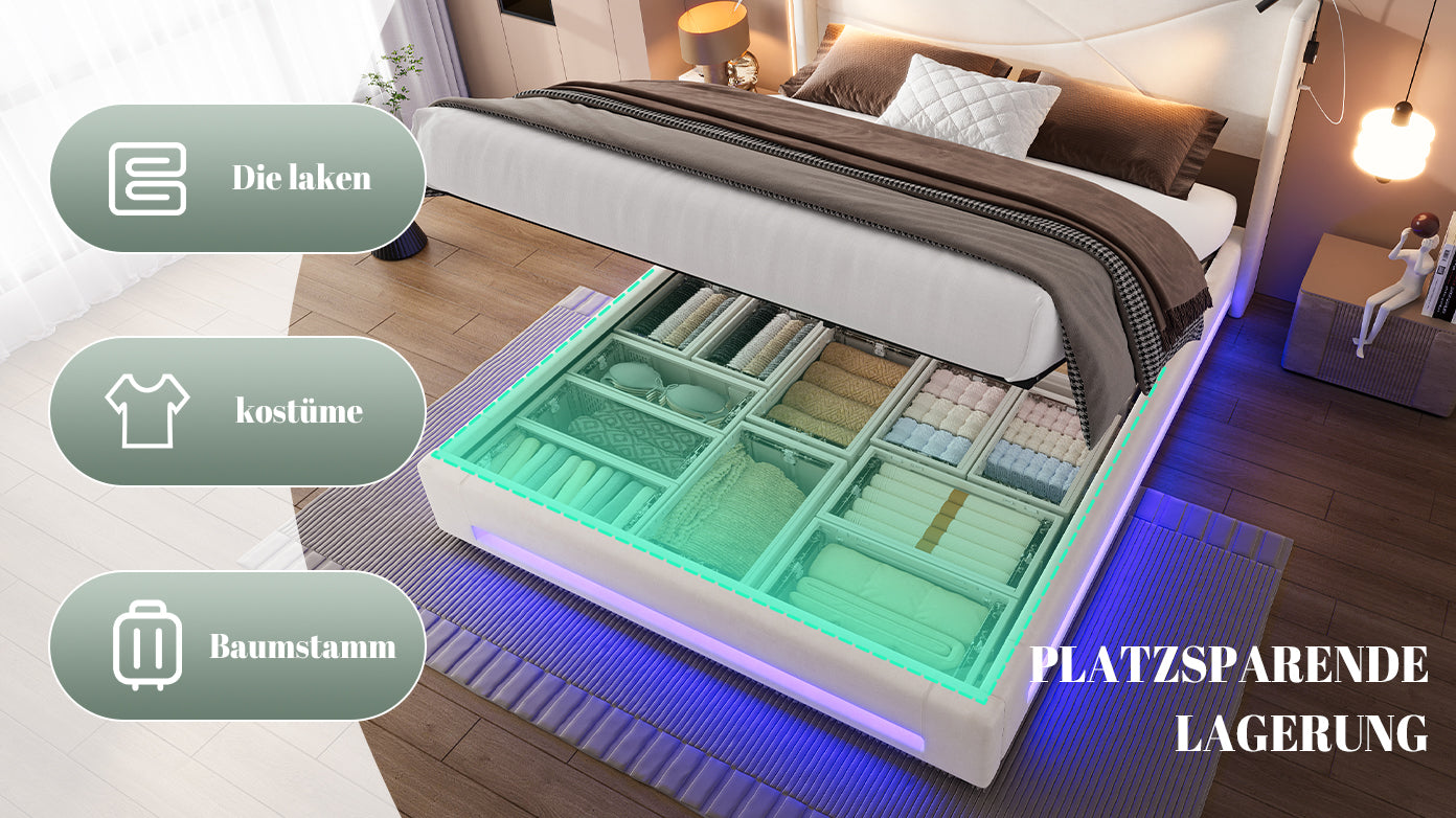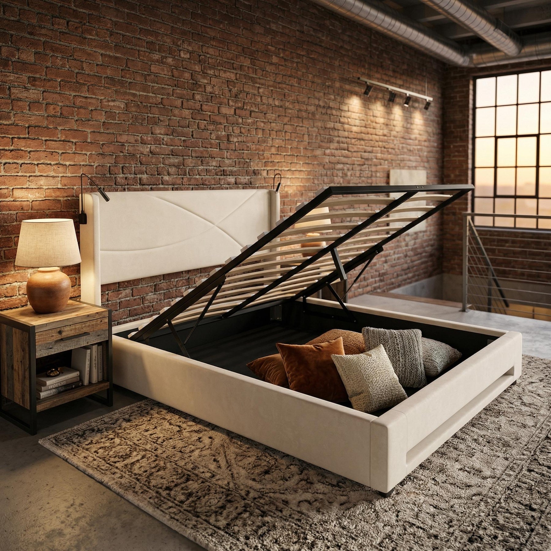 Grâce au système hydraulique, soulevez facilement le sommier pour accéder à un vaste espace de rangement caché. Fini le désordre : rangez couettes, oreillers ou vêtements hors saison en toute simplicité.