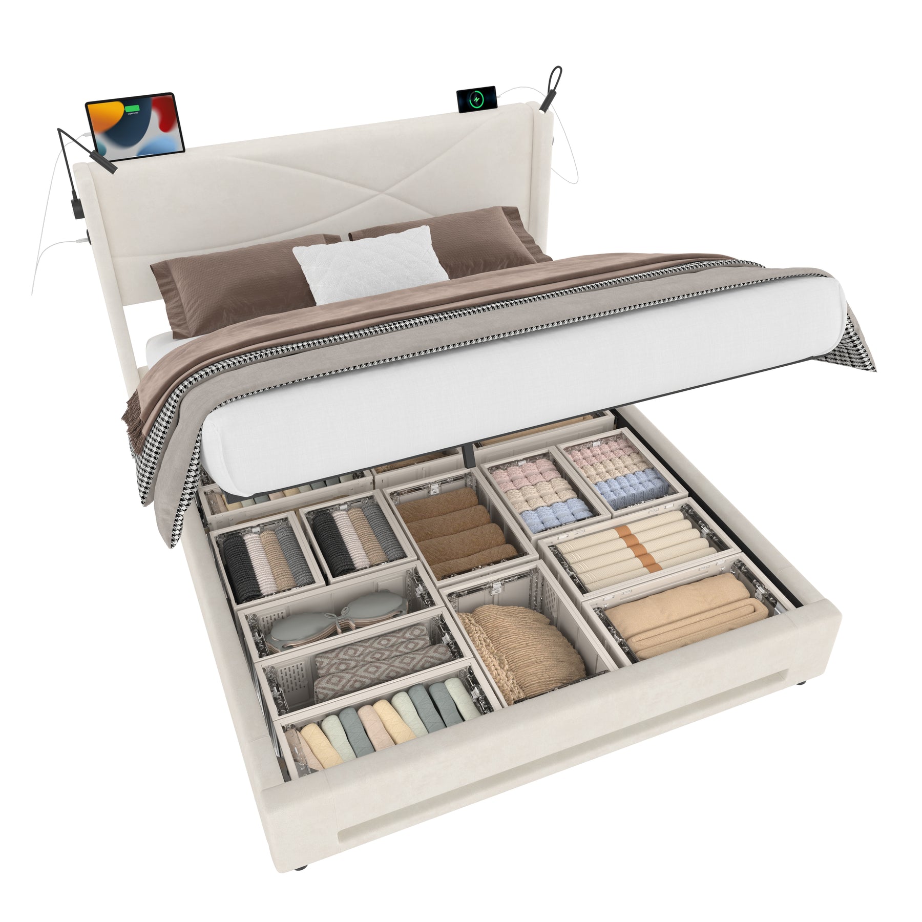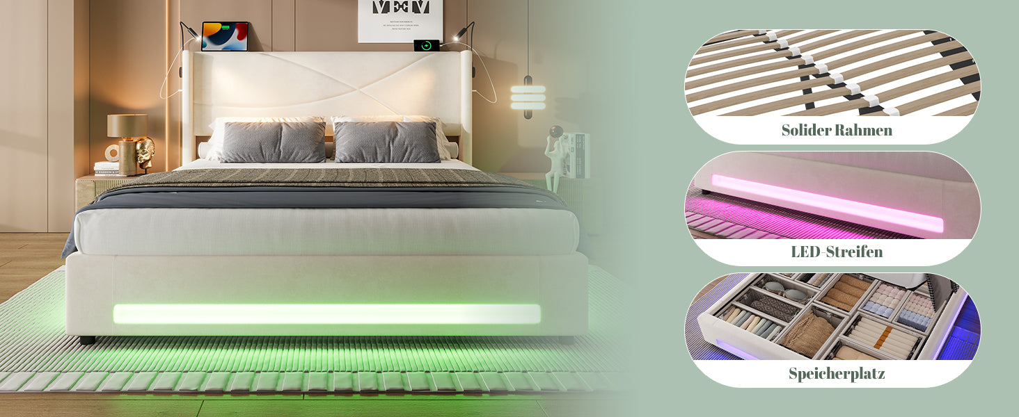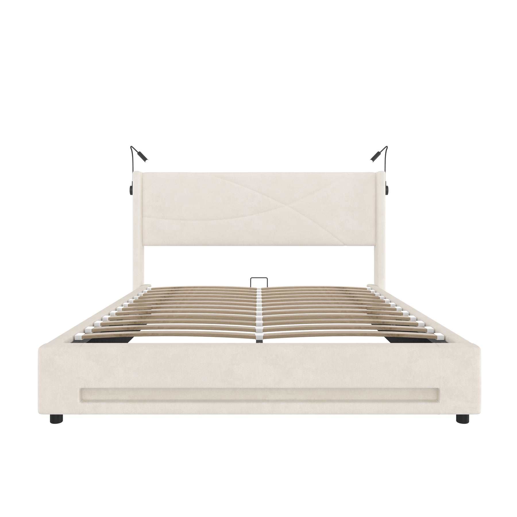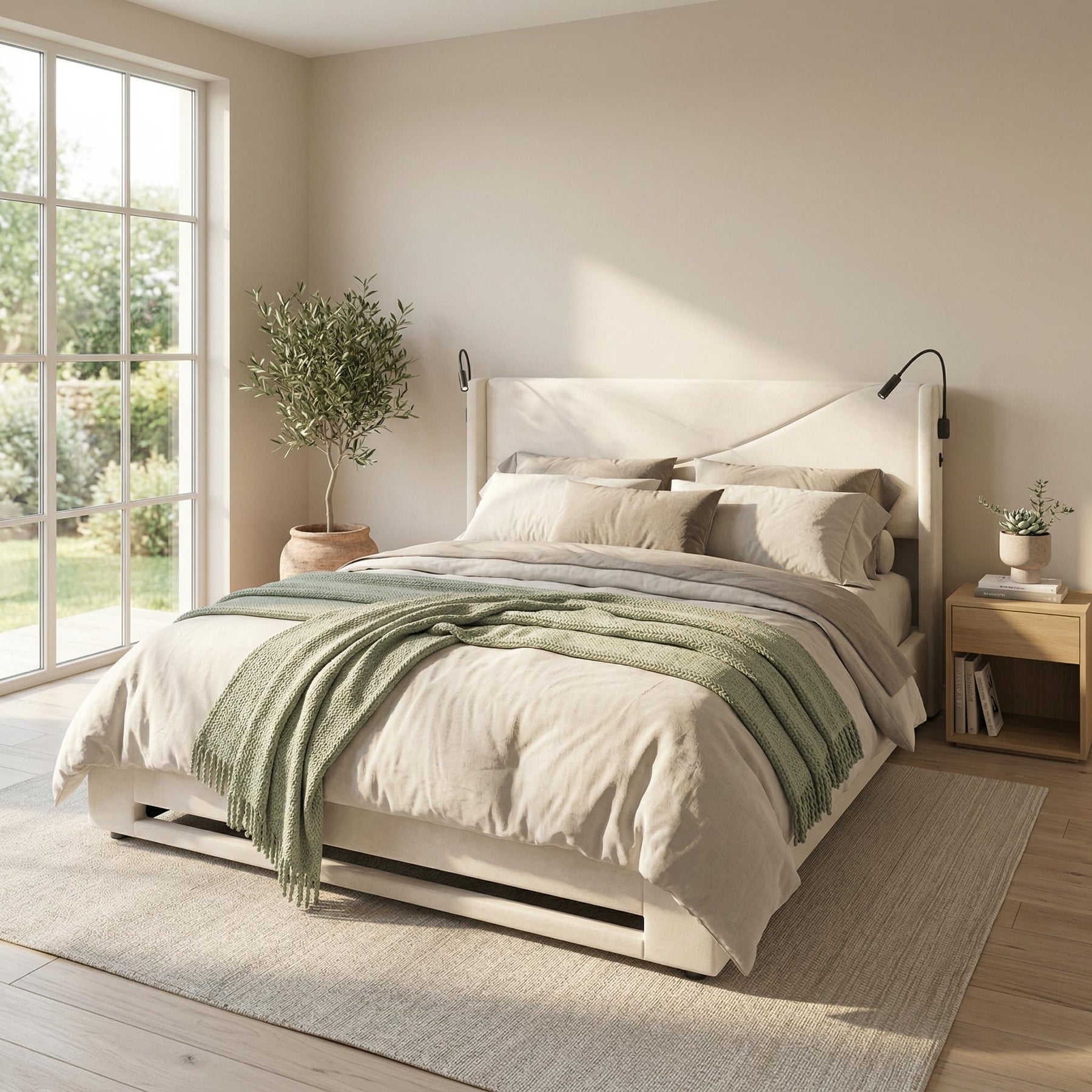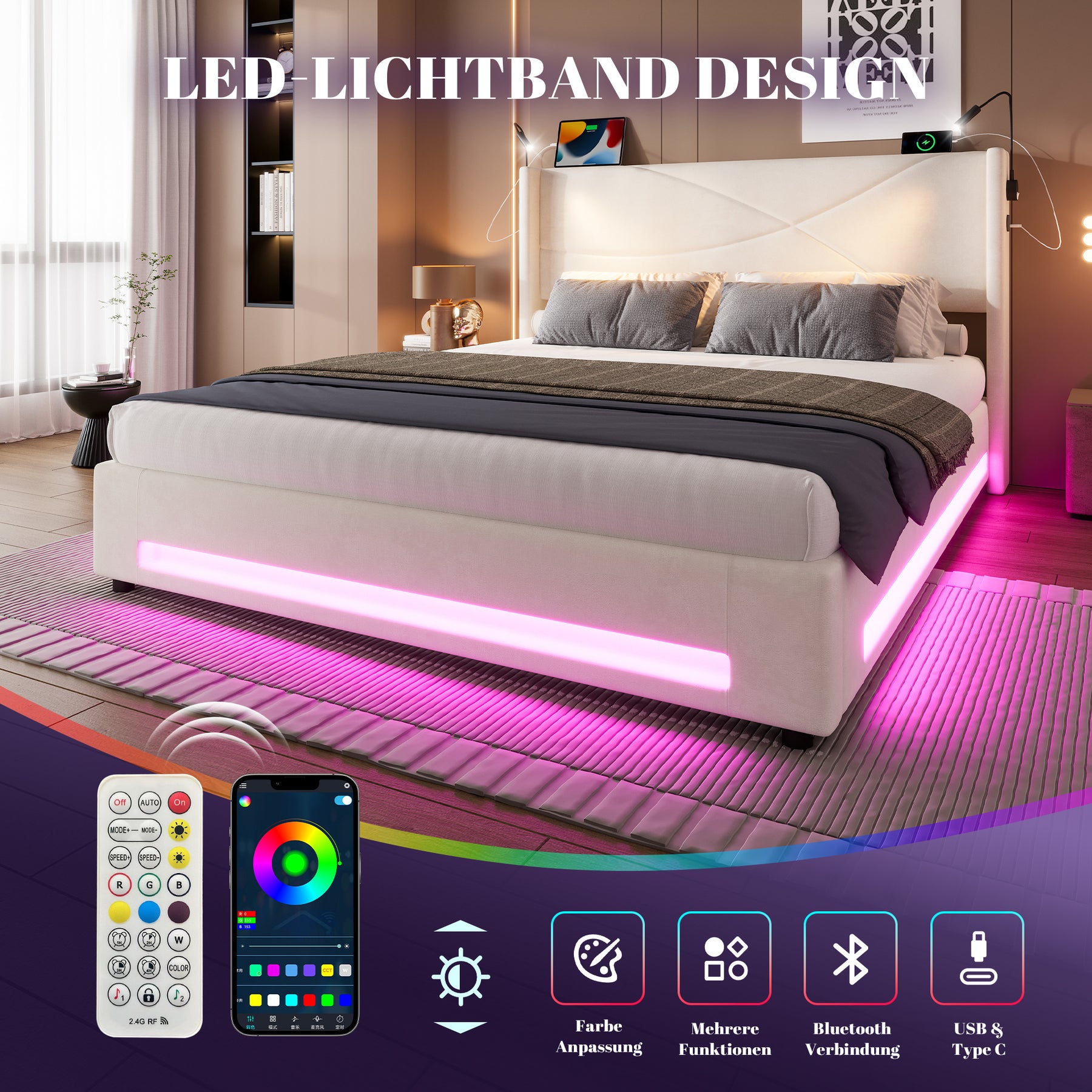 Lit double coffre velours beige avec LED, lampes de lecture et Ports USB 140x200cm VERTEXVALTHYN