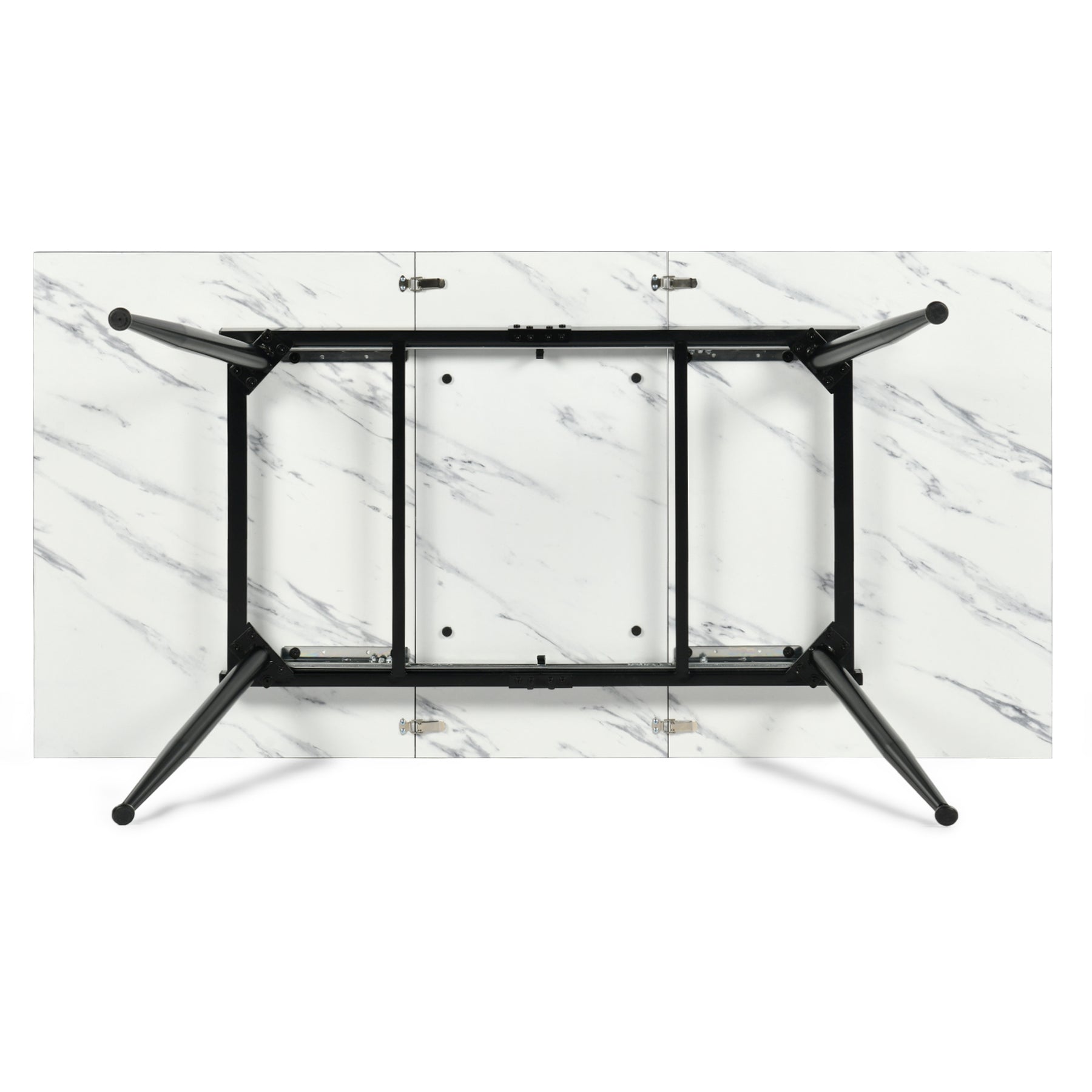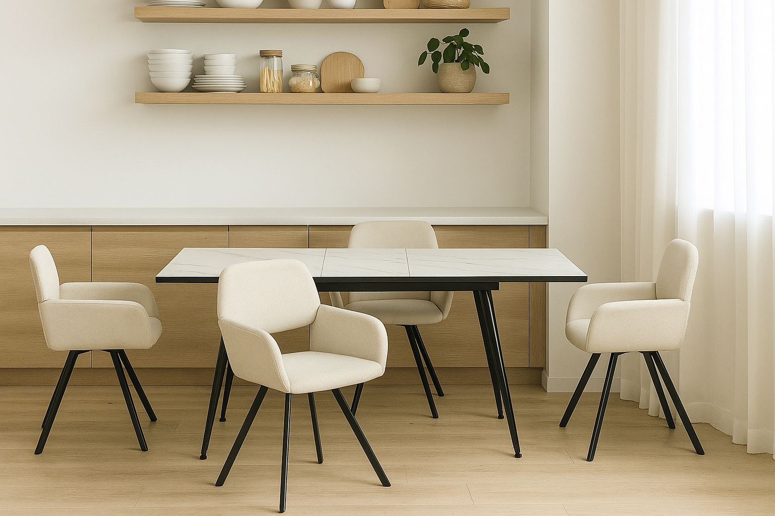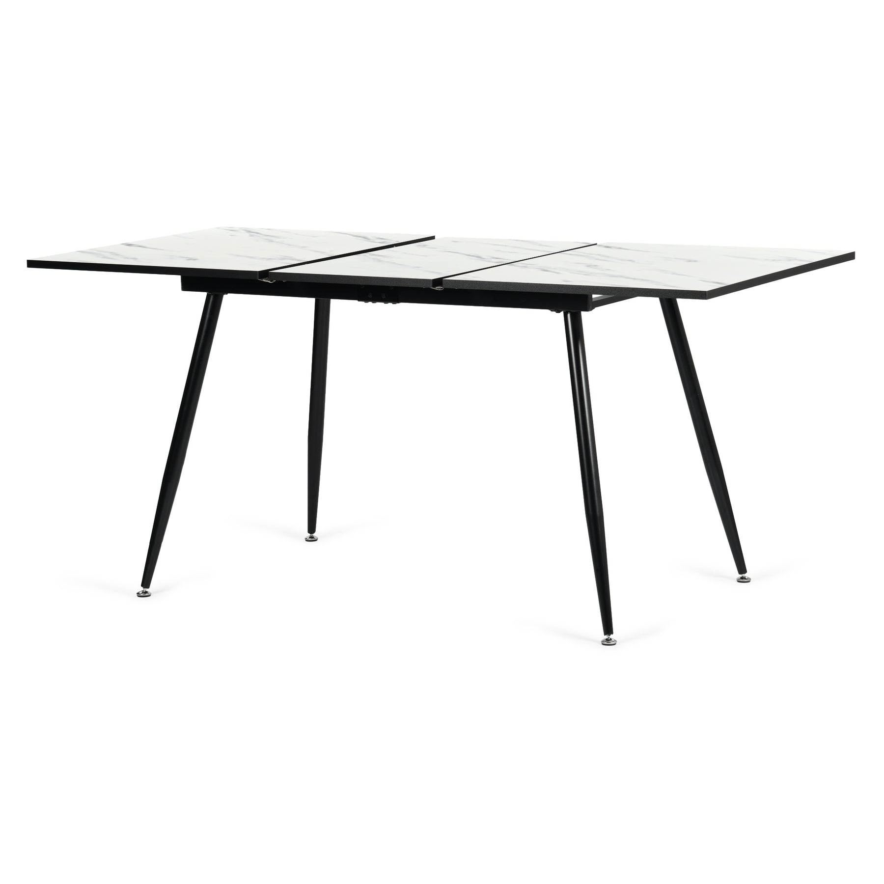 Ensemble table extensible effet marbre blanche 120-160 et 4 chaises pivotantes tissu beige WHALEN WHITE MARBLE STRETCH TABLE BLACK LEG+CALIFORNIA KD BEIGE SWIVEL*2