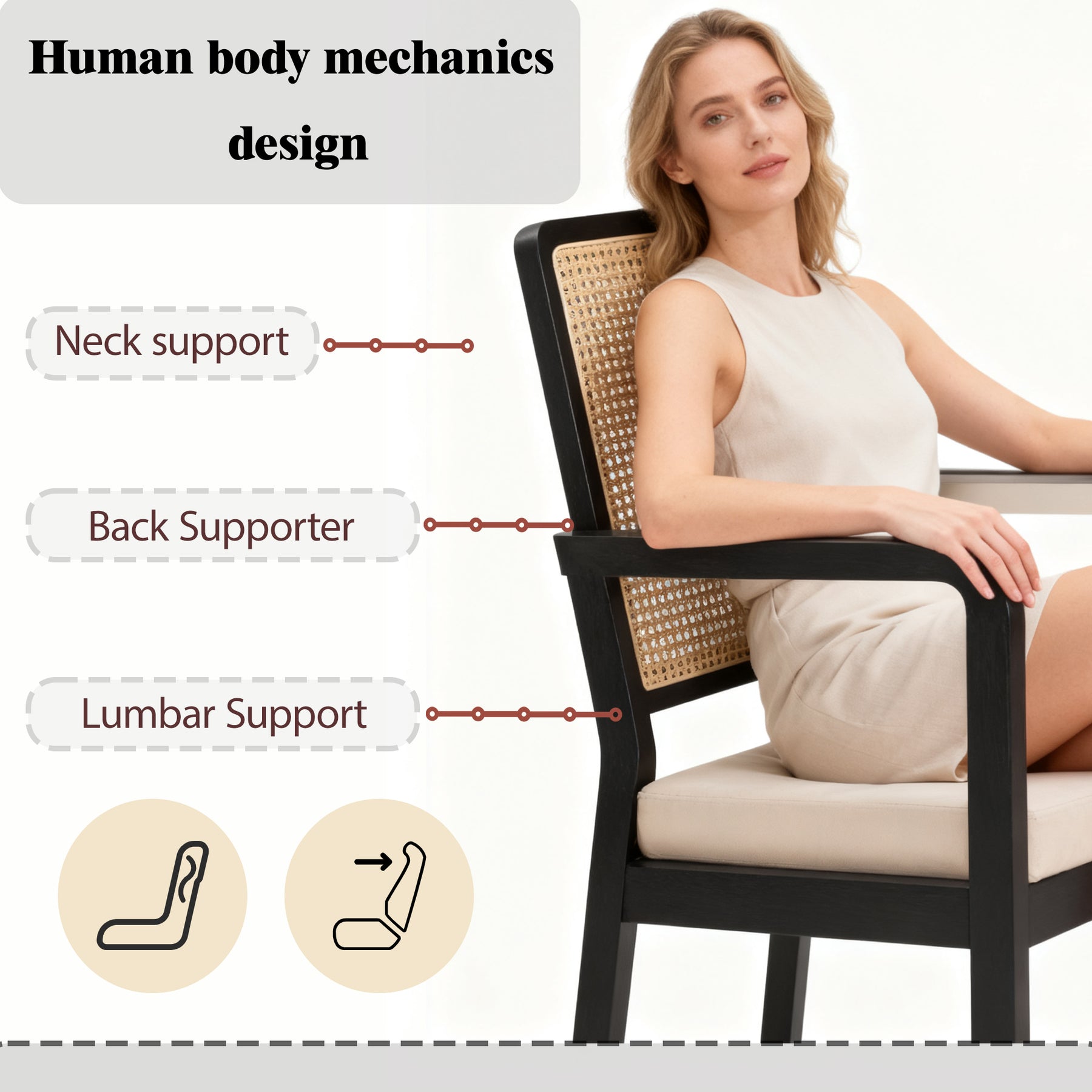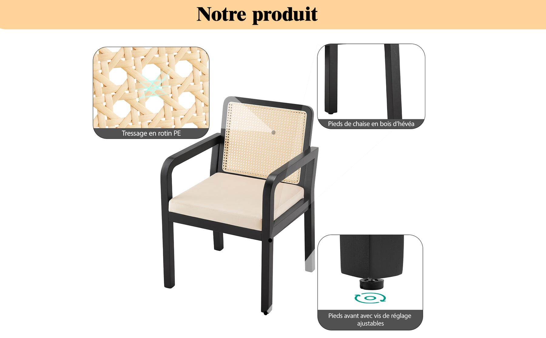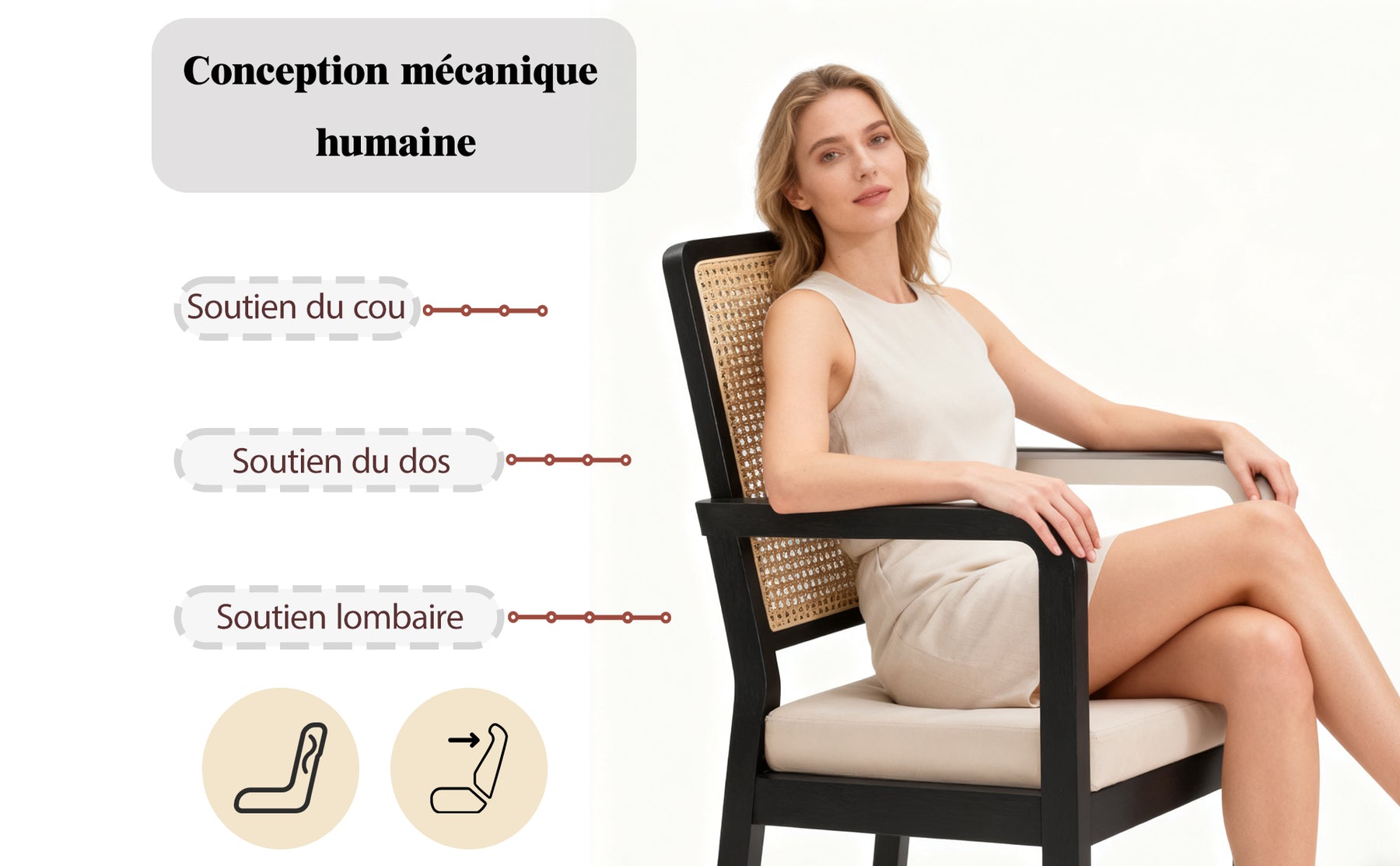 • Artisanat Authentique : Dossier en cannage véritable tressé à la main, offrant une excellente respirabilité et un charme vintage intemporel.