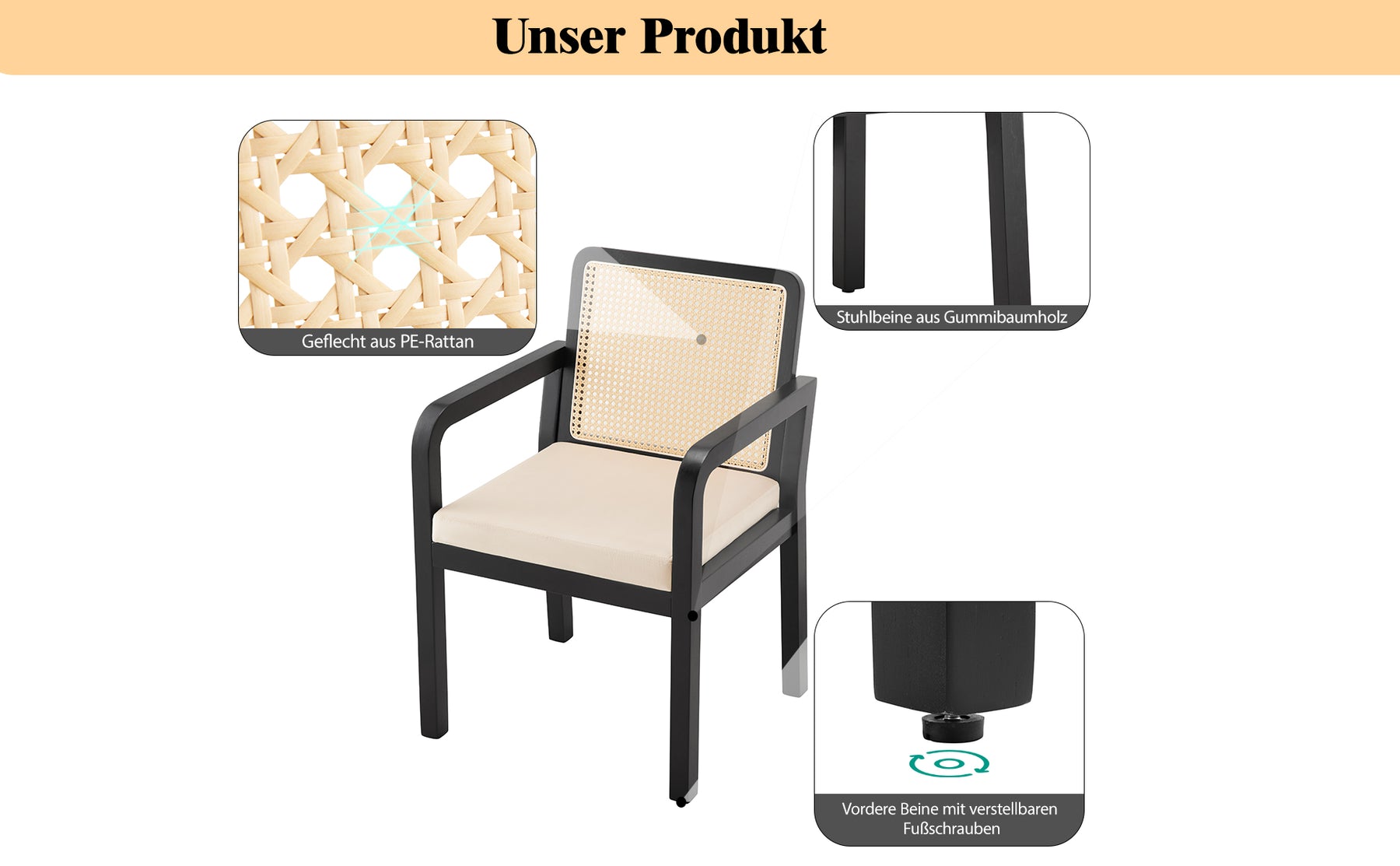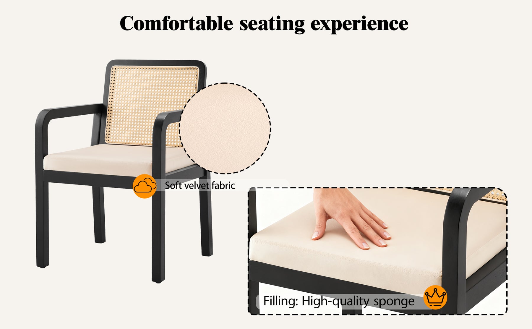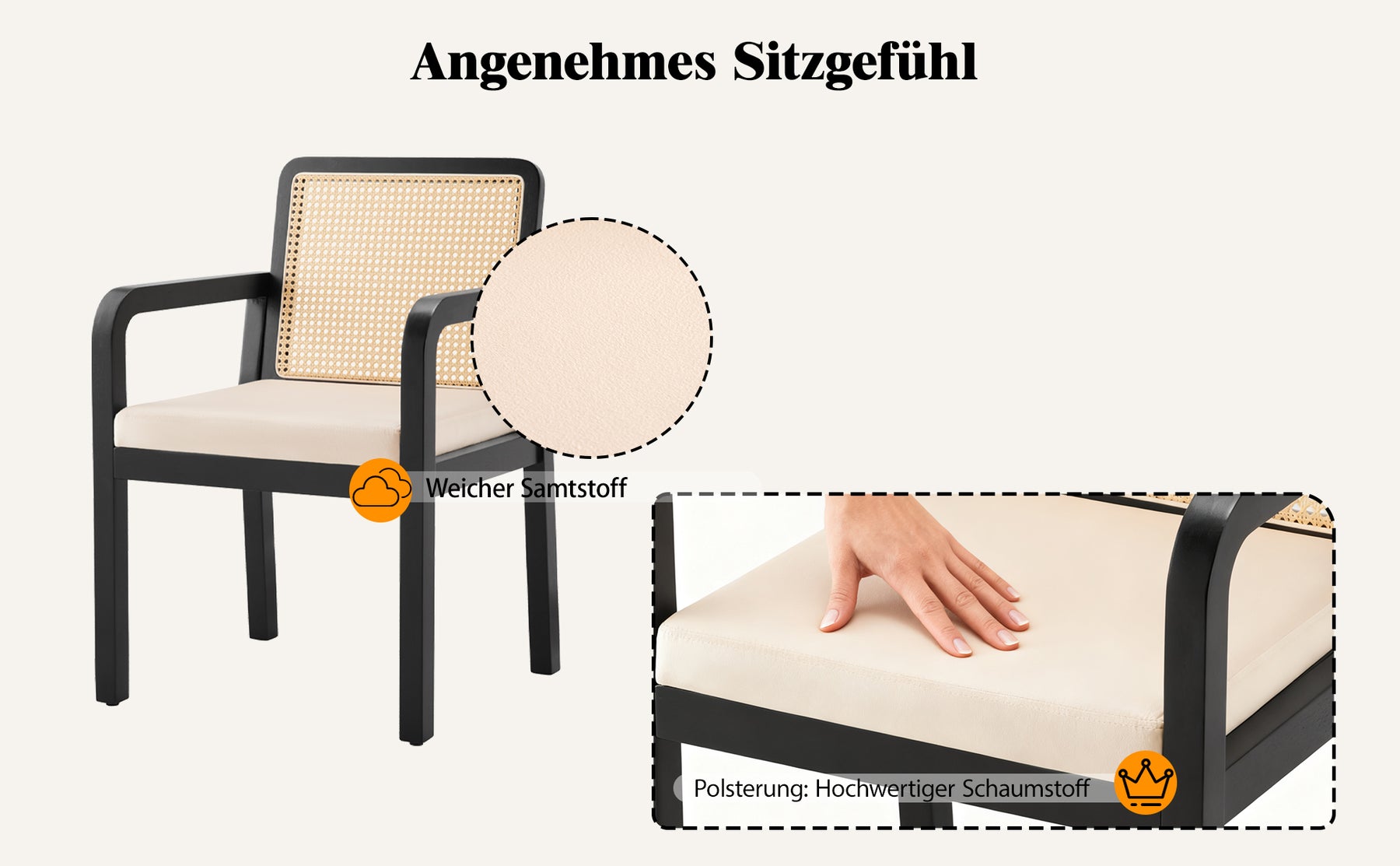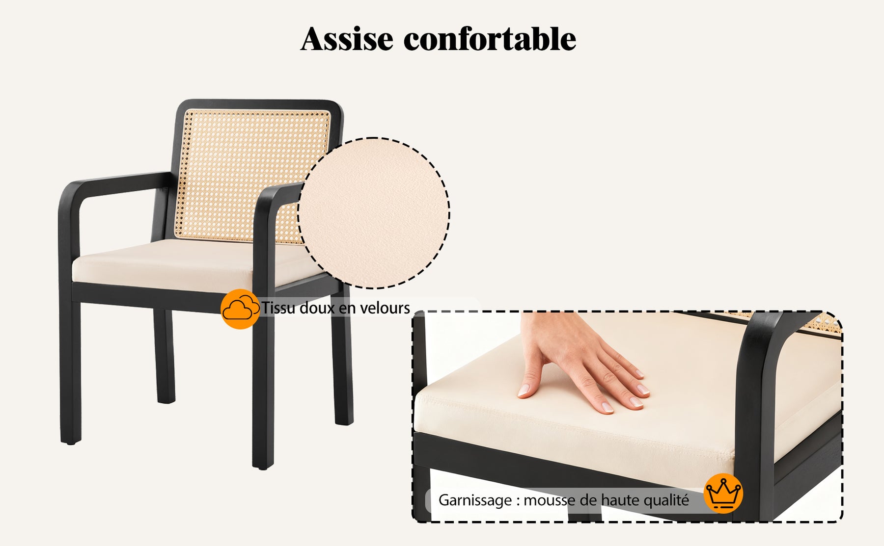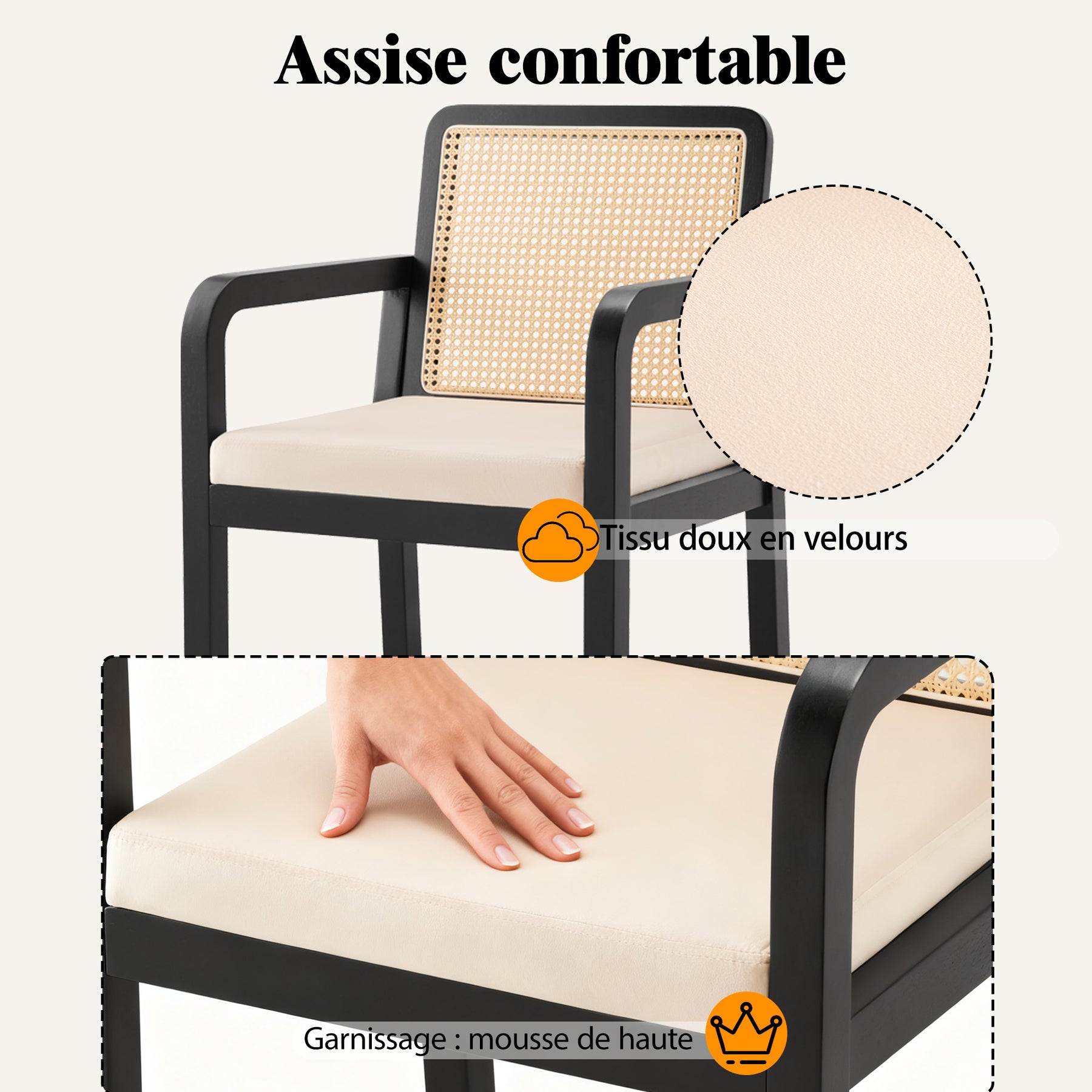 • Matériau : Velours, rattan PE, pieds en hévéa massif