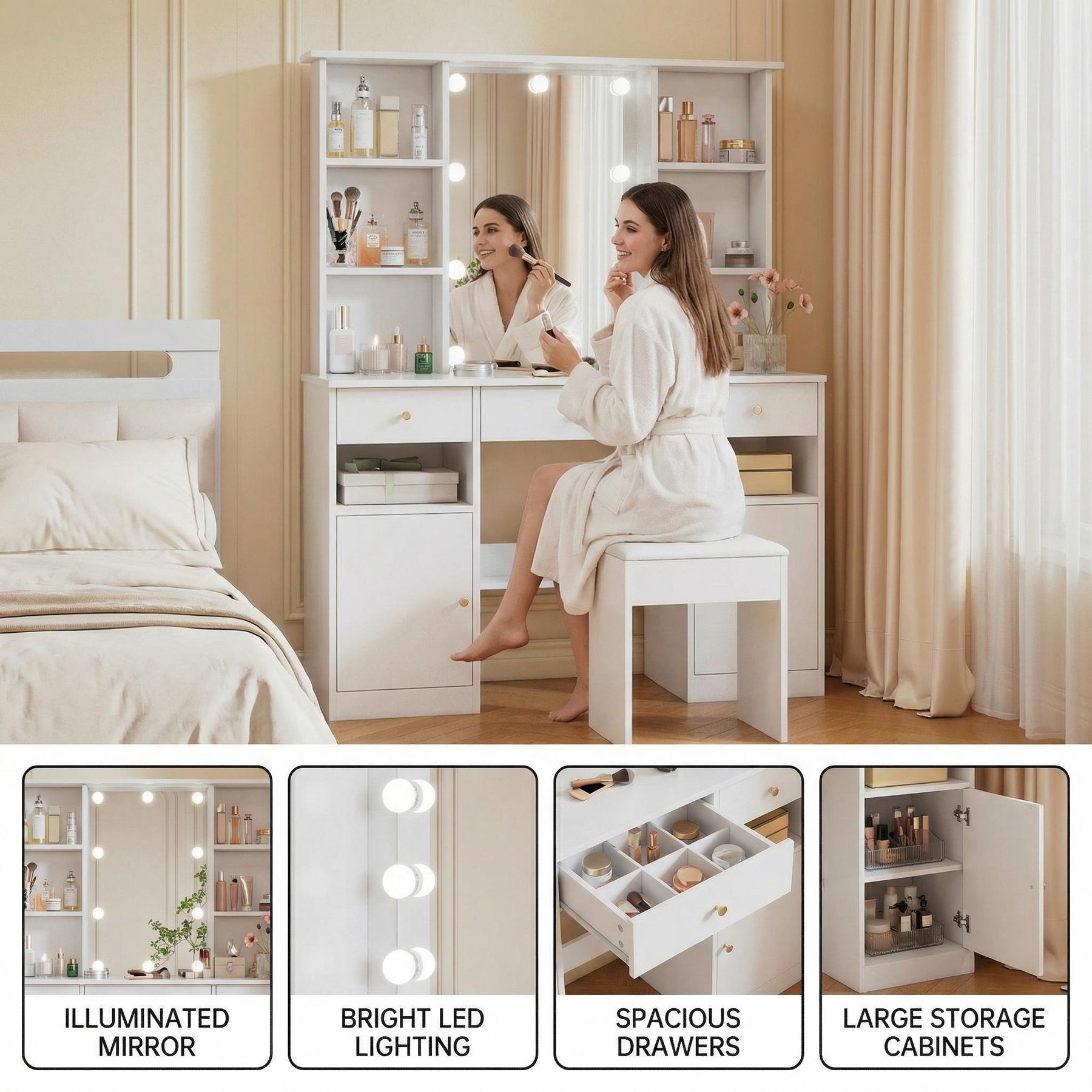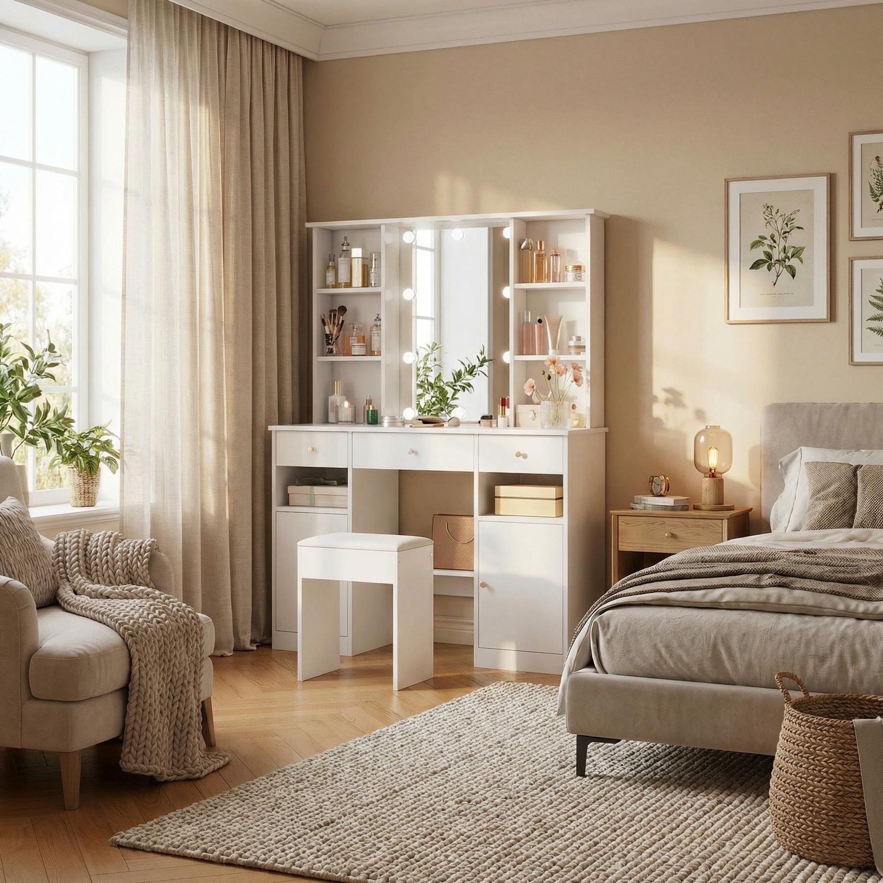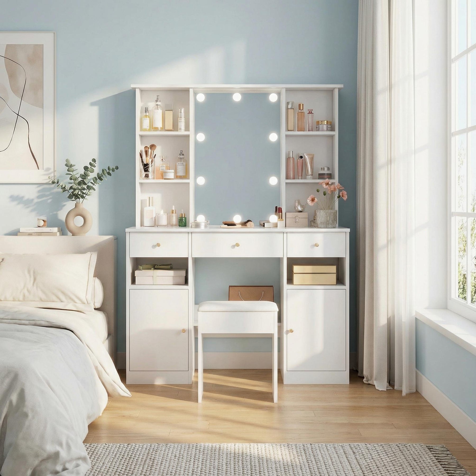 Imaginez-vous chaque matin dans votre chambre, assise devant cette élégante coiffeuse blanche, baignée d'une lumière LED réglable qui sublime votre routine beauté. Grâce à son grand miroir de 45x60 cm entouré de 10 ampoules à intensité et température variables, vous profitez d’un éclairage professionnel digne des loges hollywoodiennes, parfait pour un maquillage précis à toute heure.