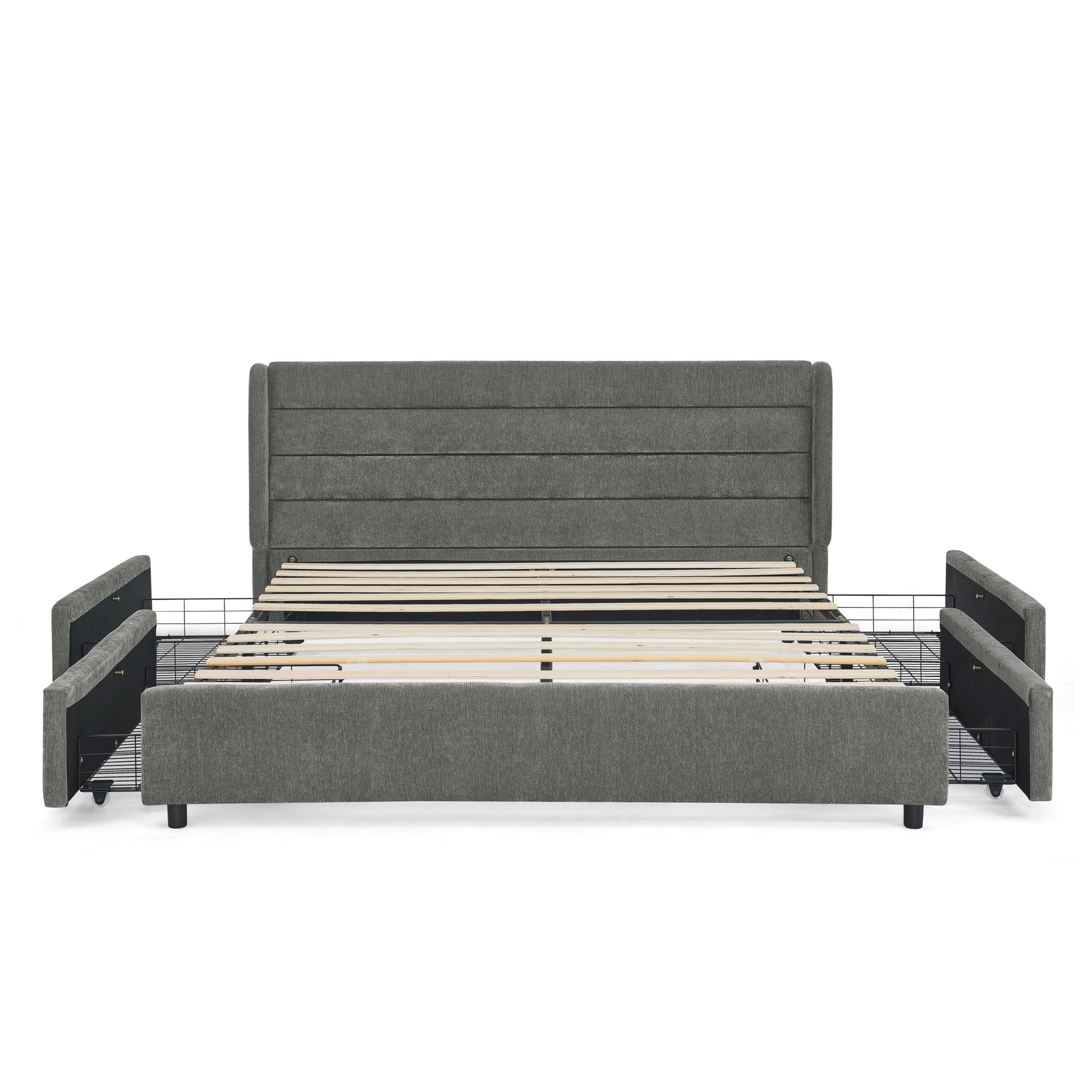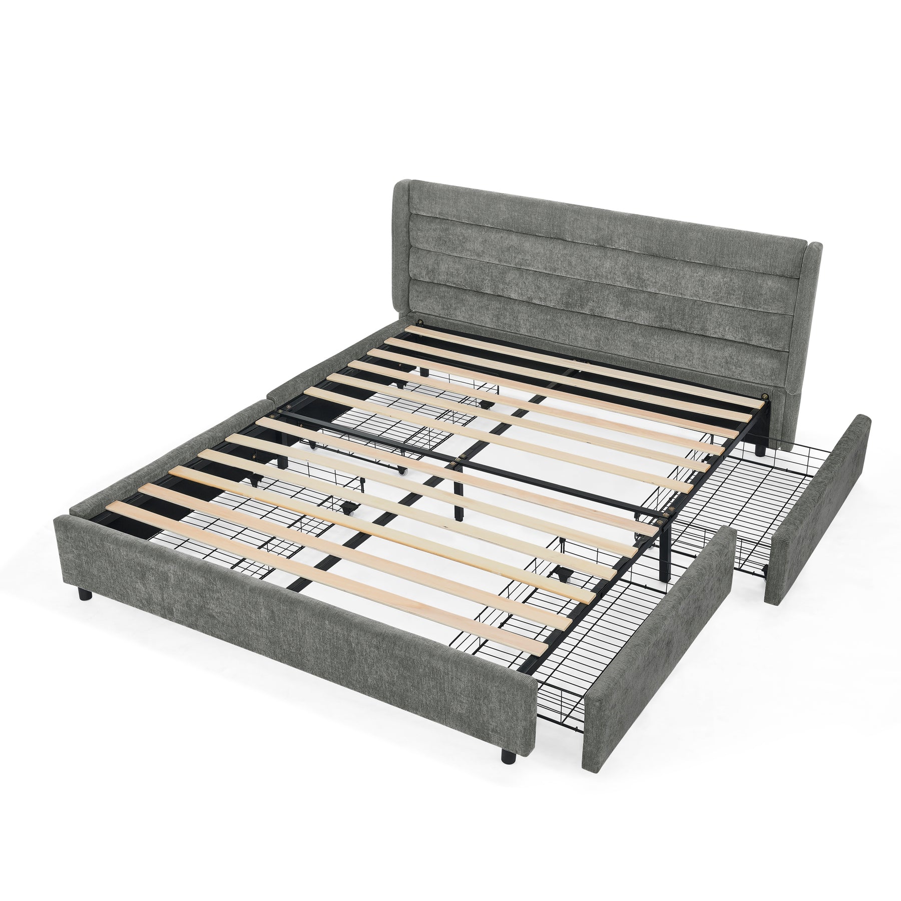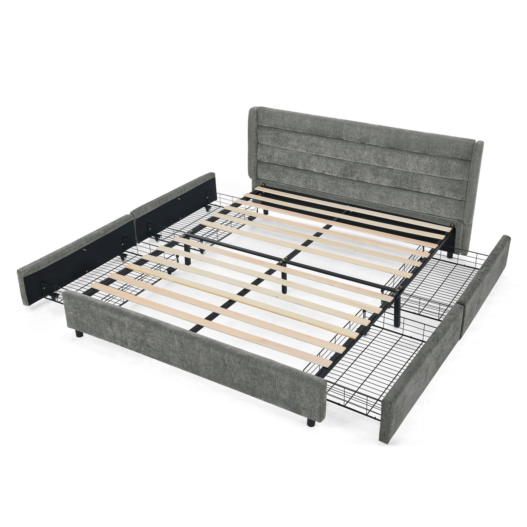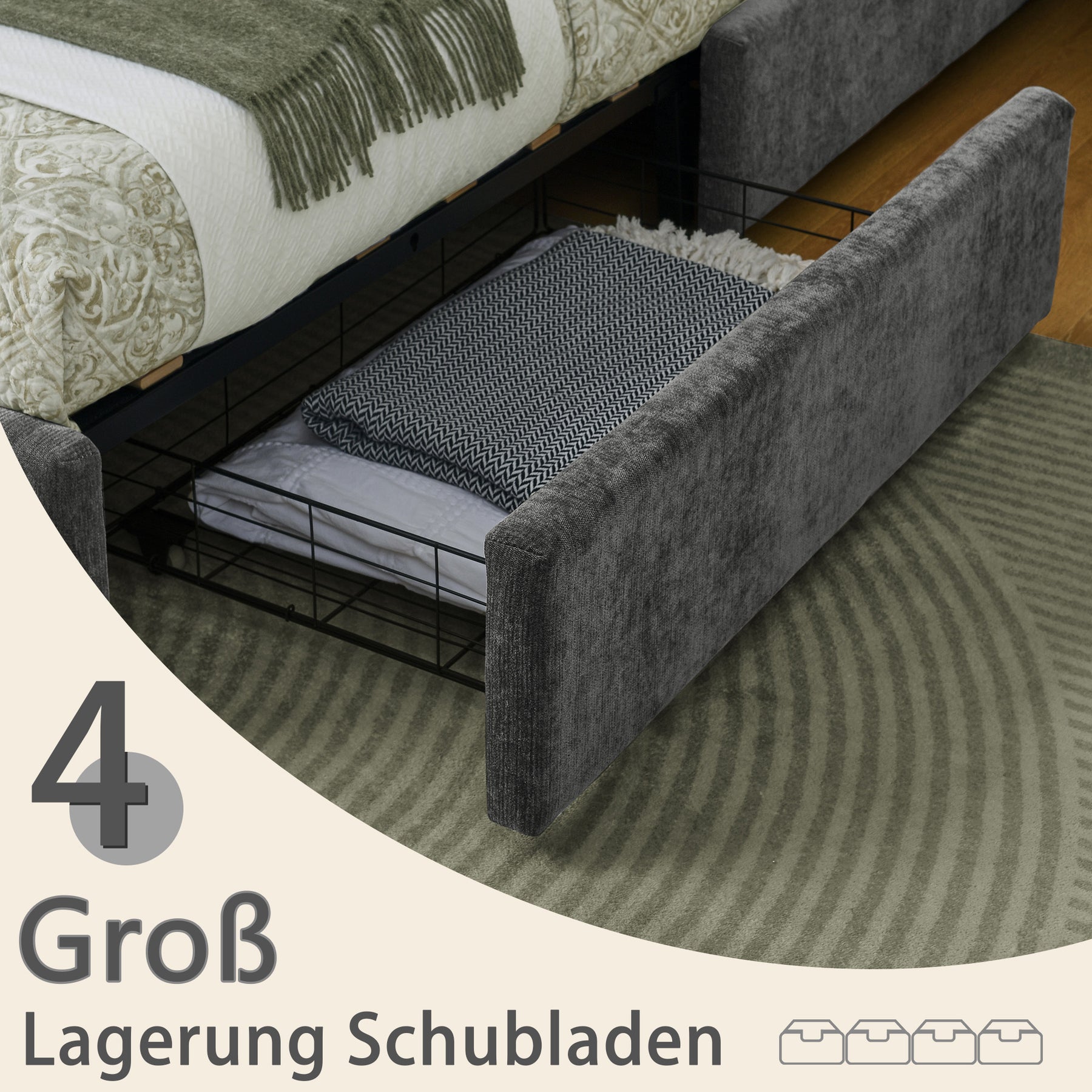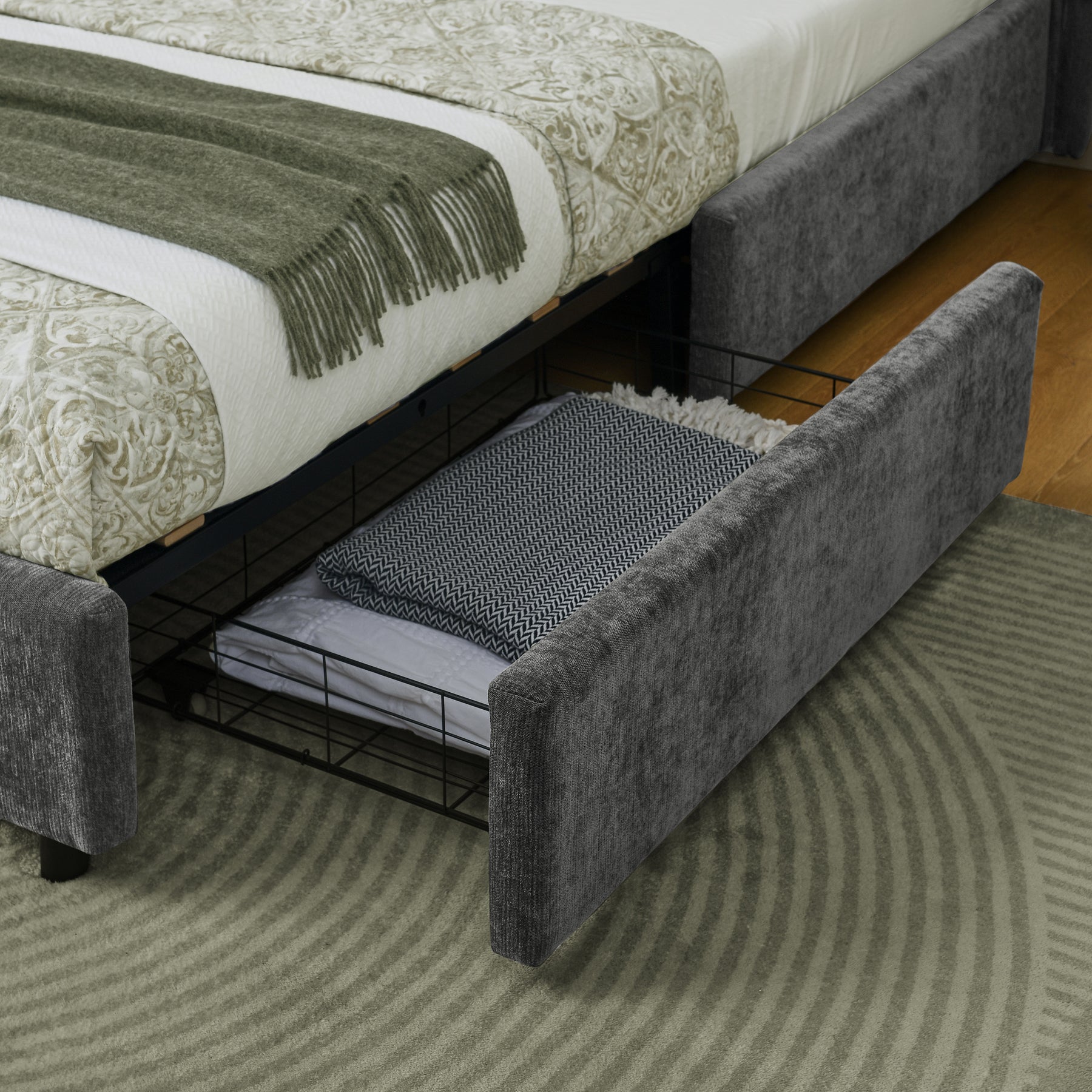 Lit double tissu chenille grise avec 4 tiroirs de rangement 140x200 cm (sans matelas) NANOSENS