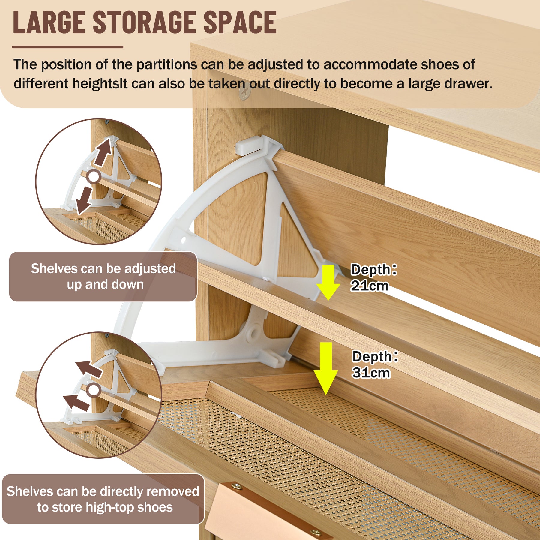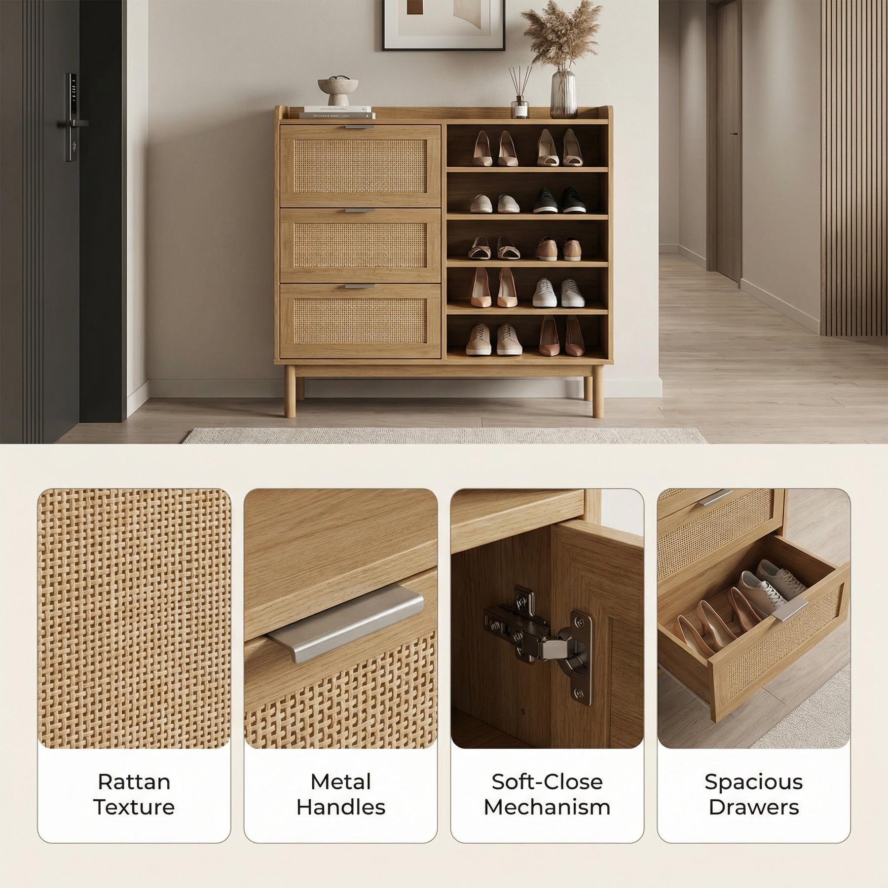 - Style campagne chic : Finition chêne clair et rattan naturel, s’adapte à tous les styles d’intérieur et apporte une touche chaleureuse.