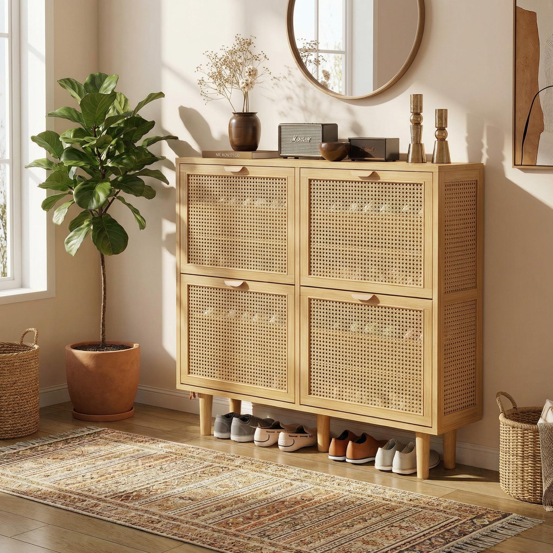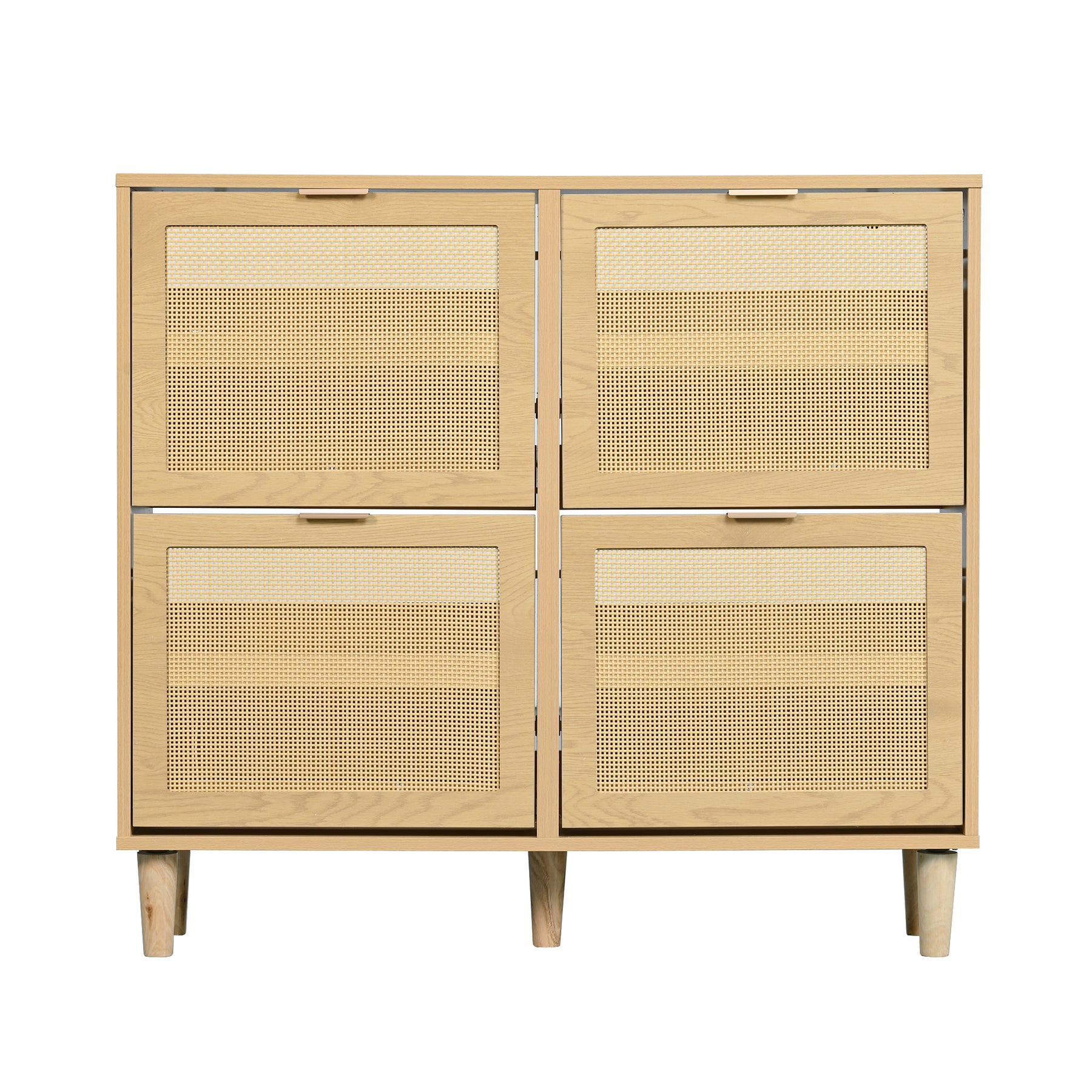 Meuble à chaussures effet chêne 4 portes abattants en rotin 100x25x90cm HARMONILN