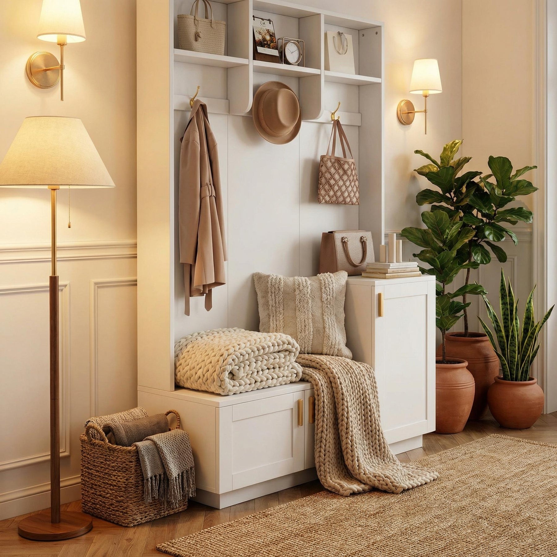 - Design moderne et lumineux : Finition blanche brillante, détails dorés et lignes épurées pour une entrée élégante et accueillante.