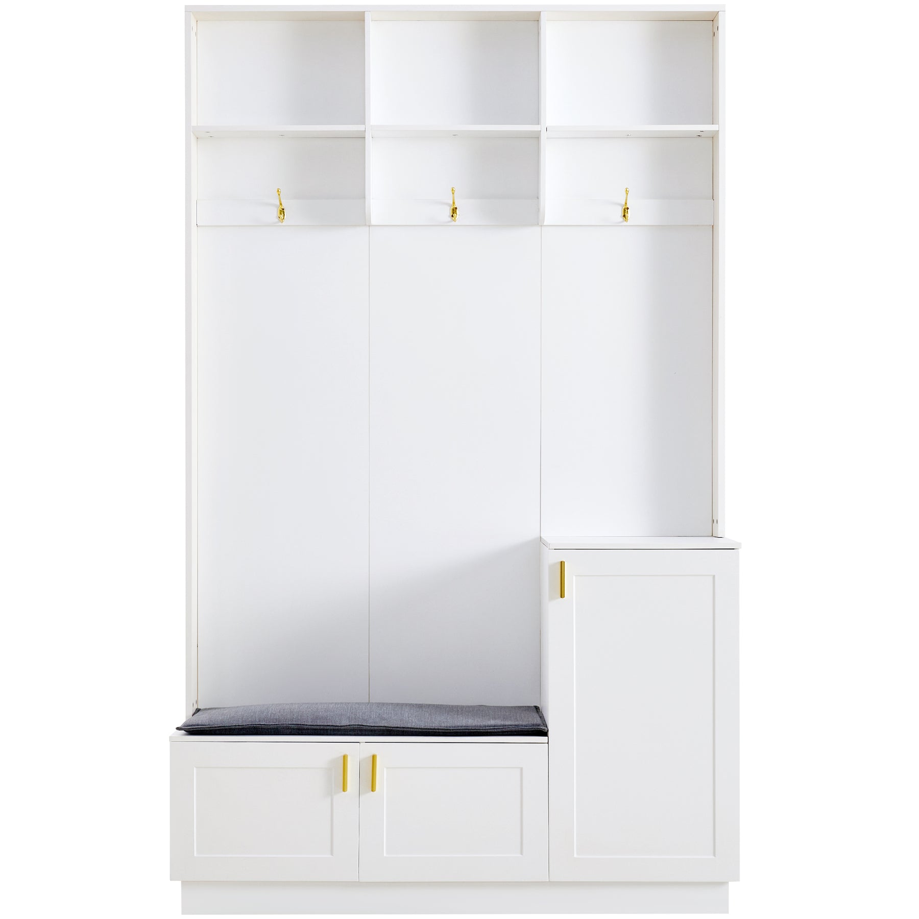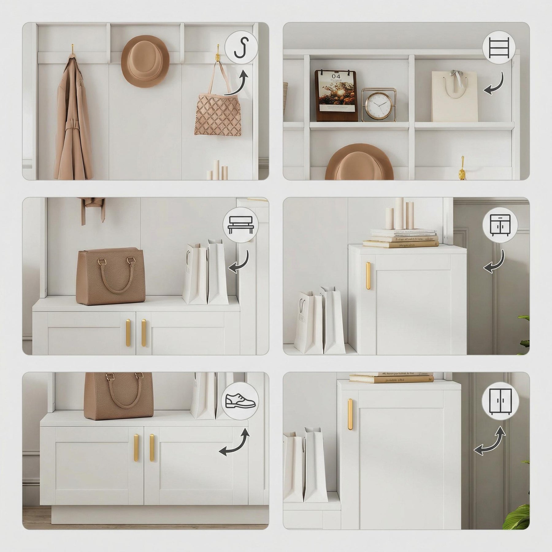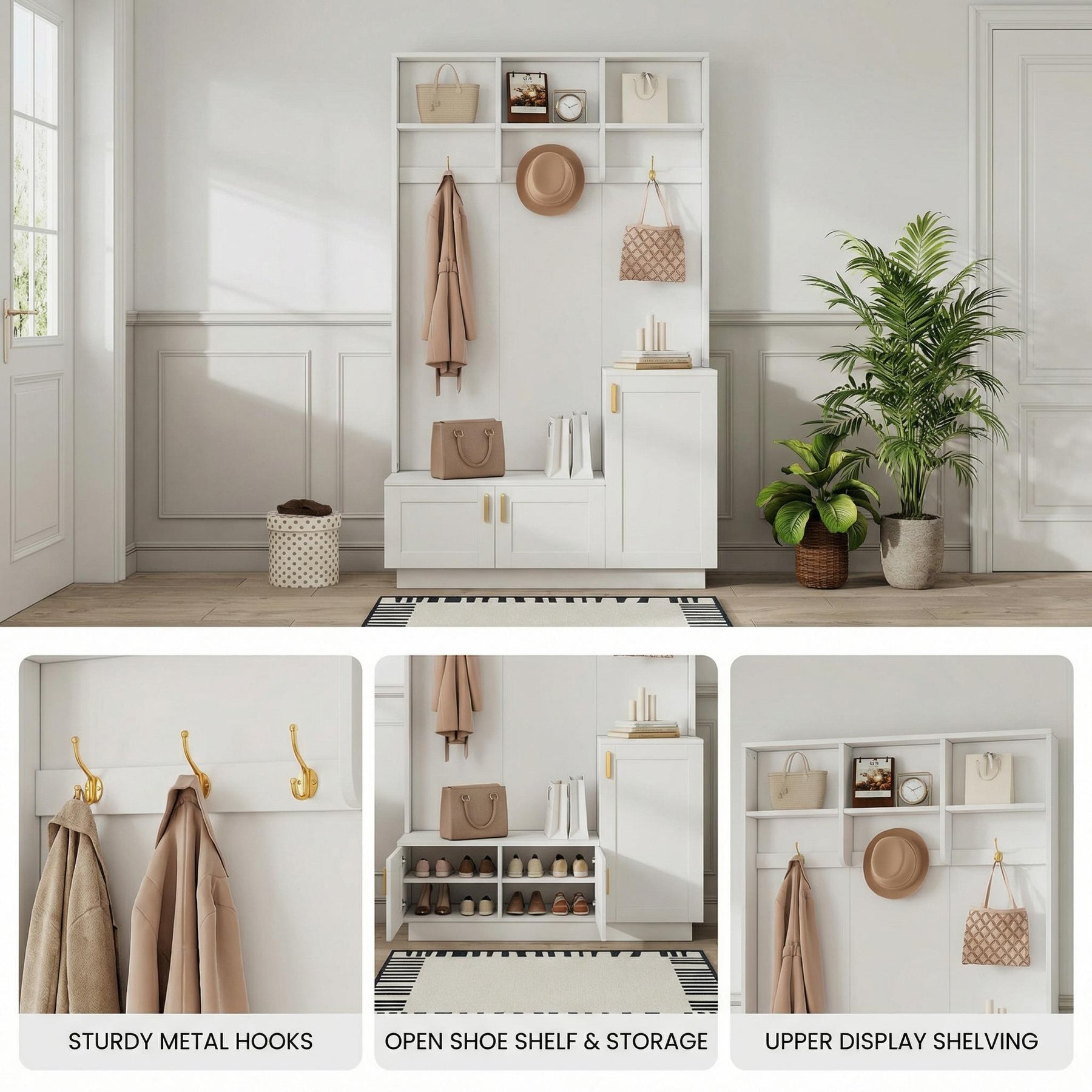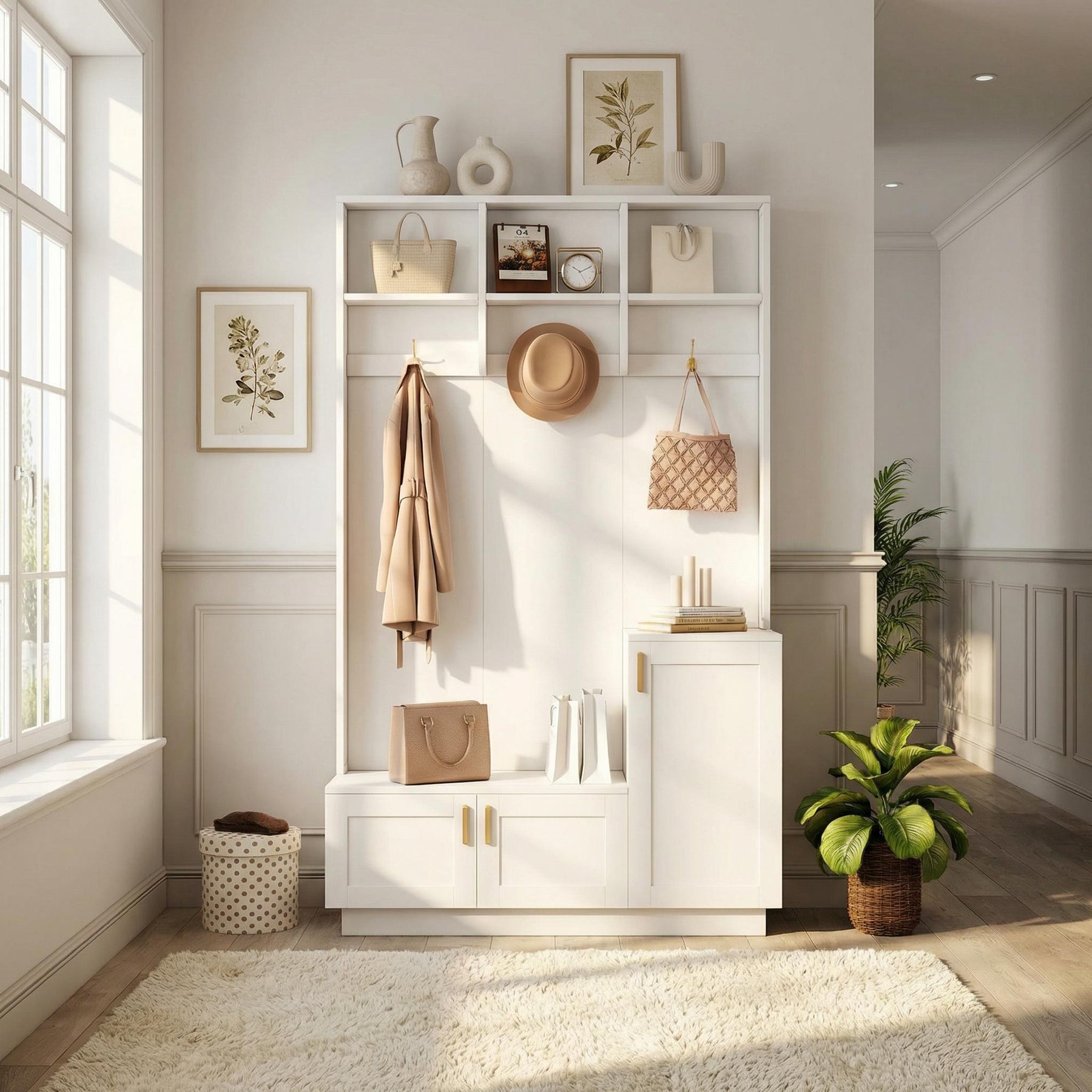 - Rangement optimisé : Vestiaire tout-en-un avec banc, porte-chaussures, crochets et étagères pour organiser manteaux, chaussures et accessoires.