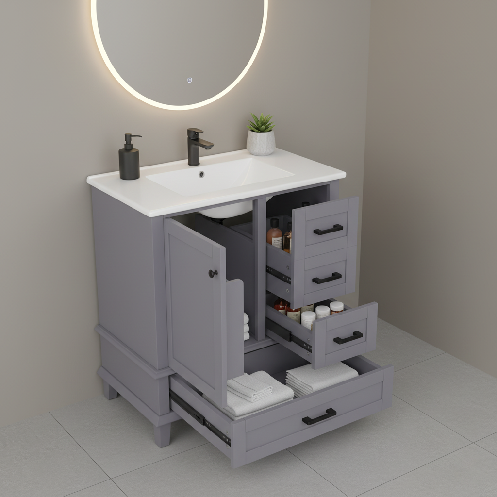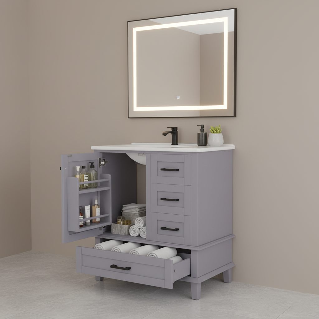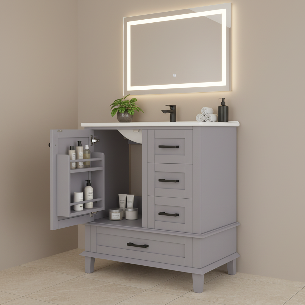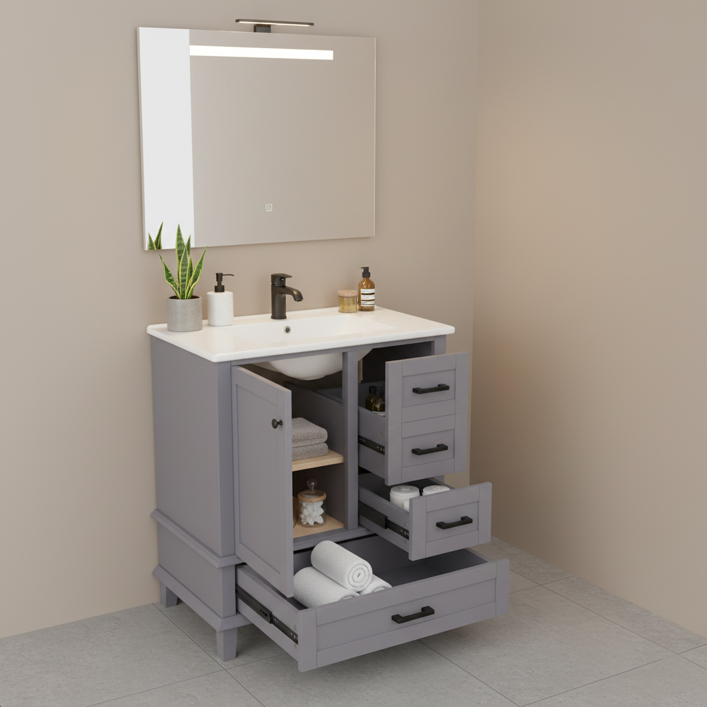 Ce meuble vasque sur pied de 76 cm allie un style moderne et épuré à une fonctionnalité remarquable. Sa structure en MDF avec des pieds en bois massif garantit une excellente stabilité, tandis que sa finition laquée par pulvérisation le rend très résistant à l'humidité, idéal pour l'environnement de la salle de bain. L'agencement asymétrique, comprenant une porte d'armoire et trois tiroirs à glissières silencieuses, offre un espace de rangement généreux et bien organisé, complété par une vasque en céramique intégrée et facile à nettoyer.