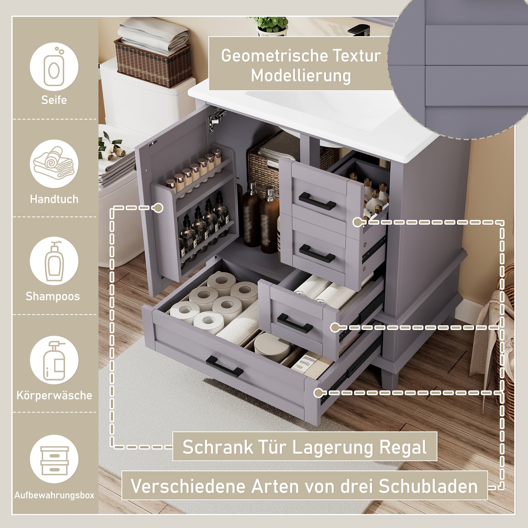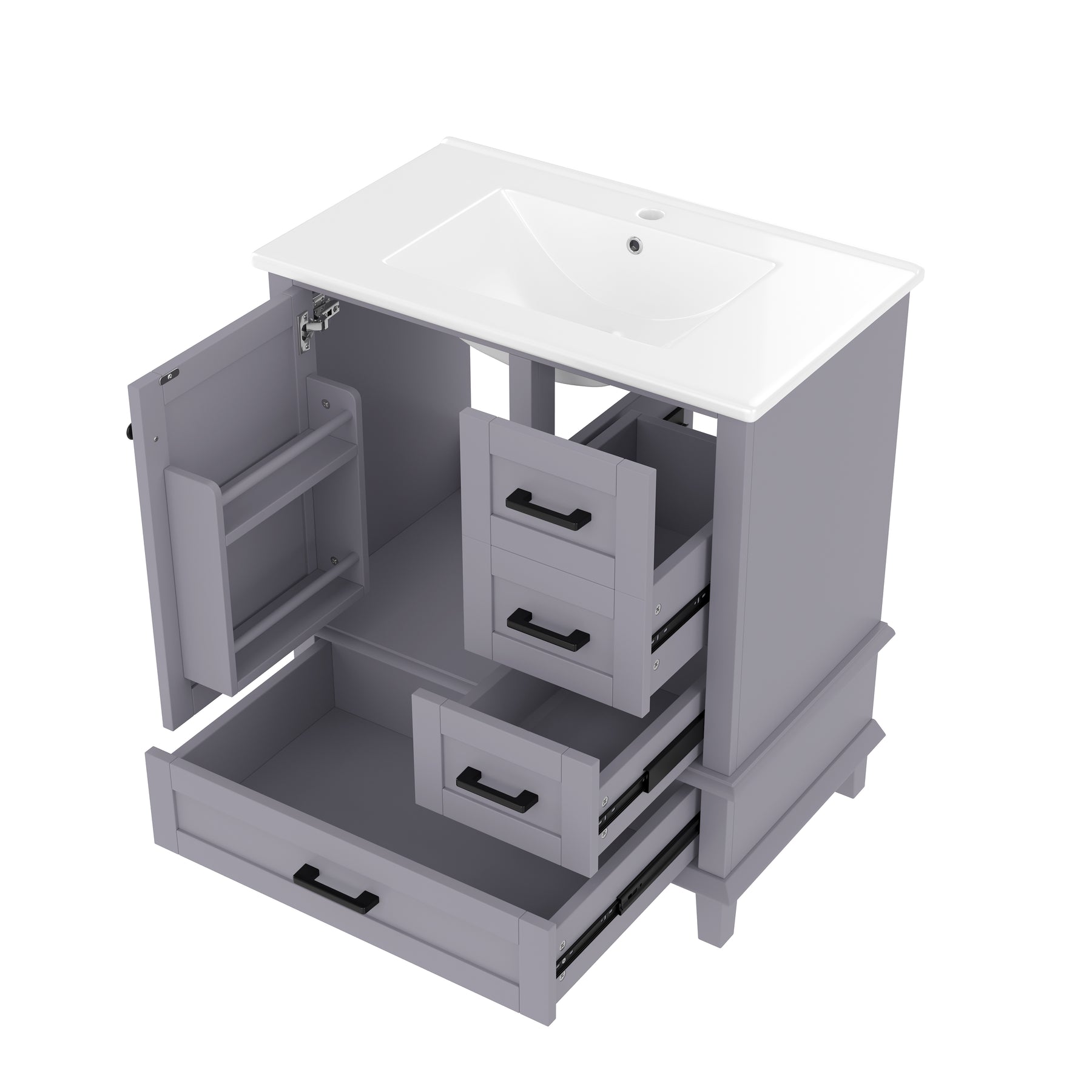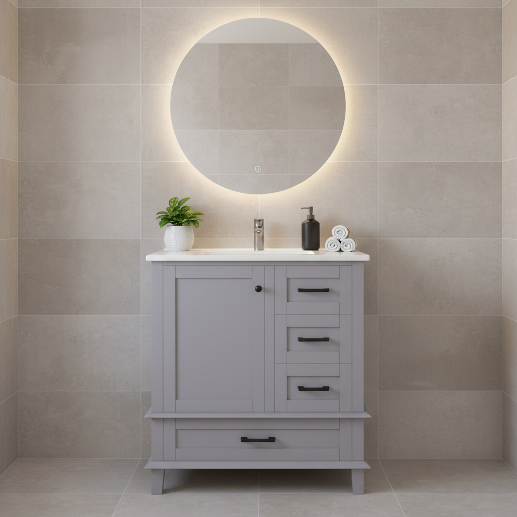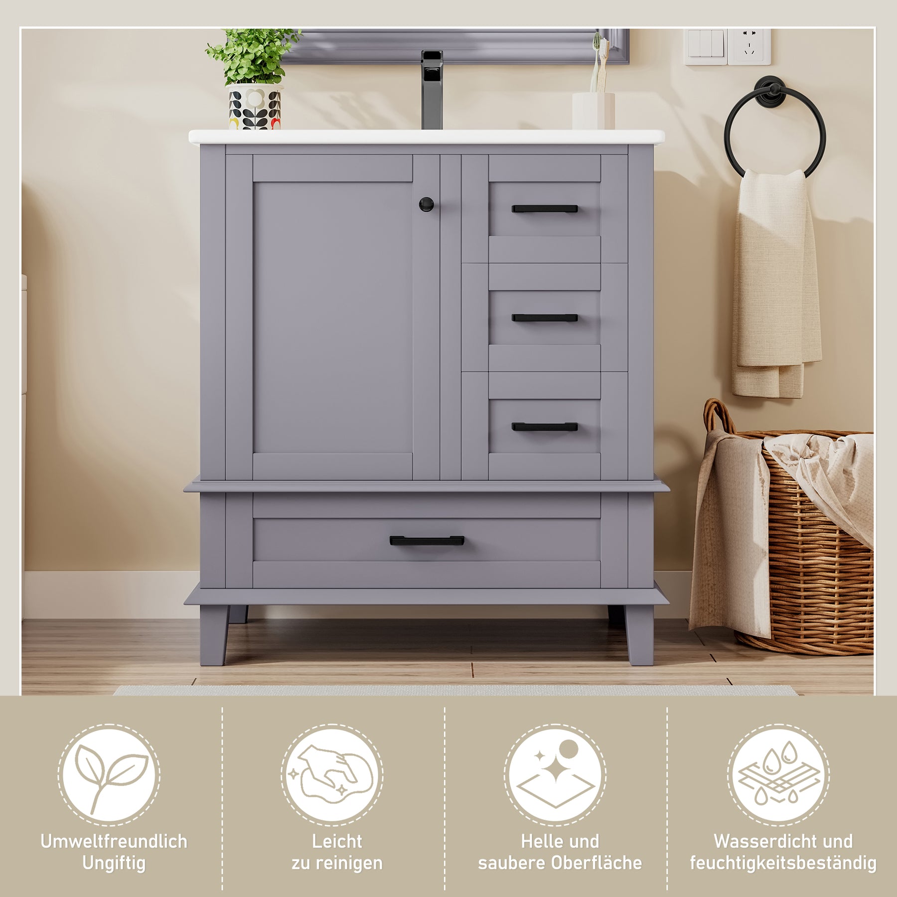 Ce meuble vasque sur pied de 76 cm allie un style moderne et épuré à une fonctionnalité remarquable. Sa structure en MDF avec des pieds en bois massif garantit une excellente stabilité, tandis que sa finition laquée par pulvérisation le rend très résistant à l'humidité, idéal pour l'environnement de la salle de bain. L'agencement asymétrique, comprenant une porte d'armoire et trois tiroirs à glissières silencieuses, offre un espace de rangement généreux et bien organisé, complété par une vasque en céramique intégrée et facile à nettoyer.
