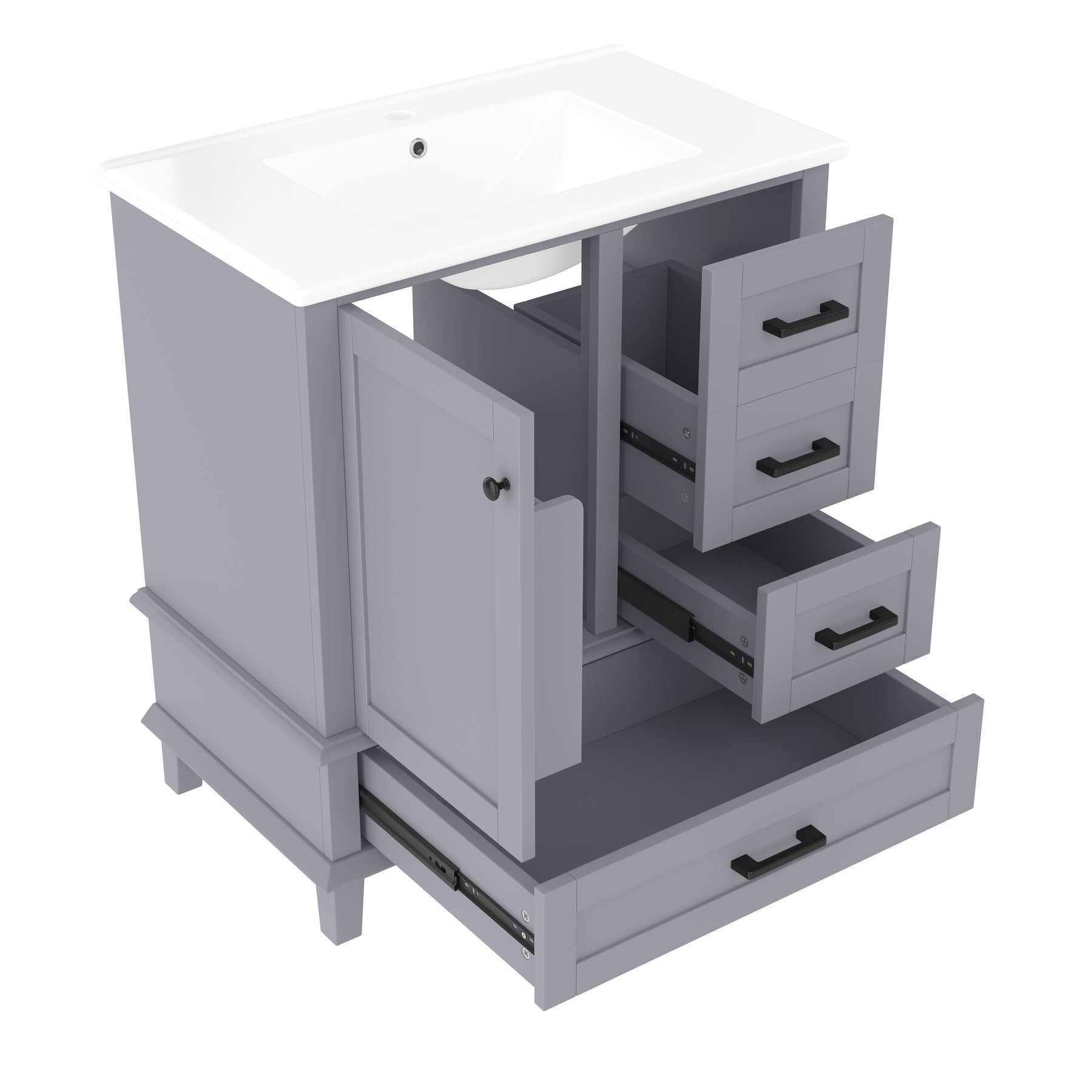 Meuble vasque gris laqué sur pied 76x46x83,5cm, vasque en céramique, porte et 3 tiroirs silencieux (robinet non inclus) GLUCOSE