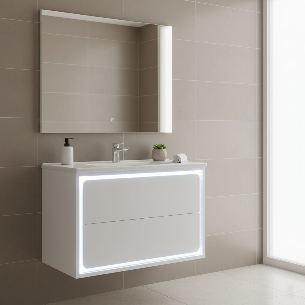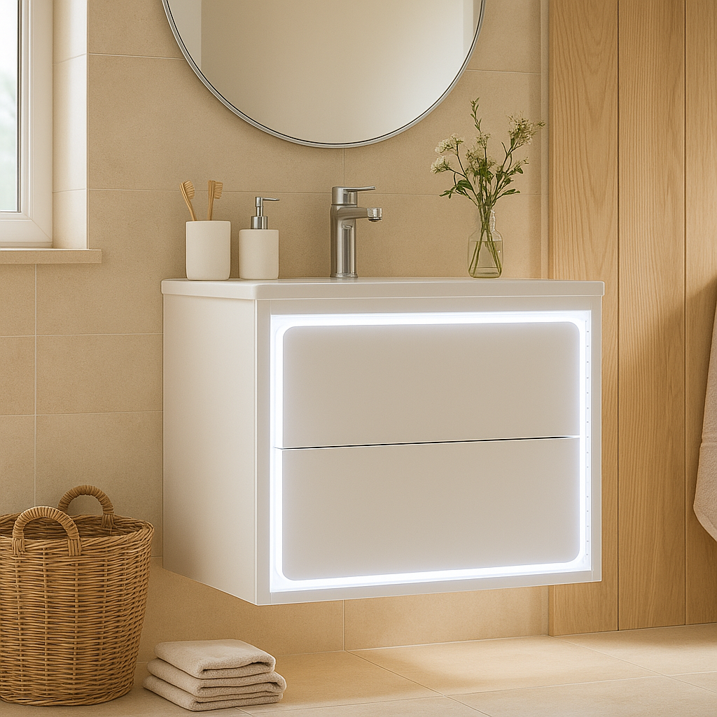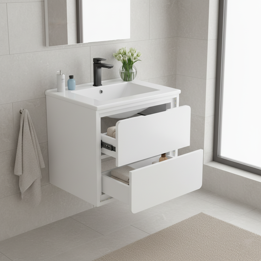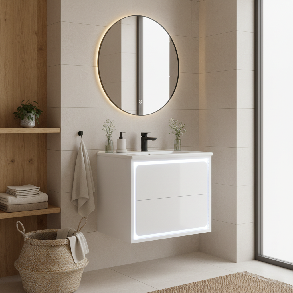 Ce meuble vasque mural de 60 cm est la quintessence du design moderne et de la technologie intelligente. Sa finition blanc laqué est non seulement brillante et lisse, mais aussi incroyablement résistante à l'humidité grâce à une technologie de peinture avancée. Equipé de deux grands tiroirs à fermeture silencieuse, il maximise le rangement tout en minimisant les nuisances sonores. Le système d'éclairage à capteur radar intégré s'allume automatiquement lorsque vous vous approchez, offrant une lumière douce et économe en énergie pour une utilisation nocturne pratique et sécurisée.