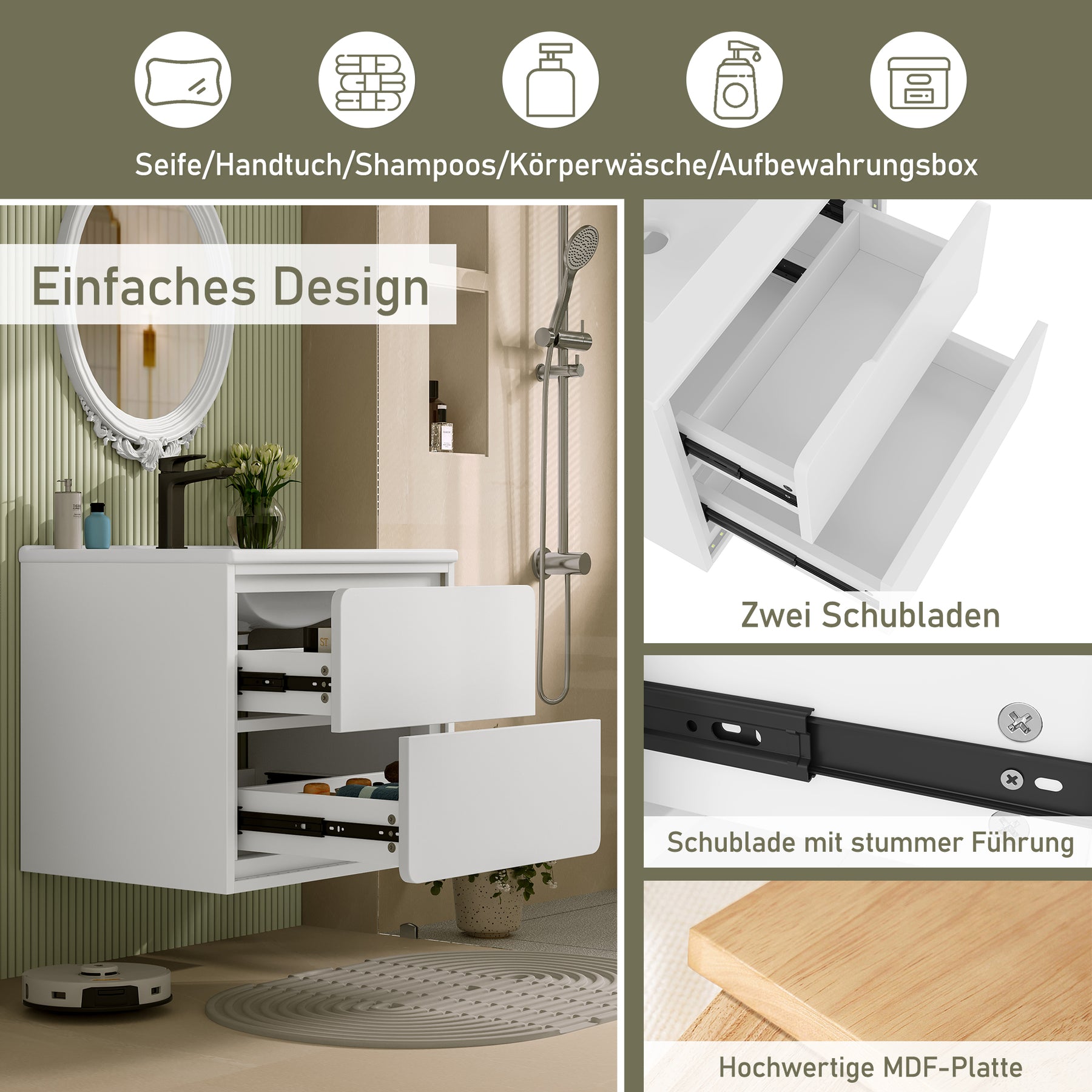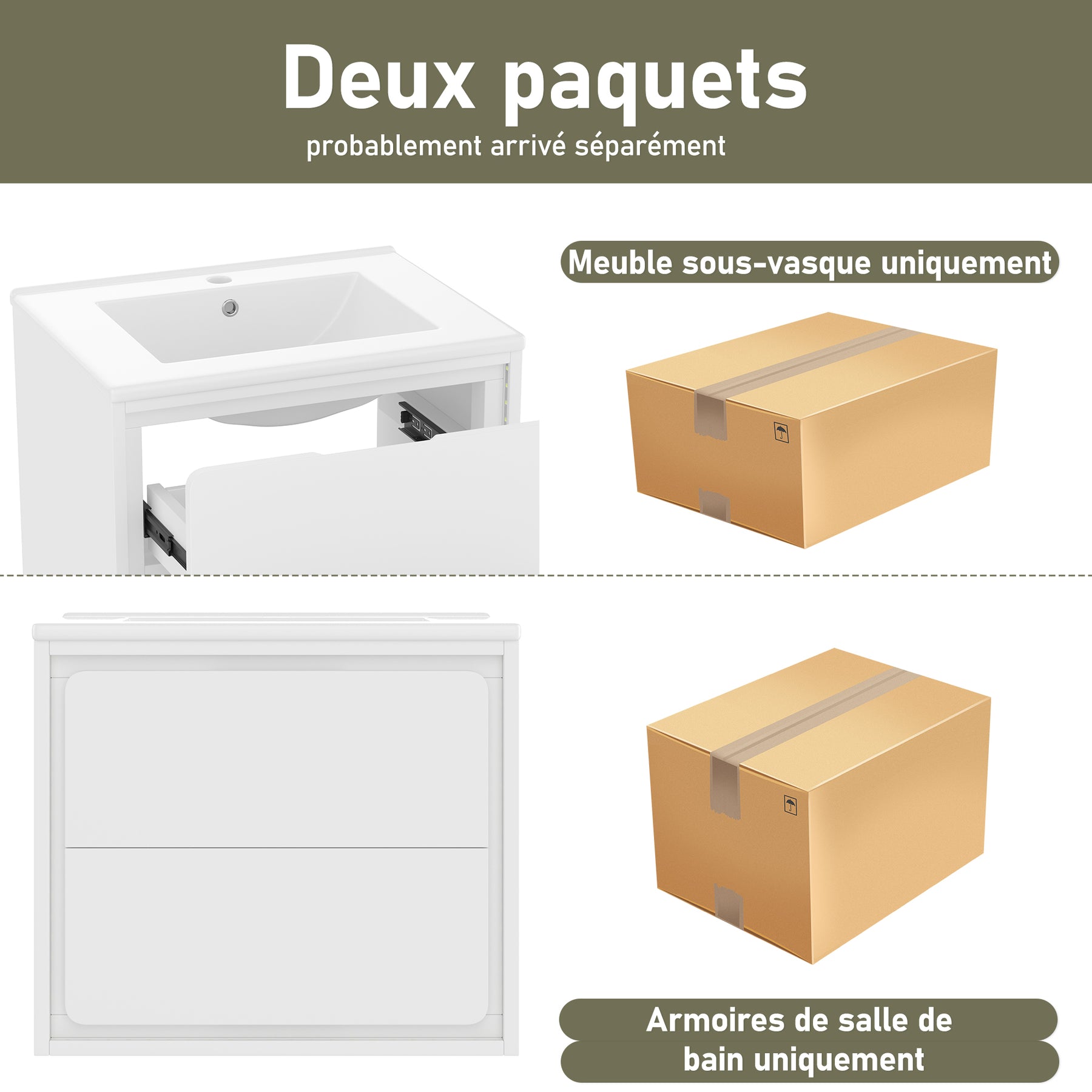 Meuble vasque blanc laqué suspendu 60x46x50cm, 2 tiroirs silencieux et éclairage LED à capteur radar (robinet non inclus) COENZYM