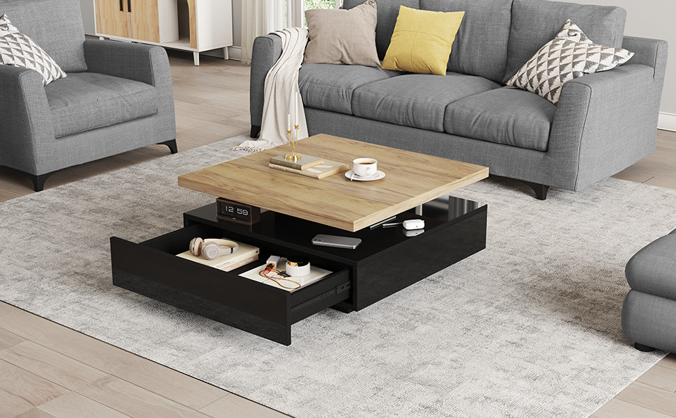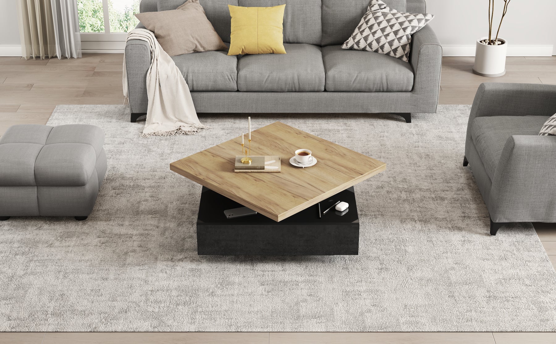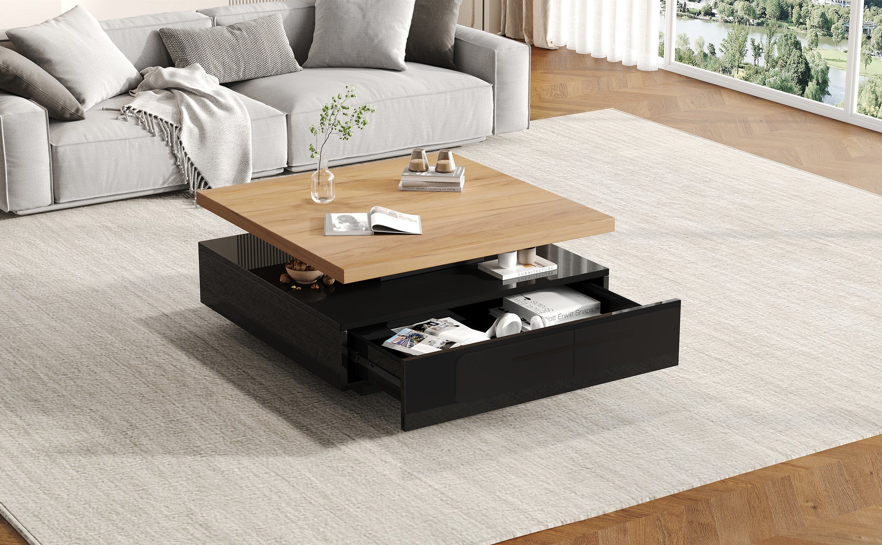 Imaginez-vous dans votre salon, savourant un café entre amis autour d'une table basse à la fois élégante, ingénieuse et pratique. Cette table basse carrée pivotante à 360° s'intègre parfaitement dans un espace contemporain grâce à sa combinaison de bois naturel chaleureux et de noir laqué brillant. Son design à deux niveaux crée une ambiance aérée et raffinée, tout en offrant une solution de rangement discrète et fonctionnelle.