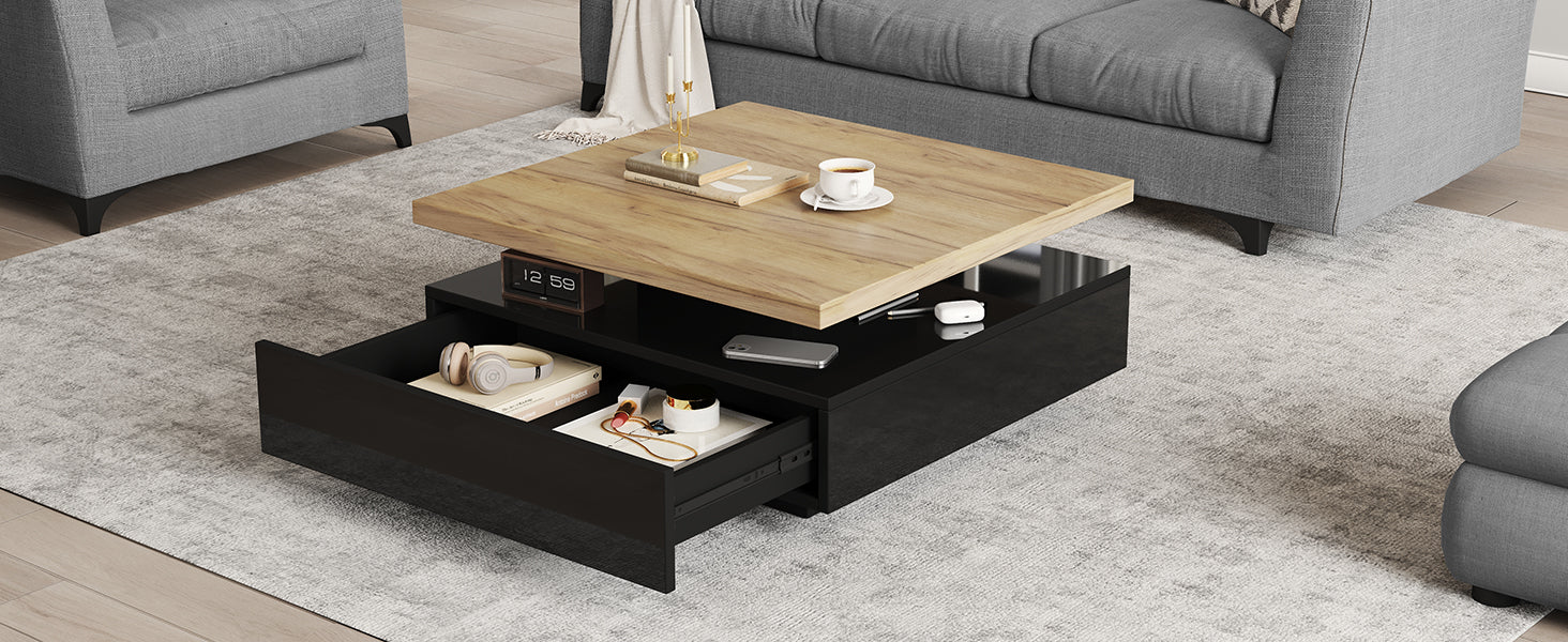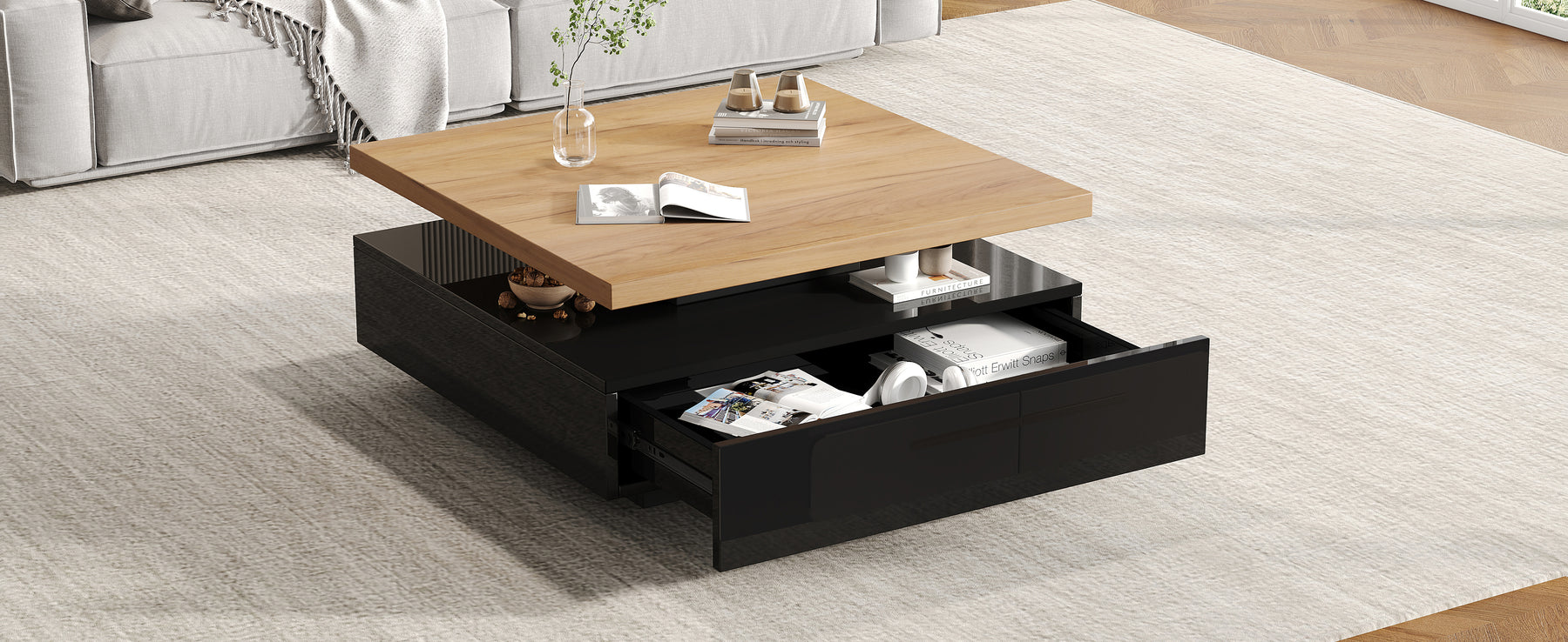 - Rotation à 360° et rangement intelligent : Adaptez la disposition selon vos besoins grâce au plateau supérieur pivotant. Accédez facilement à la grande niche de rangement cachée dans la base noire brillante pour y glisser magazines, télécommandes ou petits objets du quotidien. Idéal pour garder votre espace ordonné sans compromettre l’esthétique.