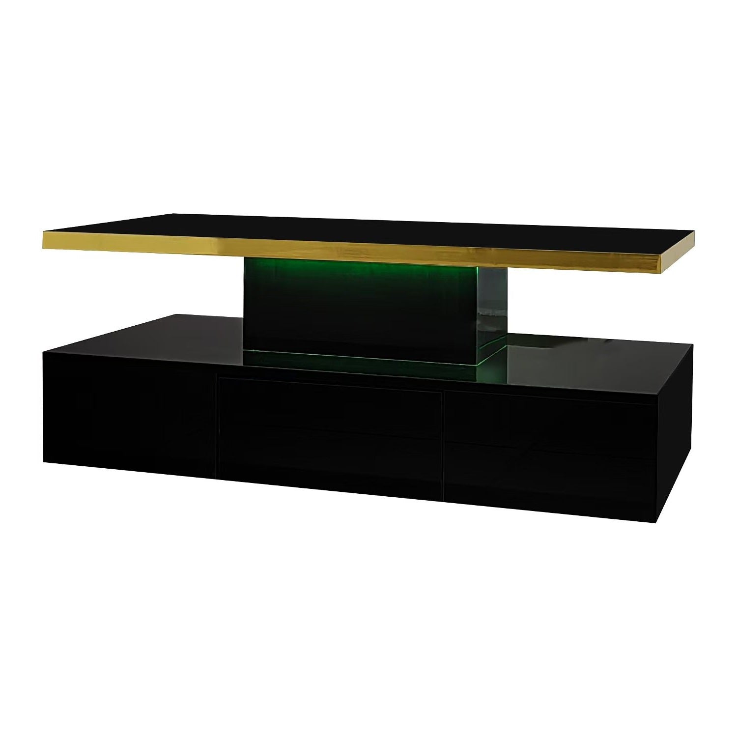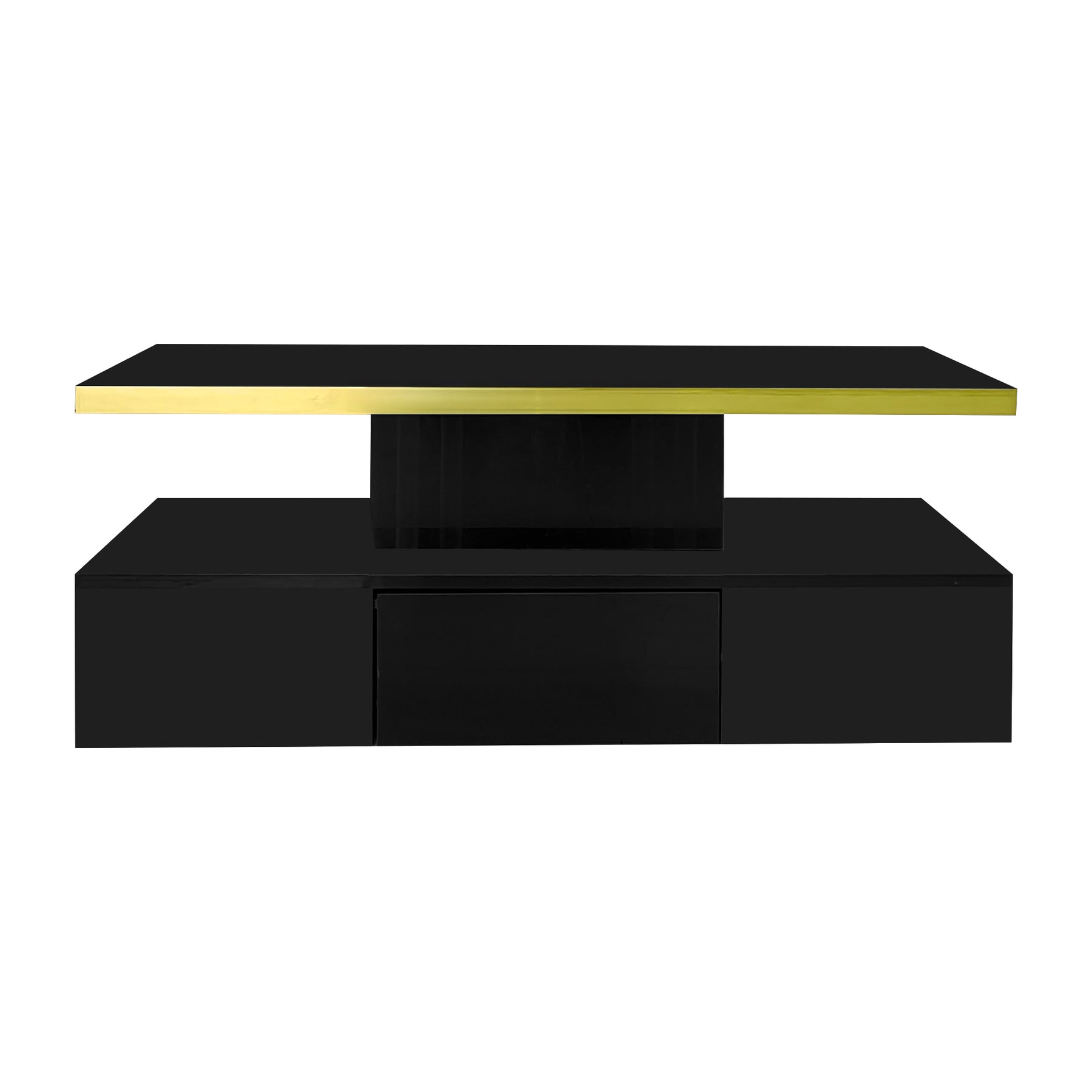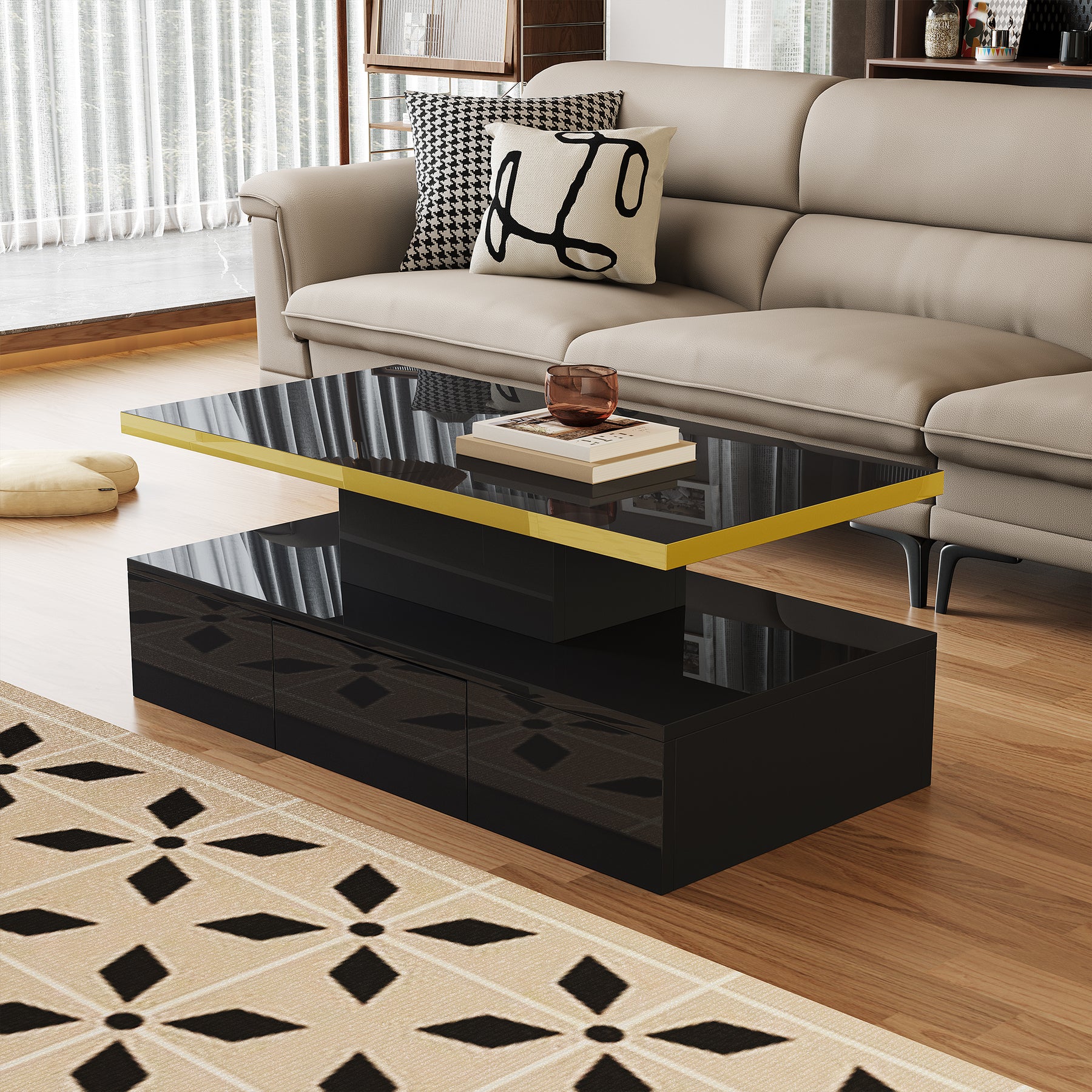Imaginez-vous rentrer chez vous après une longue journée et vous installer confortablement dans votre salon. Devant vous, cette table basse moderne noire brillante illumine la pièce grâce à son effet miroir sophistiqué et les reflets de l'éclairage LED intégré. Son design épuré, rehaussé d’une élégante touche dorée sur la tranche supérieure, s’accorde parfaitement à un intérieur contemporain et fait sensation auprès de vos invités.