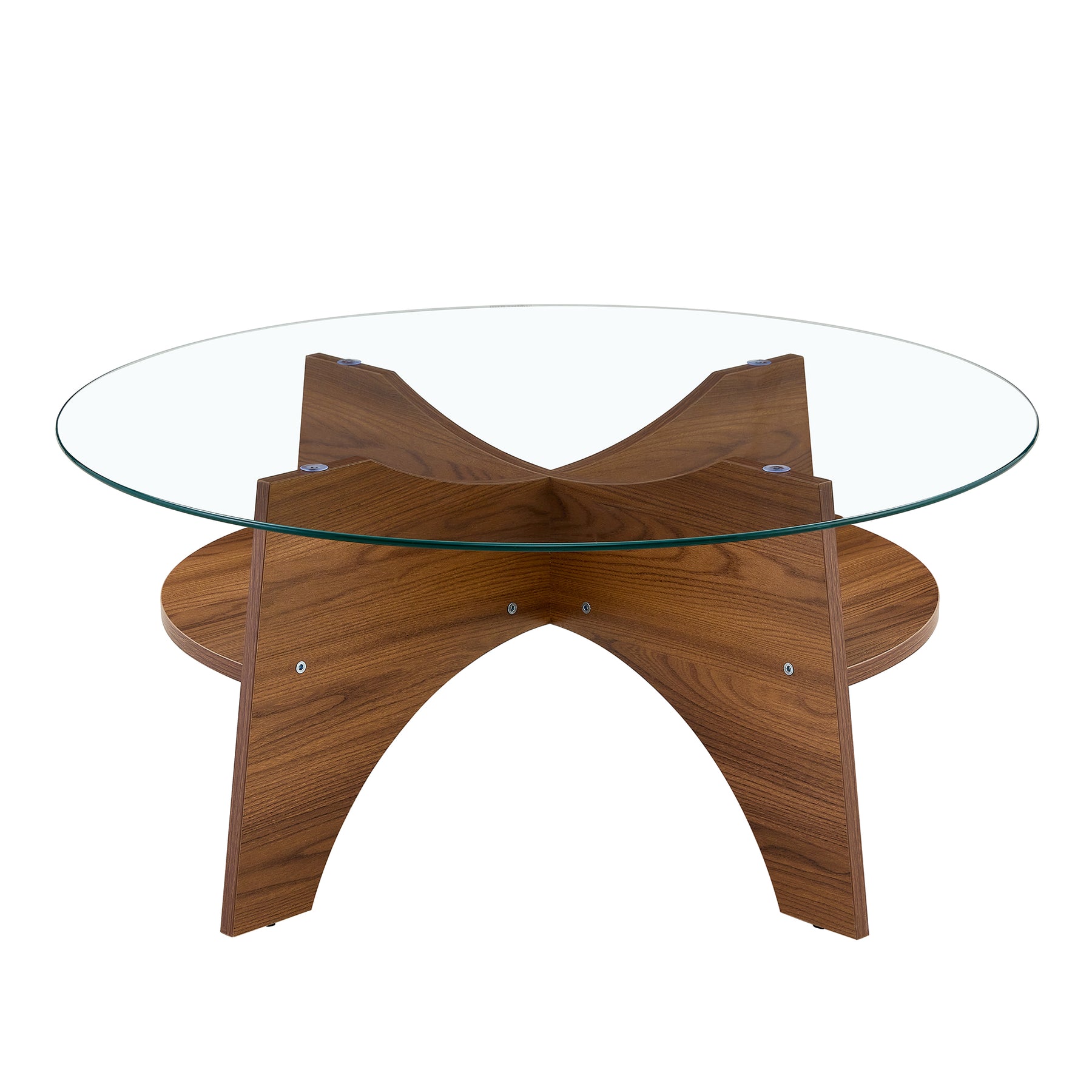 Table basse ronde en verre trempé pieds effet bois noyer Ø80 cm CLARITYEN
