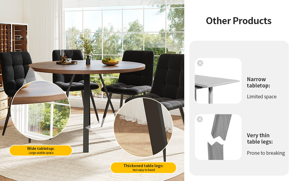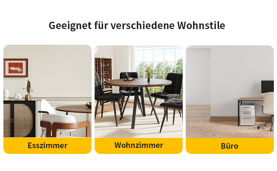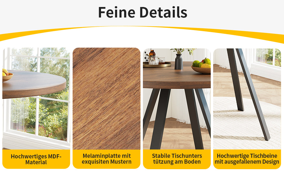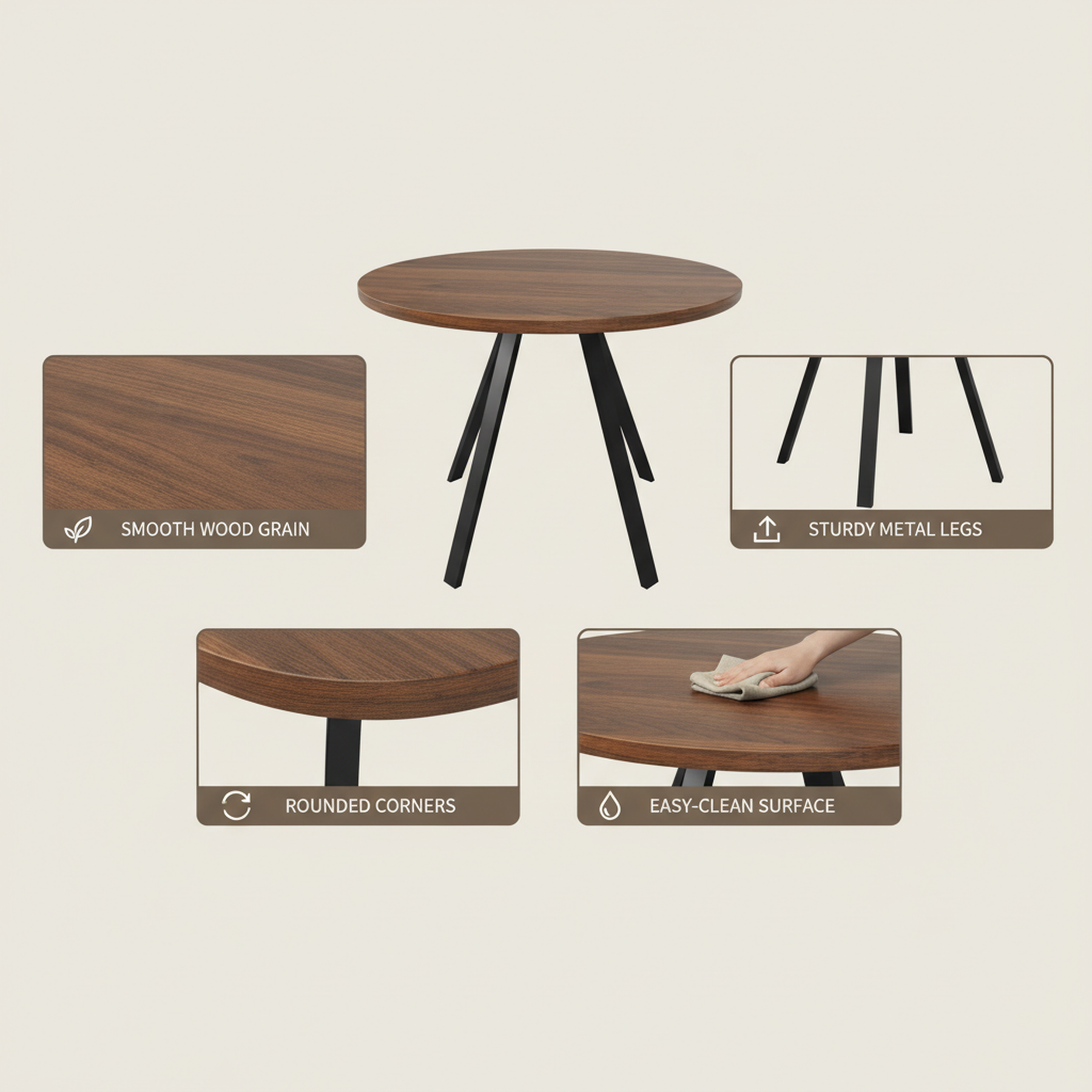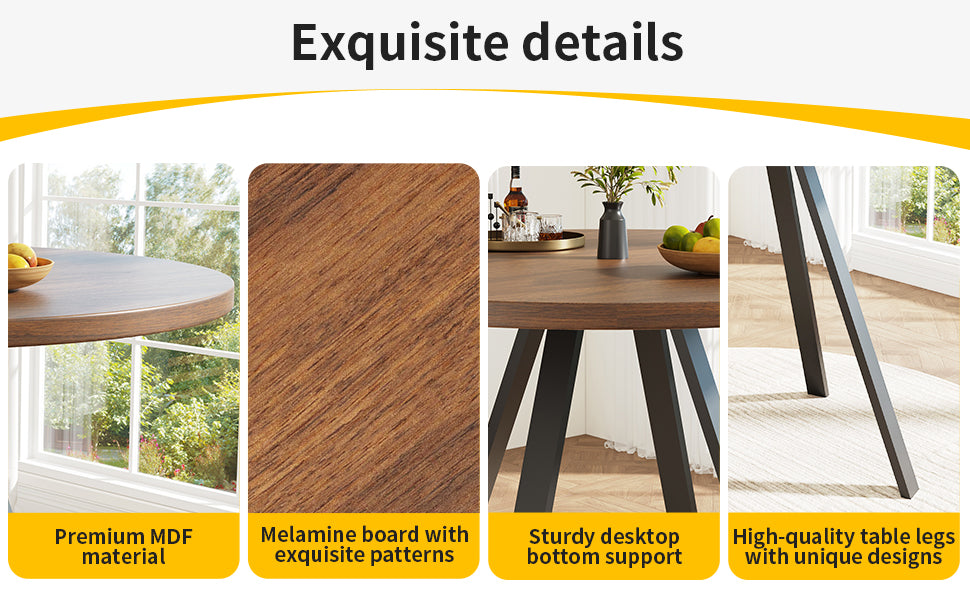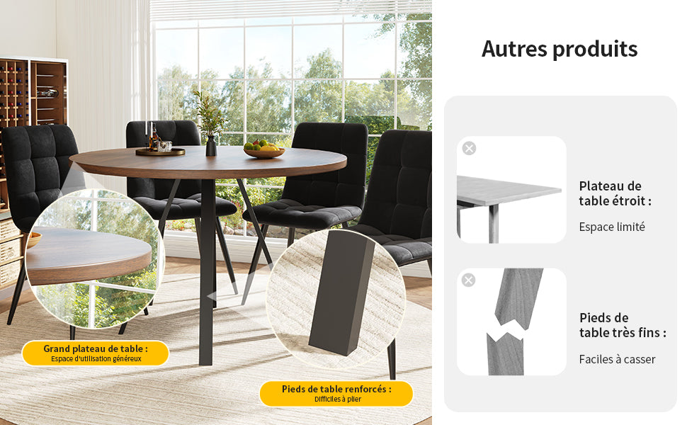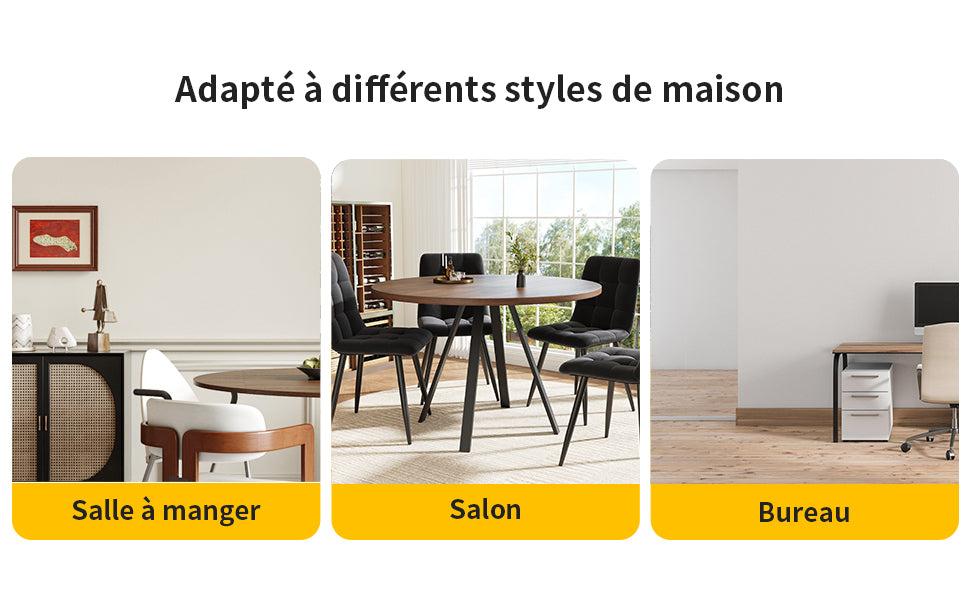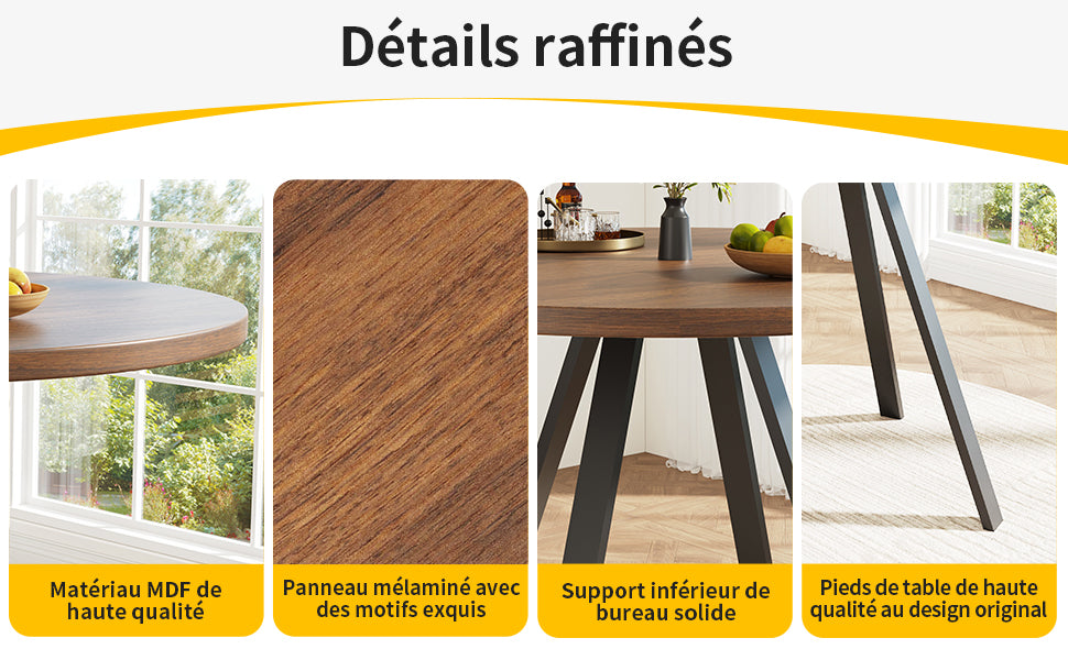 - Design rétro et élégant : La table ronde en finition noyer et pieds noirs s’intègre harmonieusement dans tous les styles d’intérieur, apportant une note sophistiquée et chaleureuse à votre espace.