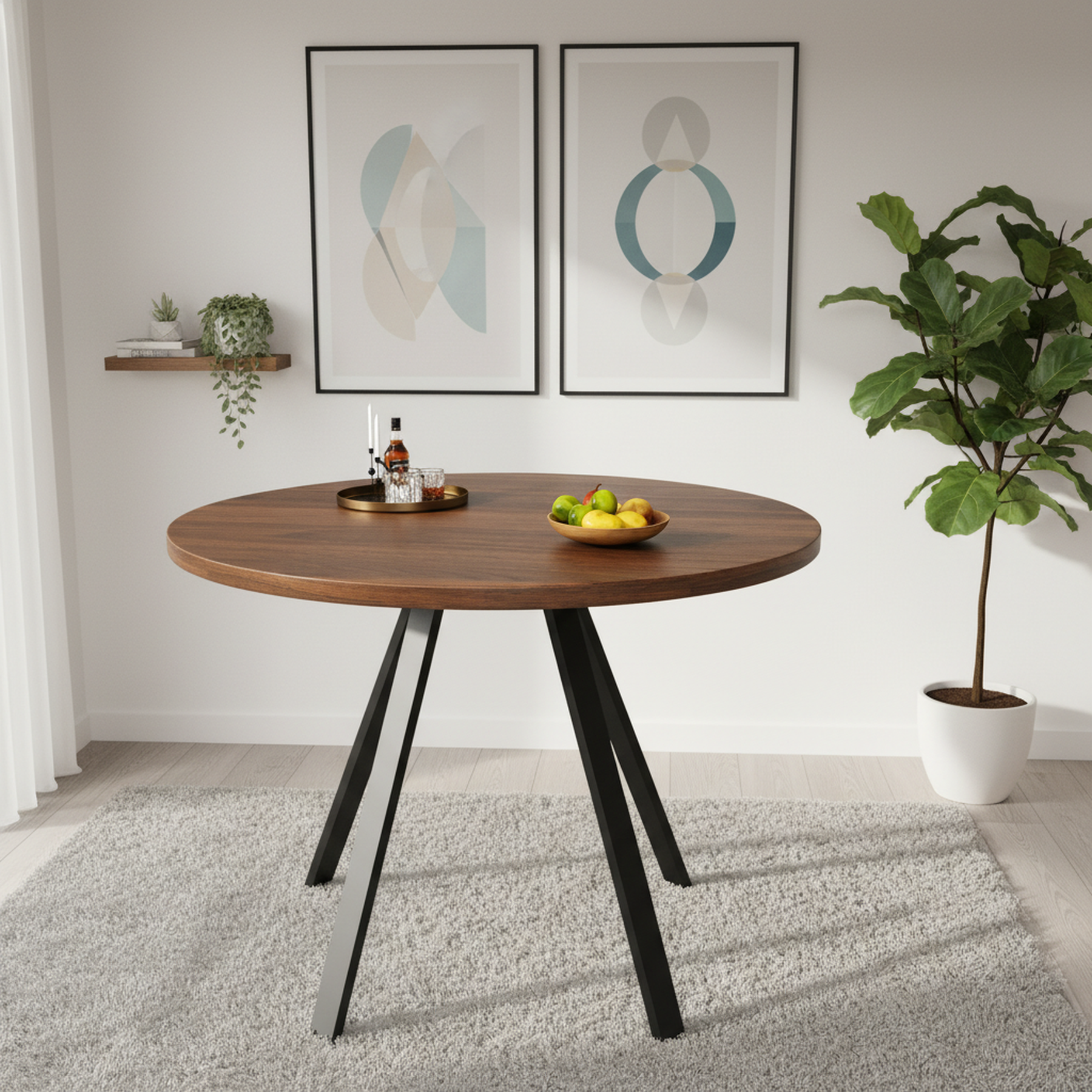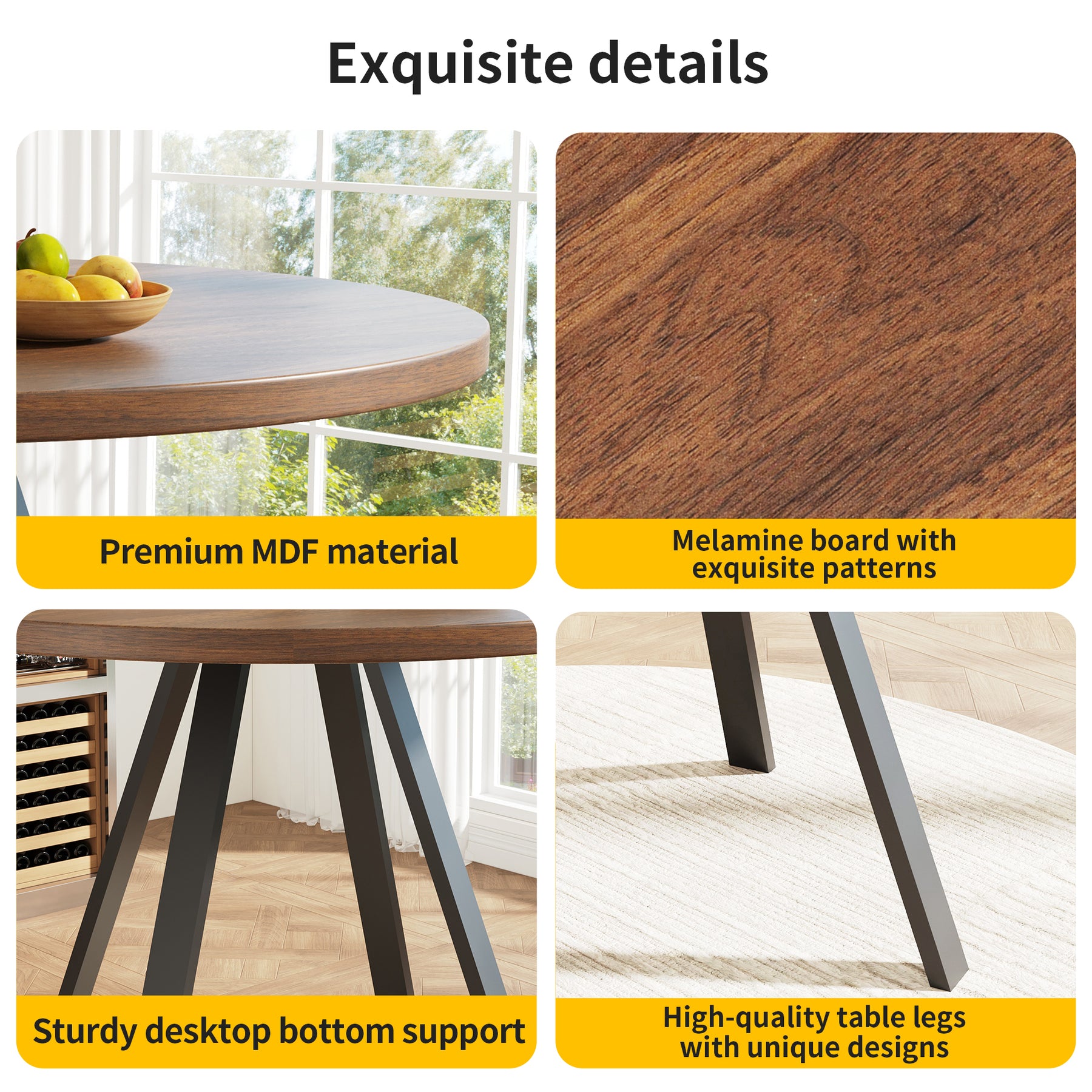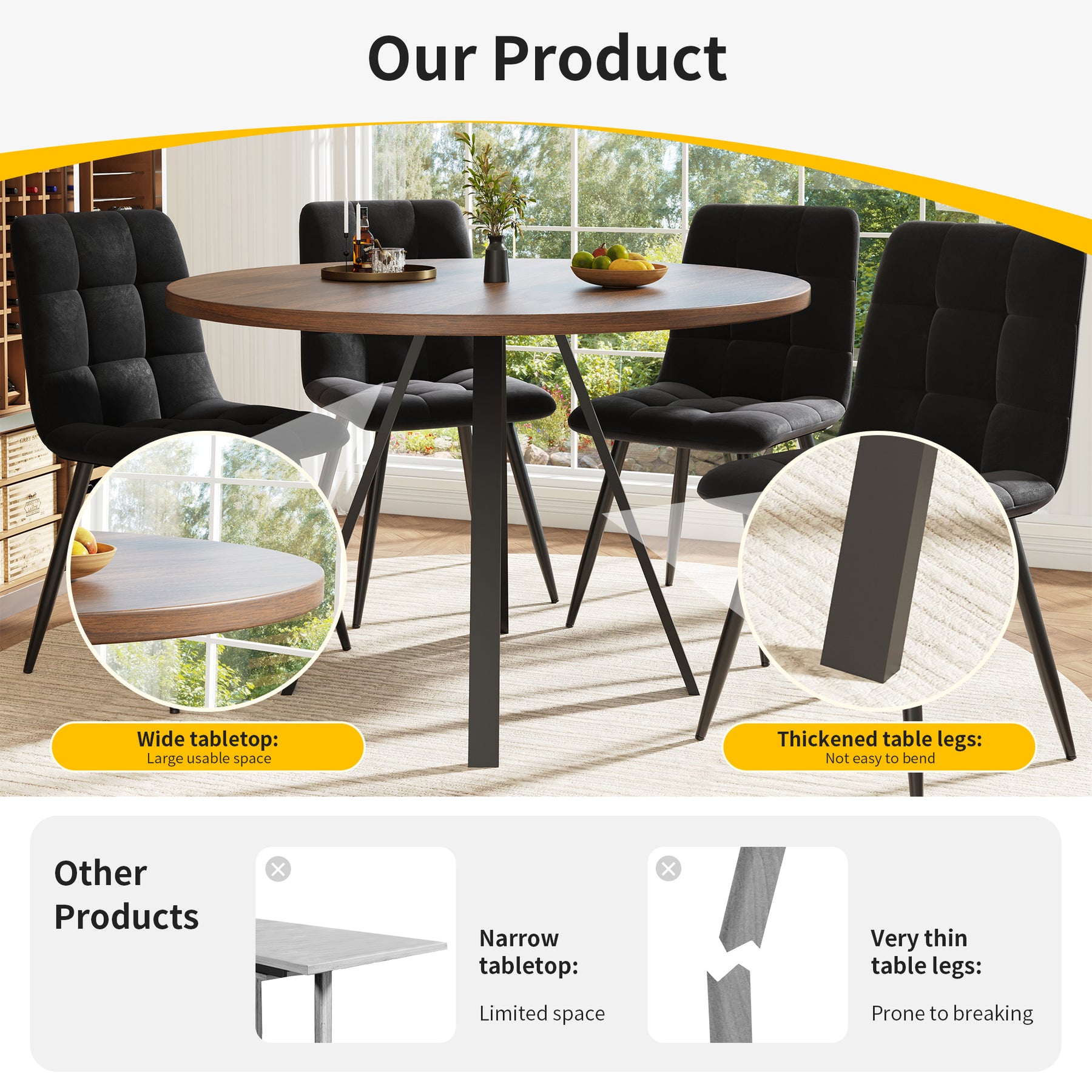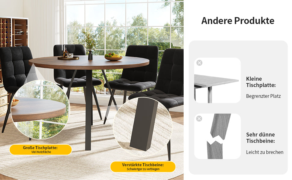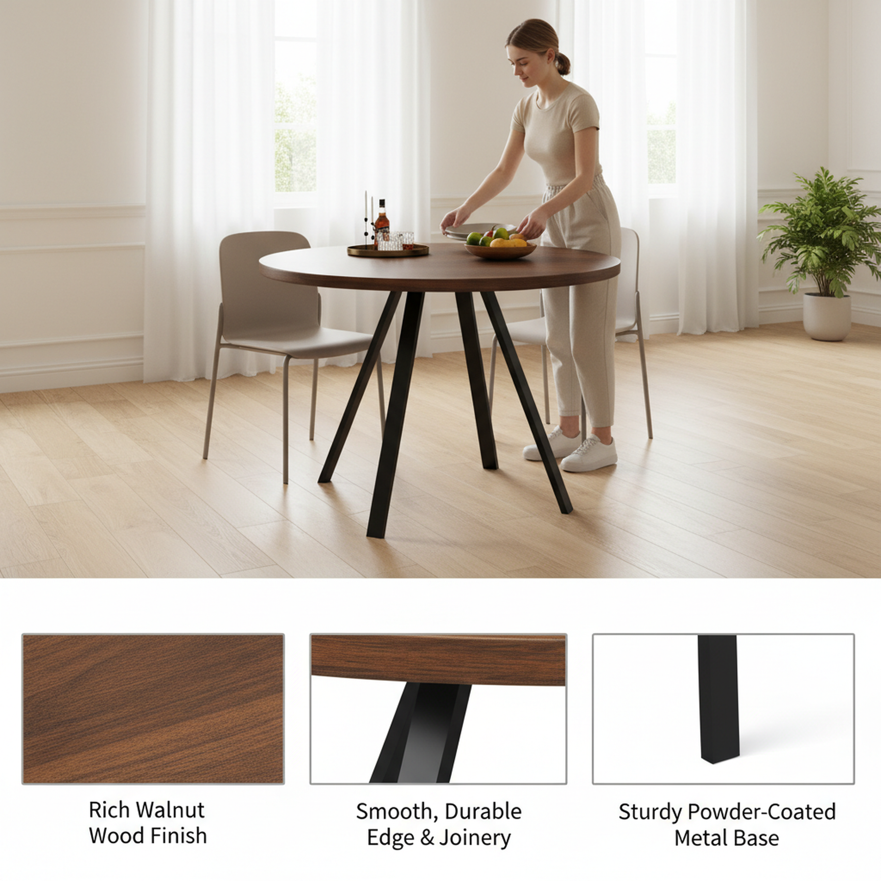 - Design rétro et élégant : La table ronde en finition noyer et pieds noirs s’intègre harmonieusement dans tous les styles d’intérieur, apportant une note sophistiquée et chaleureuse à votre espace.
