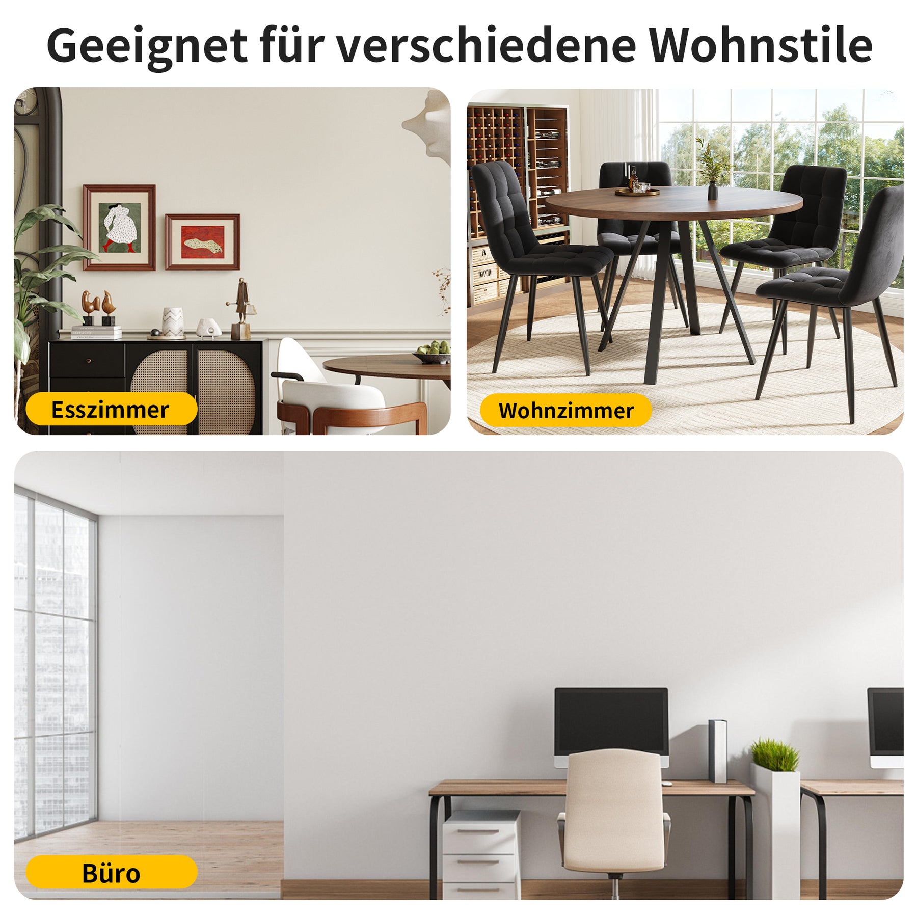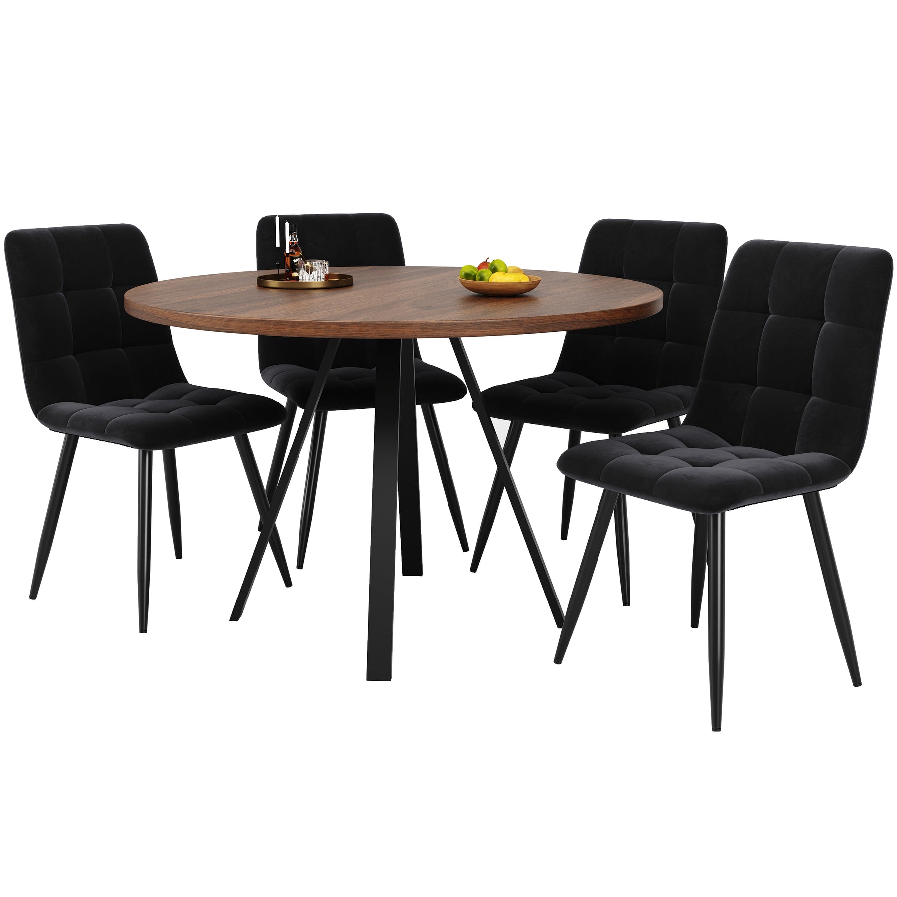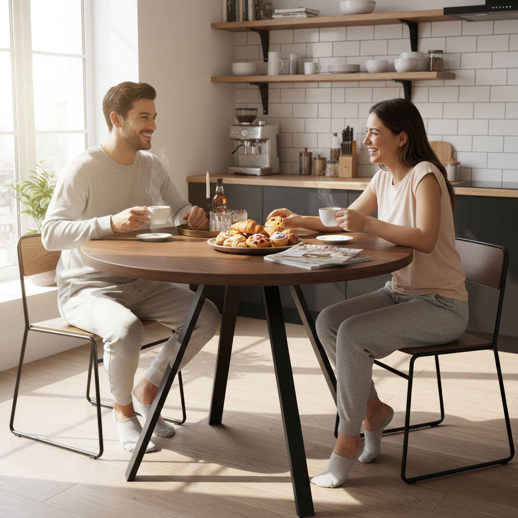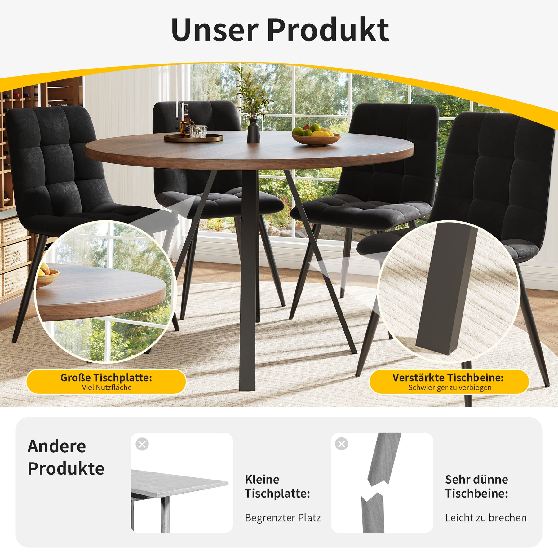 - Design rétro et élégant : La table ronde en finition noyer et pieds noirs s’intègre harmonieusement dans tous les styles d’intérieur, apportant une note sophistiquée et chaleureuse à votre espace.