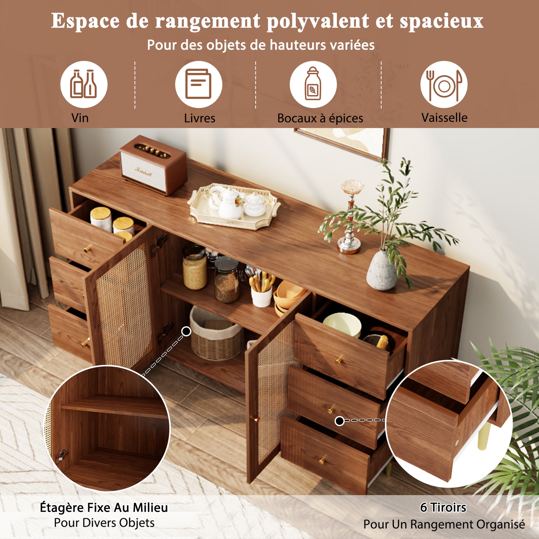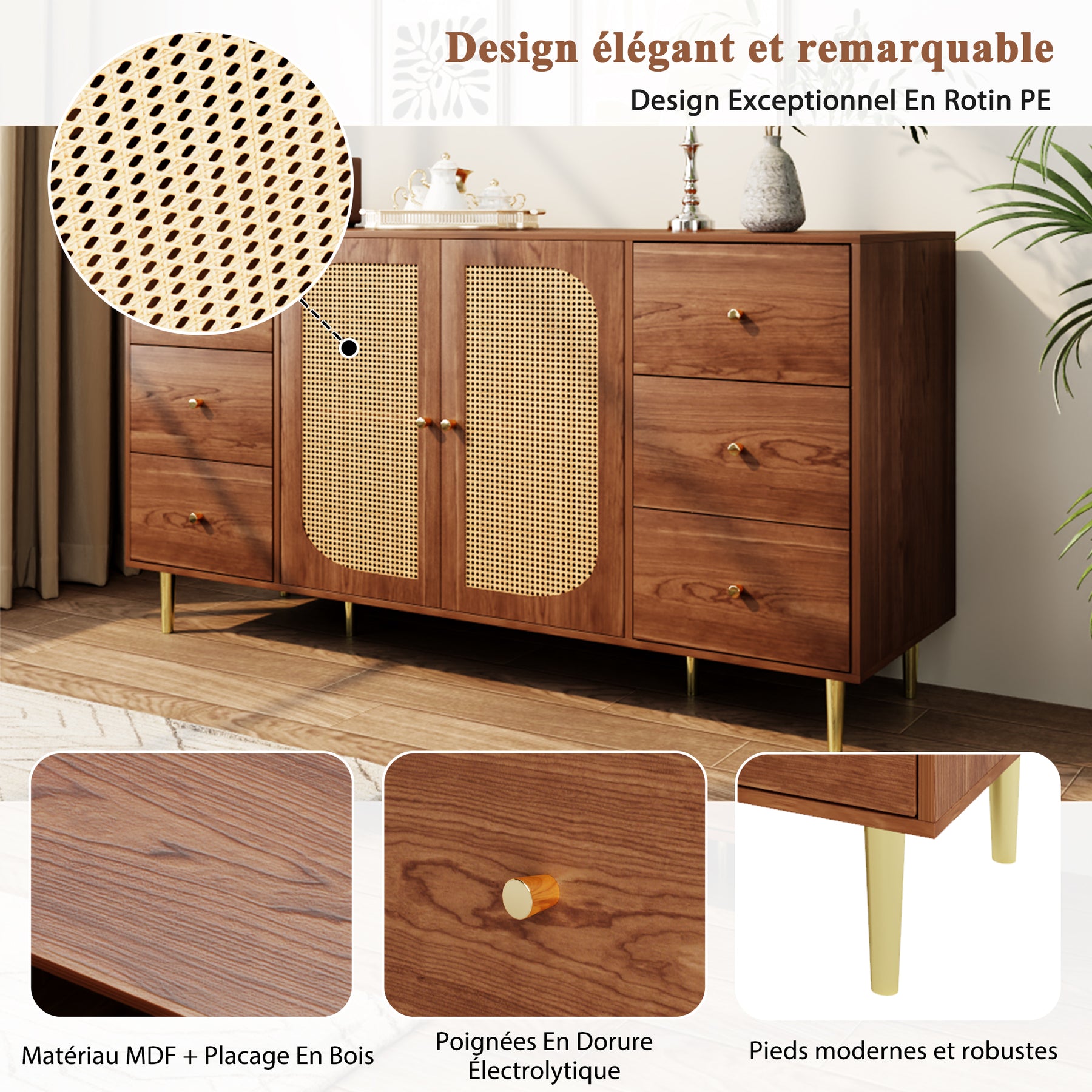 • Design moderne et élégant : L’association du bois MDF de haute densité et du rotin naturel tressé à la main apporte une touche contemporaine et chaleureuse à votre décoration. Ce buffet s’intègre harmonieusement dans tous les styles d’intérieur, du scandinave au bohème chic.