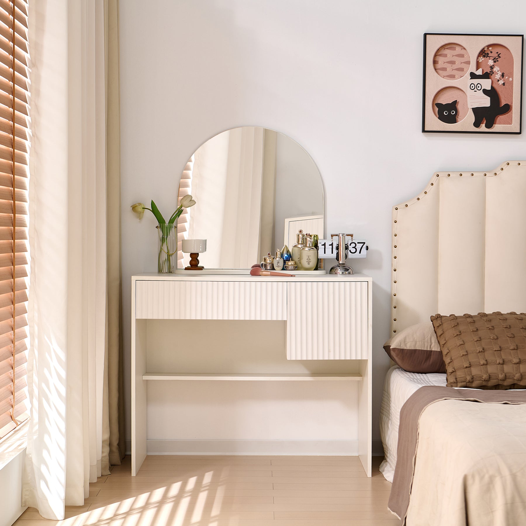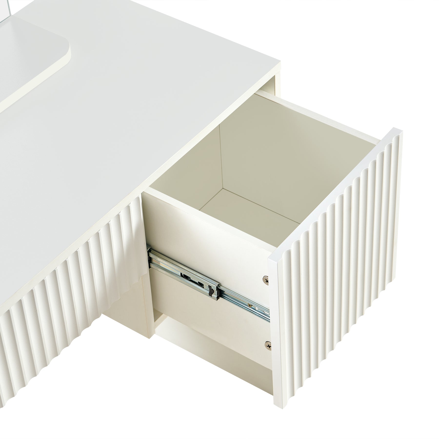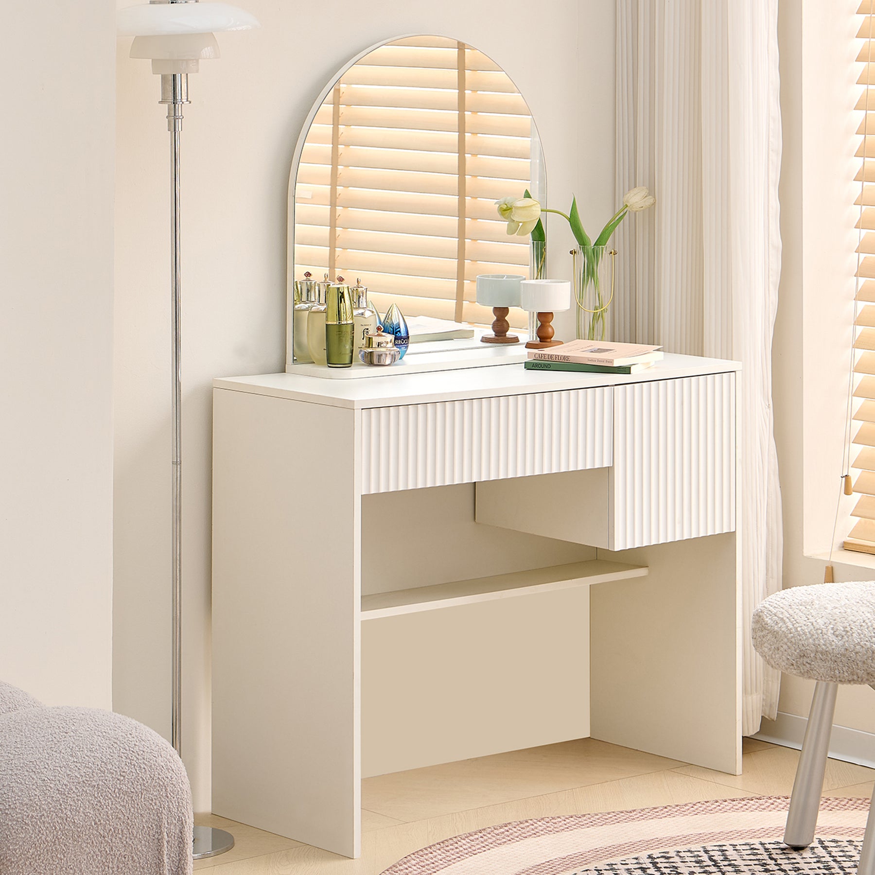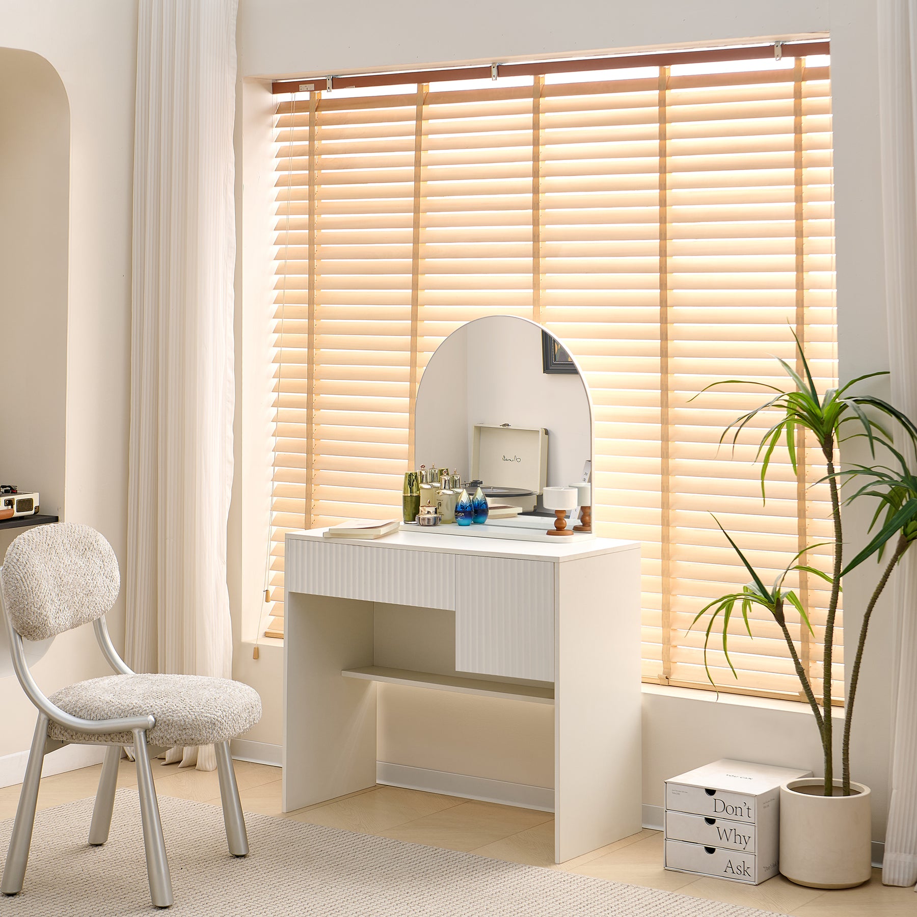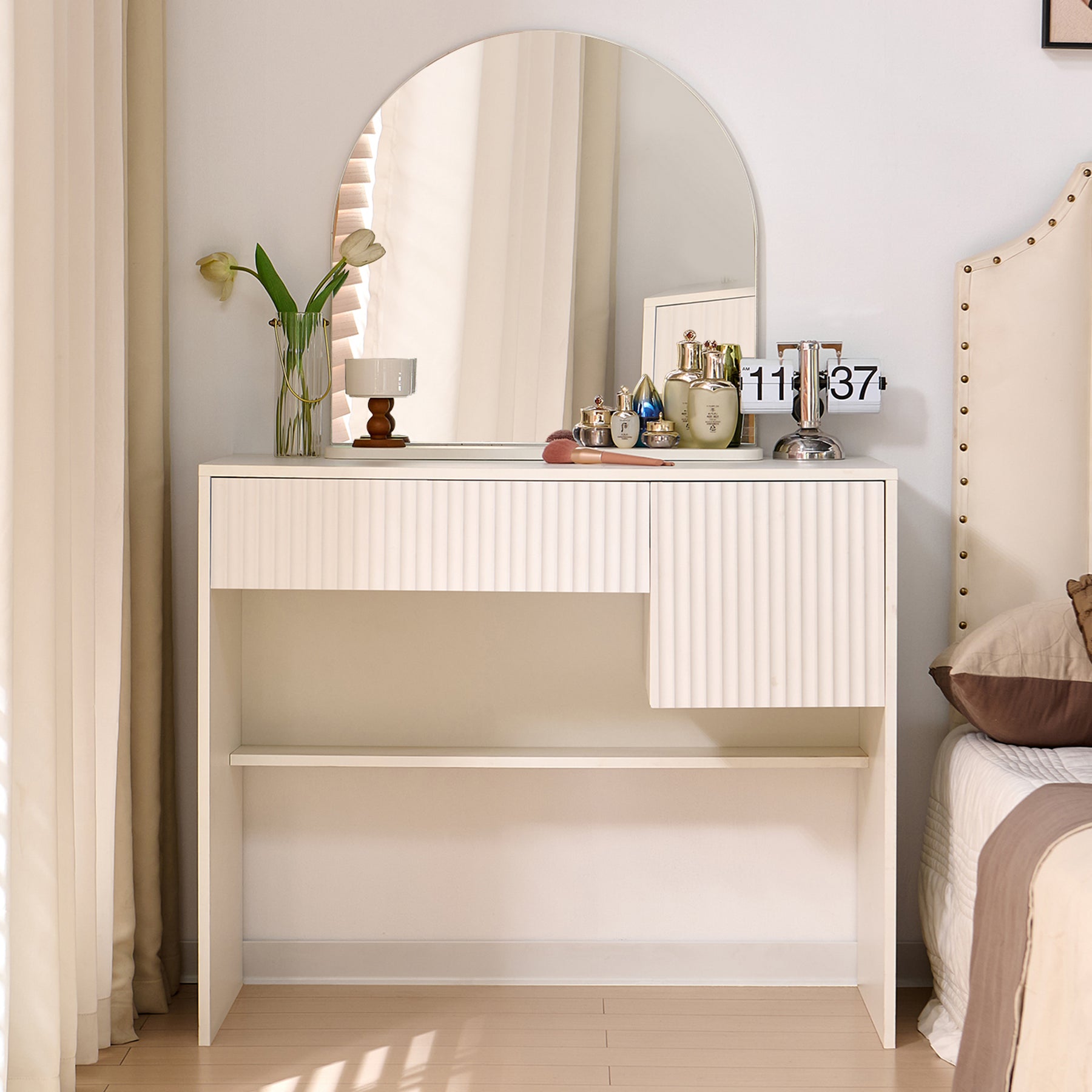 • Rangements optimisés : Deux tiroirs spacieux, dont un avec séparateurs intégrés, et des étagères ouvertes pour organiser facilement cosmétiques, soins et accessoires.